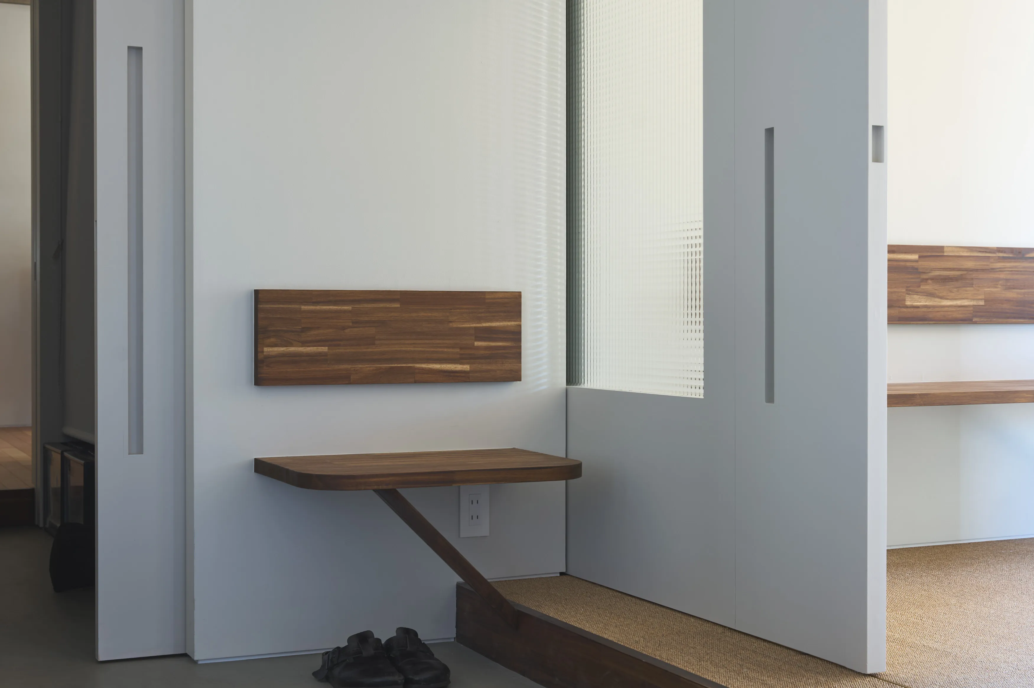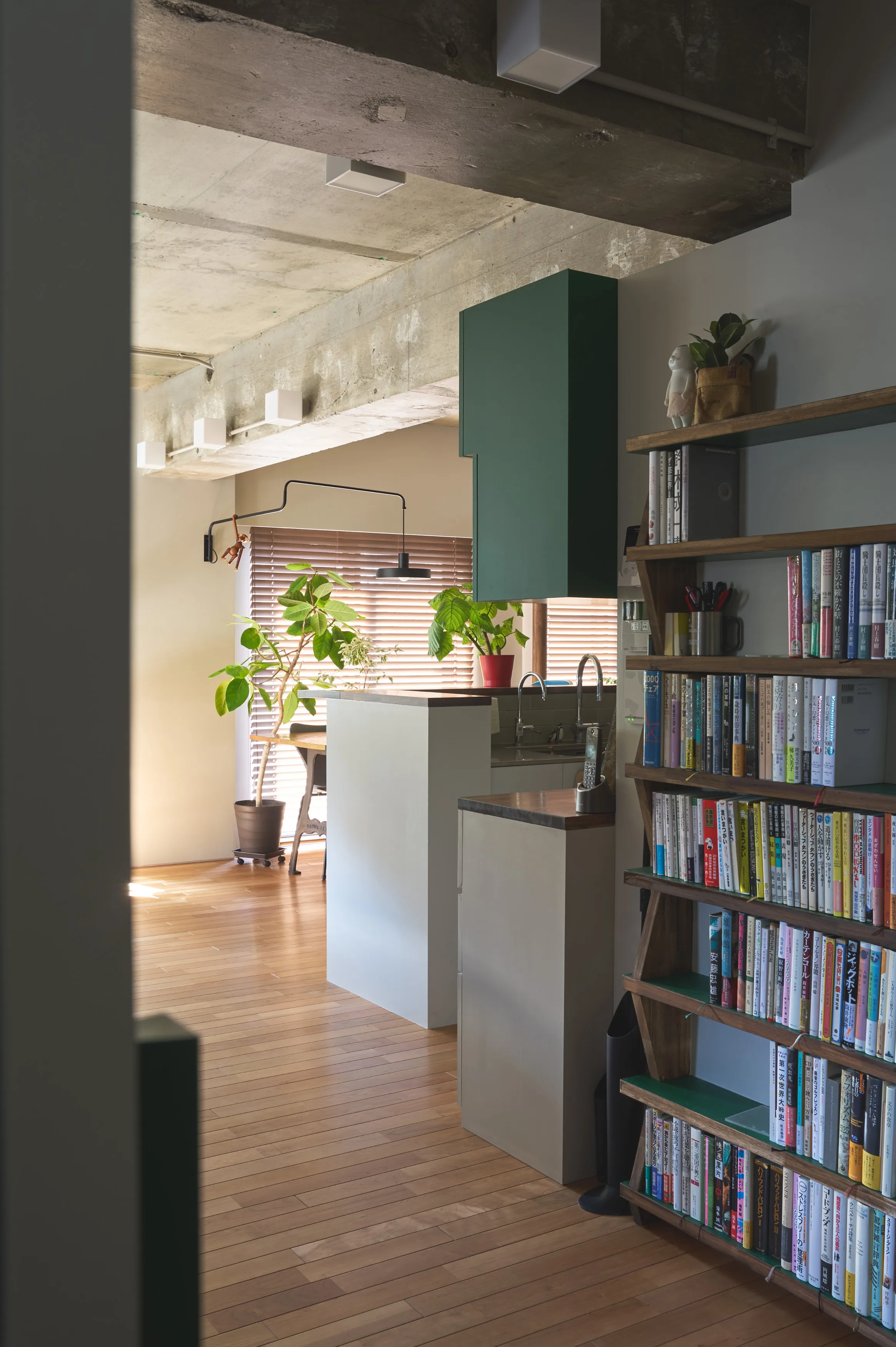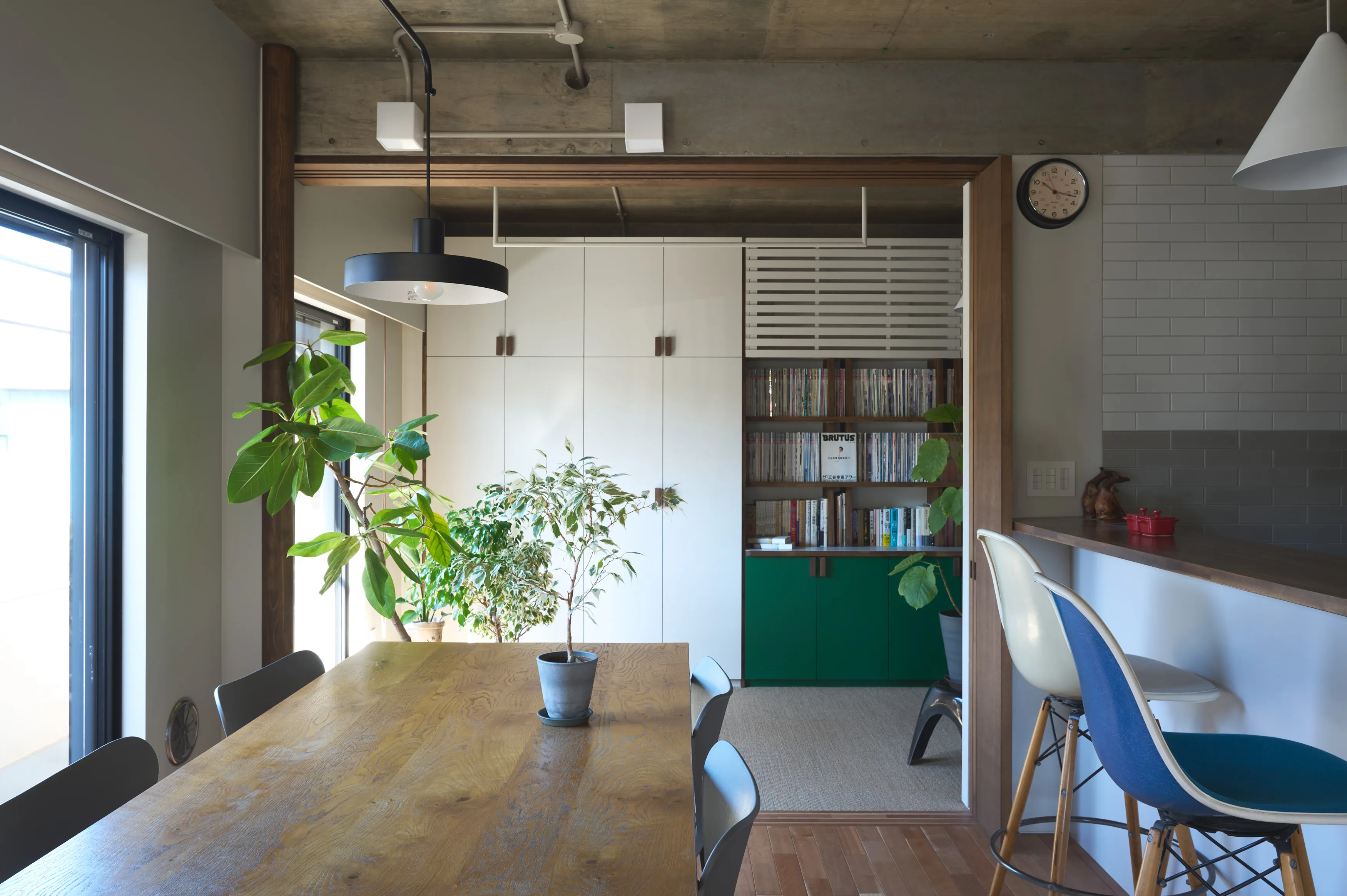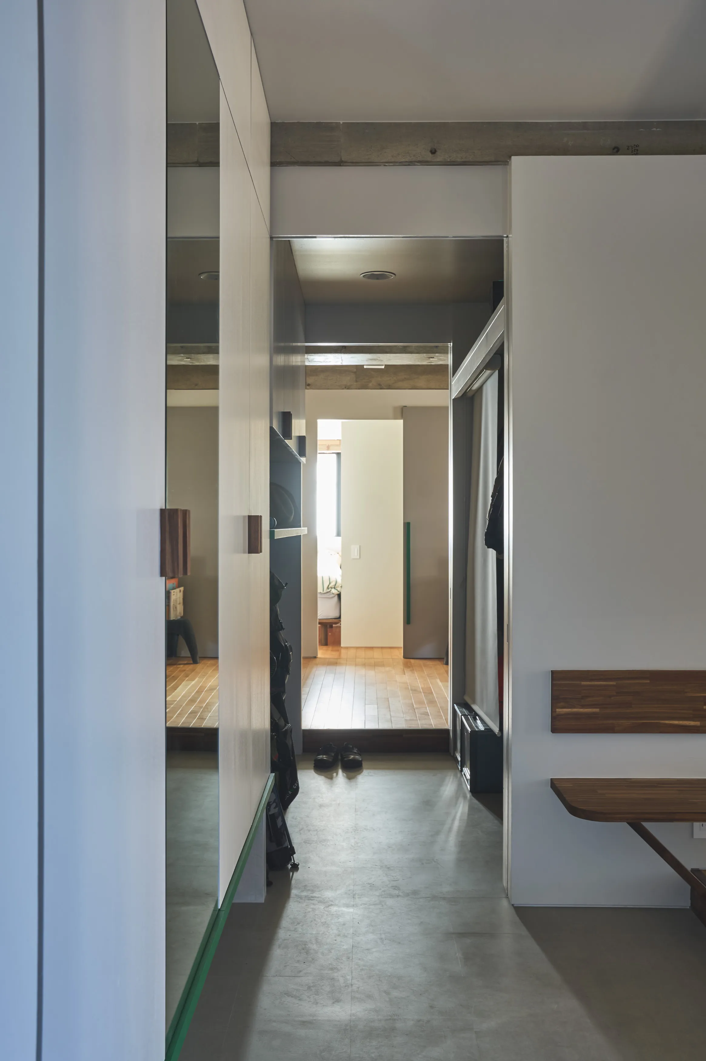 子どもたちの自立をきっかけとしたマンションの一室のリノベーション。この部屋の中央には、コンクリートの柱と上階の居室の配管スペースが貫いている。ここを中心に外へ向かって、壁や部屋を横断するように梁が伸びている。こうした事象の要因のひとつが、ここが賃貸マンションのオーナー住居であるため居室2つ分を占めていることである。部屋のインナーテラスや柱型によってできる変形した内部空間、サッシに重なる梁など、ほかにもいくつかのズレを内包している。そこに新しく加わる間仕切り、建具や造作においても、凸凹や雁行形状、色や素材によるコントラストなどを用いて、意識的にまじりけのある空間を設計した。