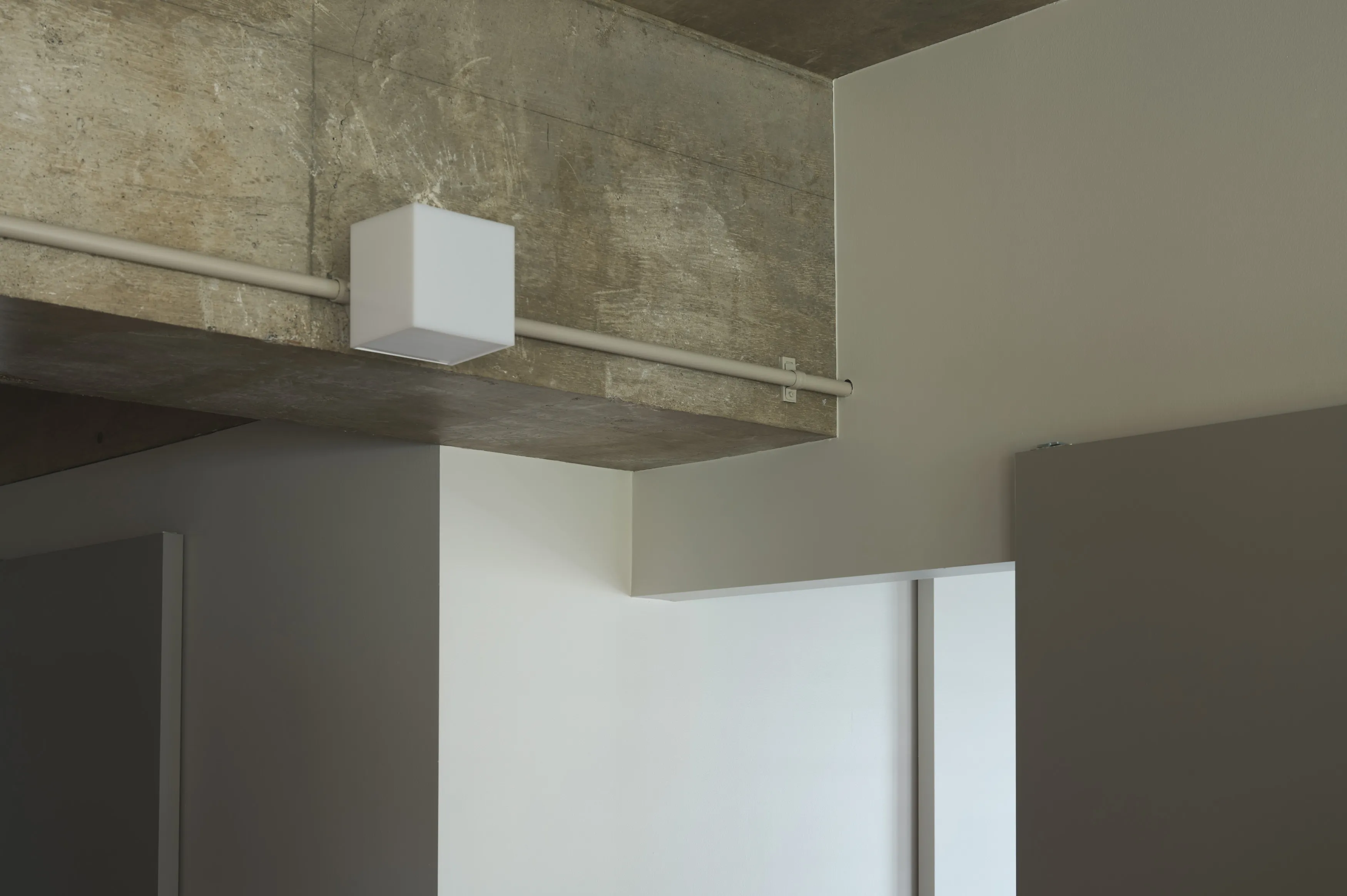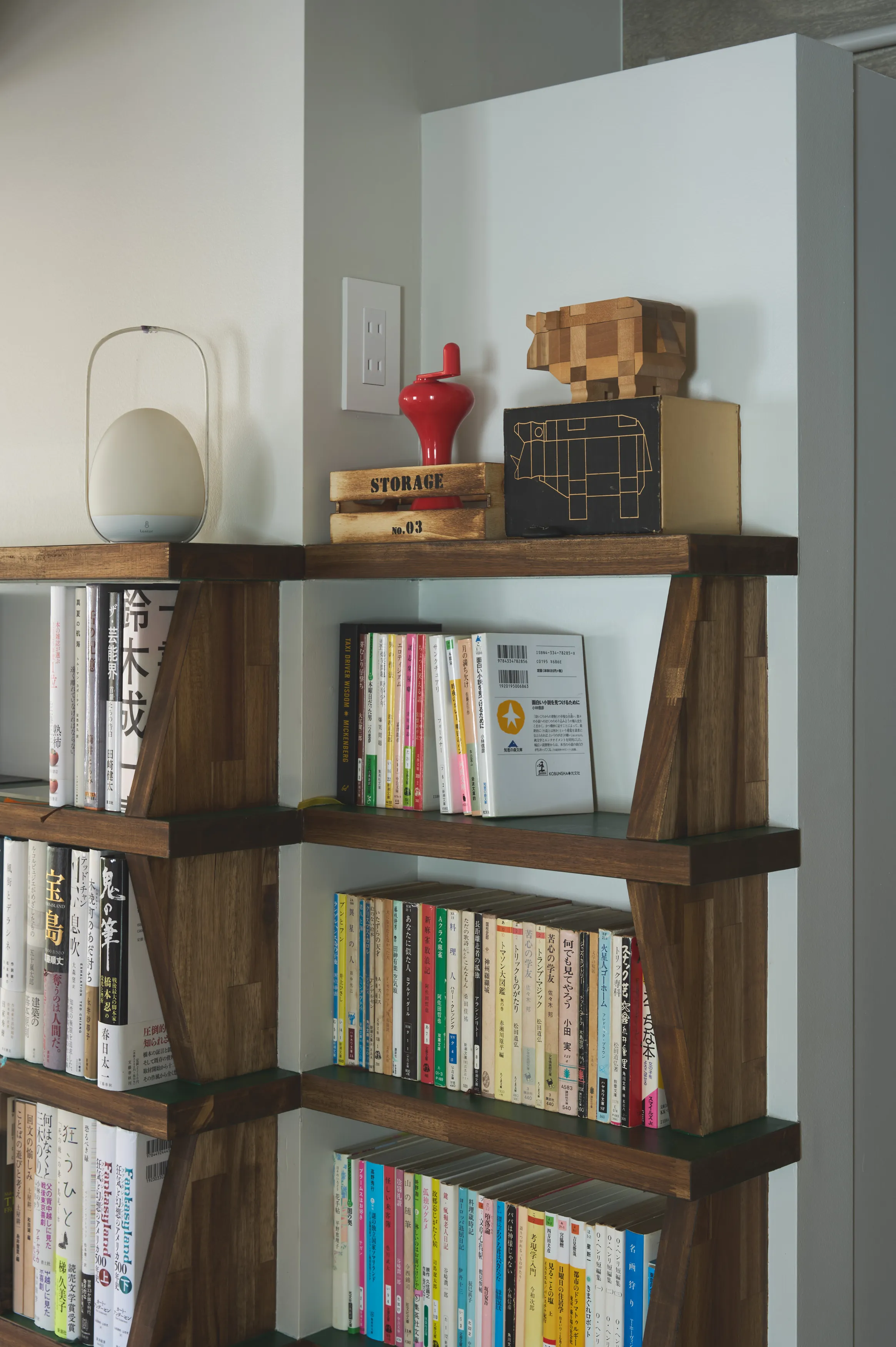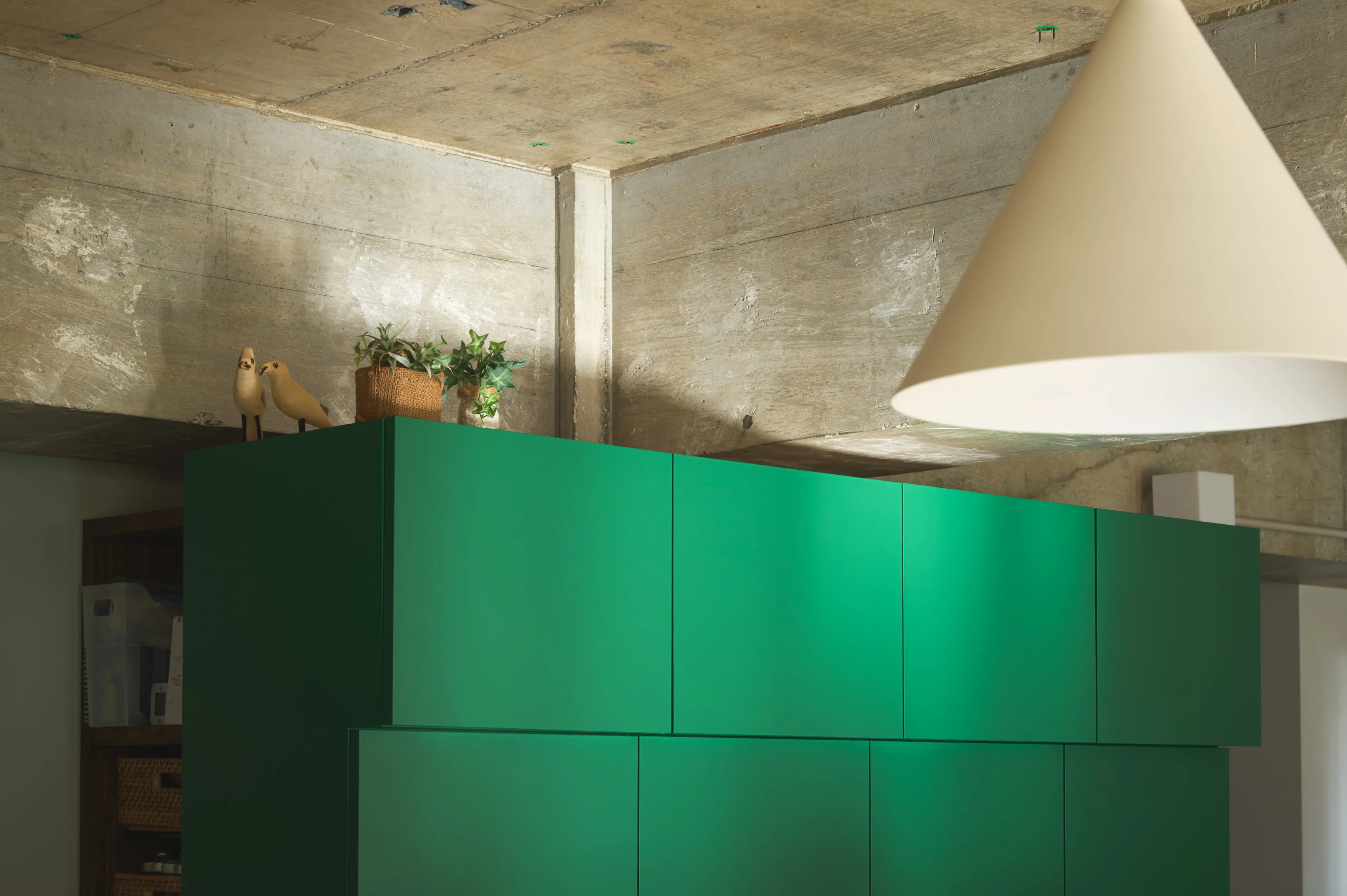 子どもたちの自立をきっかけとしたマンションの一室のリノベーション。この部屋の中央には、コンクリートの柱と上階の居室の配管スペースが貫いている。ここを中心に外へ向かって、壁や部屋を横断するように梁が伸びている。こうした事象の要因のひとつが、ここが賃貸マンションのオーナー住居であるため居室2つ分を占めていることである。部屋のインナーテラスや柱型によってできる変形した内部空間、サッシに重なる梁など、ほかにもいくつかのズレを内包している。そこに新しく加わる間仕切り、建具や造作においても、凸凹や雁行形状、色や素材によるコントラストなどを用いて、意識的にまじりけのある空間を設計した。