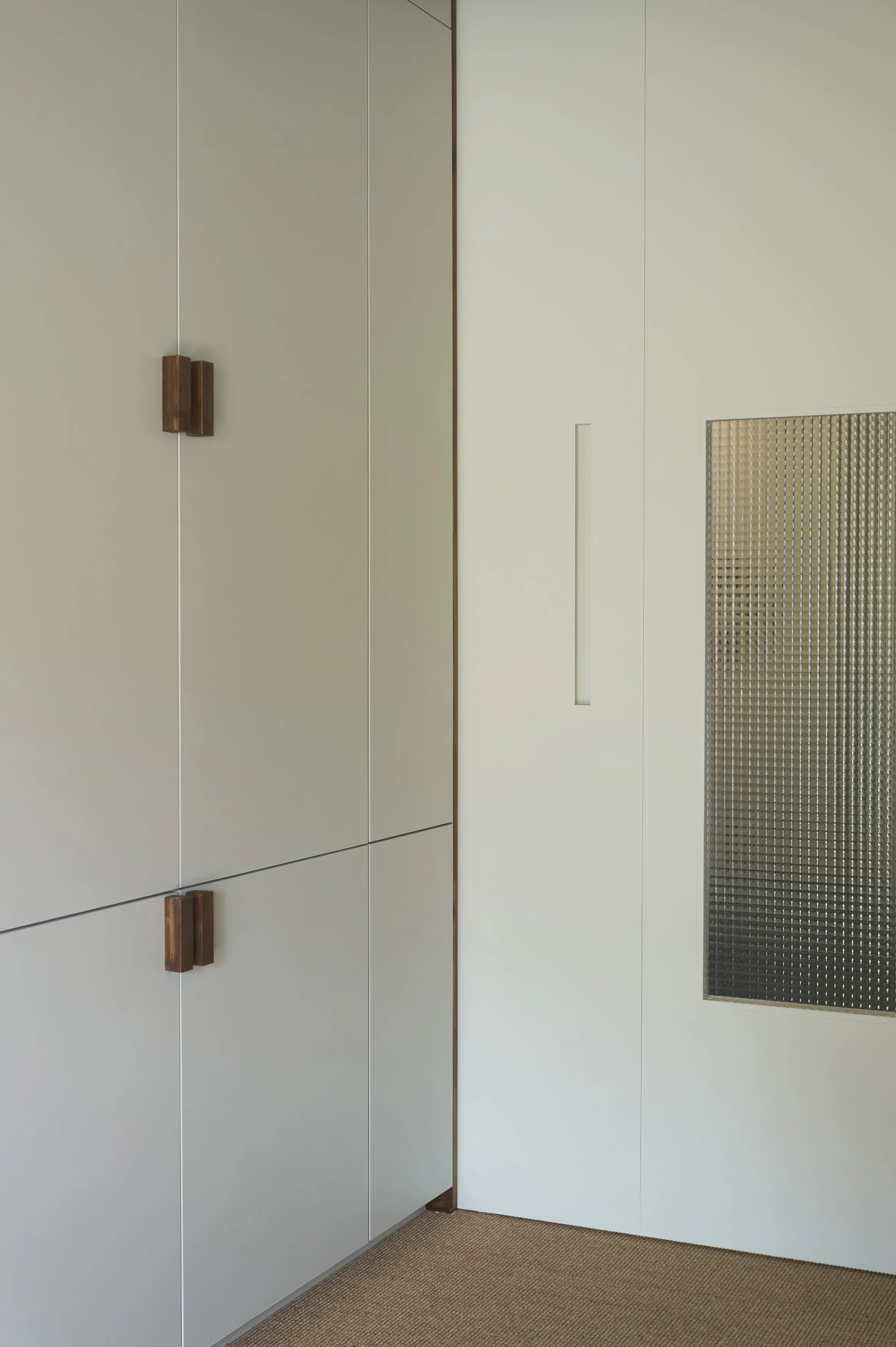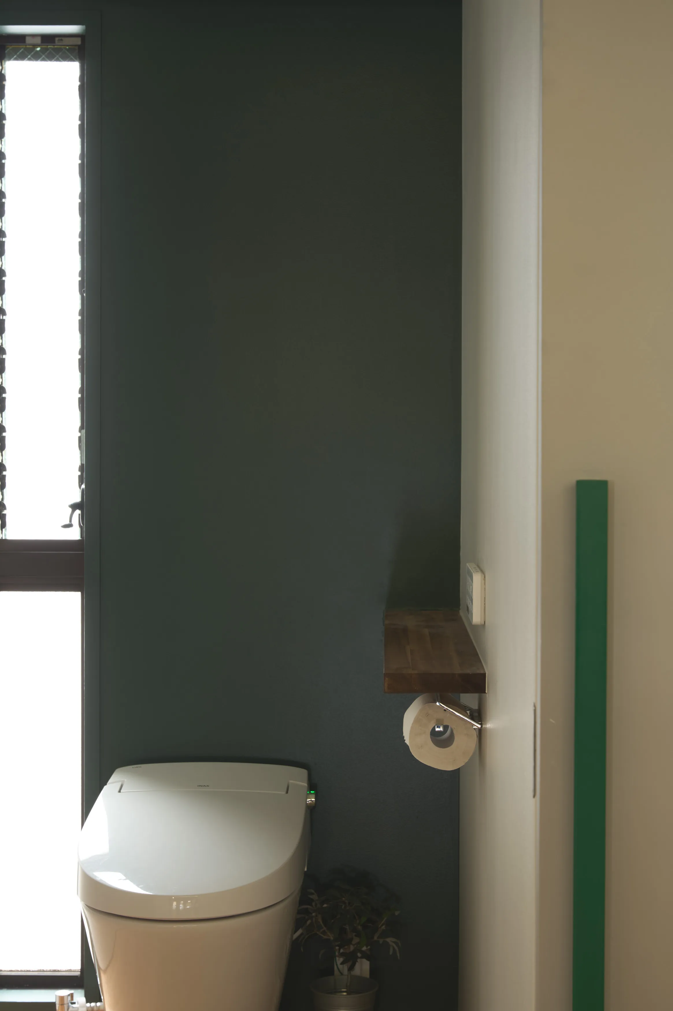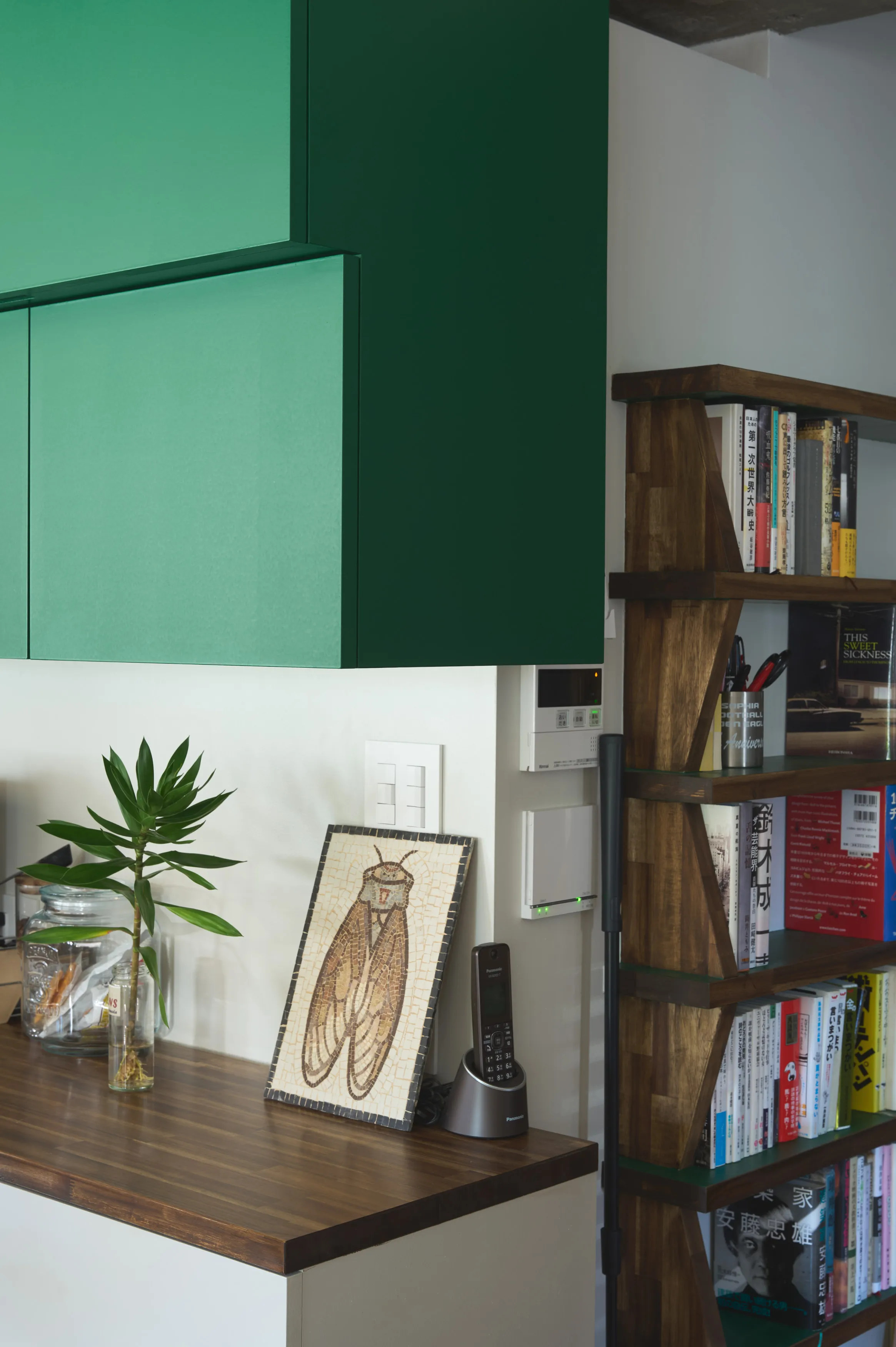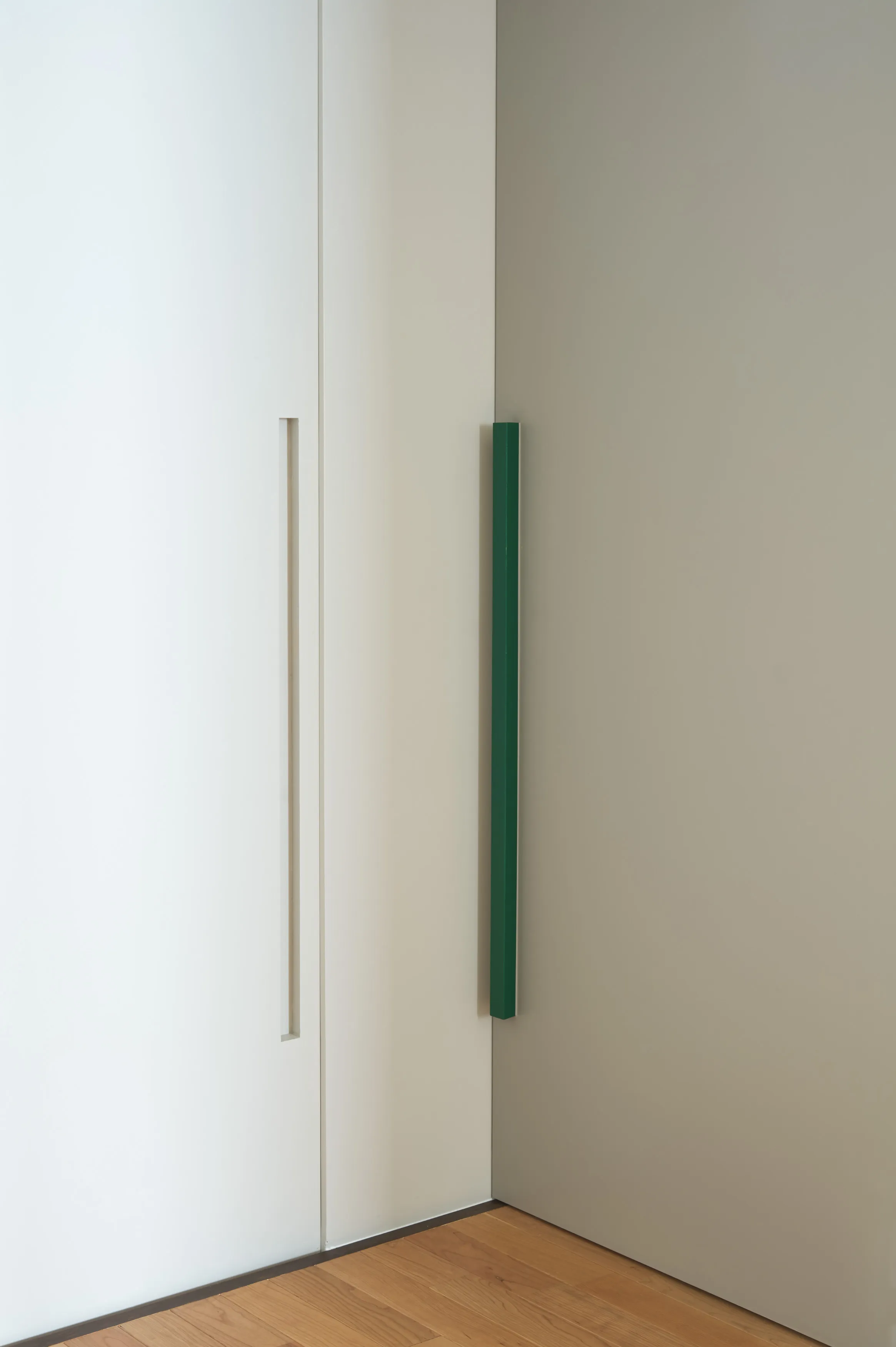 子どもたちの自立をきっかけとしたマンションの一室のリノベーション。この部屋の中央には、コンクリートの柱と上階の居室の配管スペースが貫いている。ここを中心に外へ向かって、壁や部屋を横断するように梁が伸びている。こうした事象の要因のひとつが、ここが賃貸マンションのオーナー住居であるため居室2つ分を占めていることである。部屋のインナーテラスや柱型によってできる変形した内部空間、サッシに重なる梁など、ほかにもいくつかのズレを内包している。そこに新しく加わる間仕切り、建具や造作においても、凸凹や雁行形状、色や素材によるコントラストなどを用いて、意識的にまじりけのある空間を設計した。
