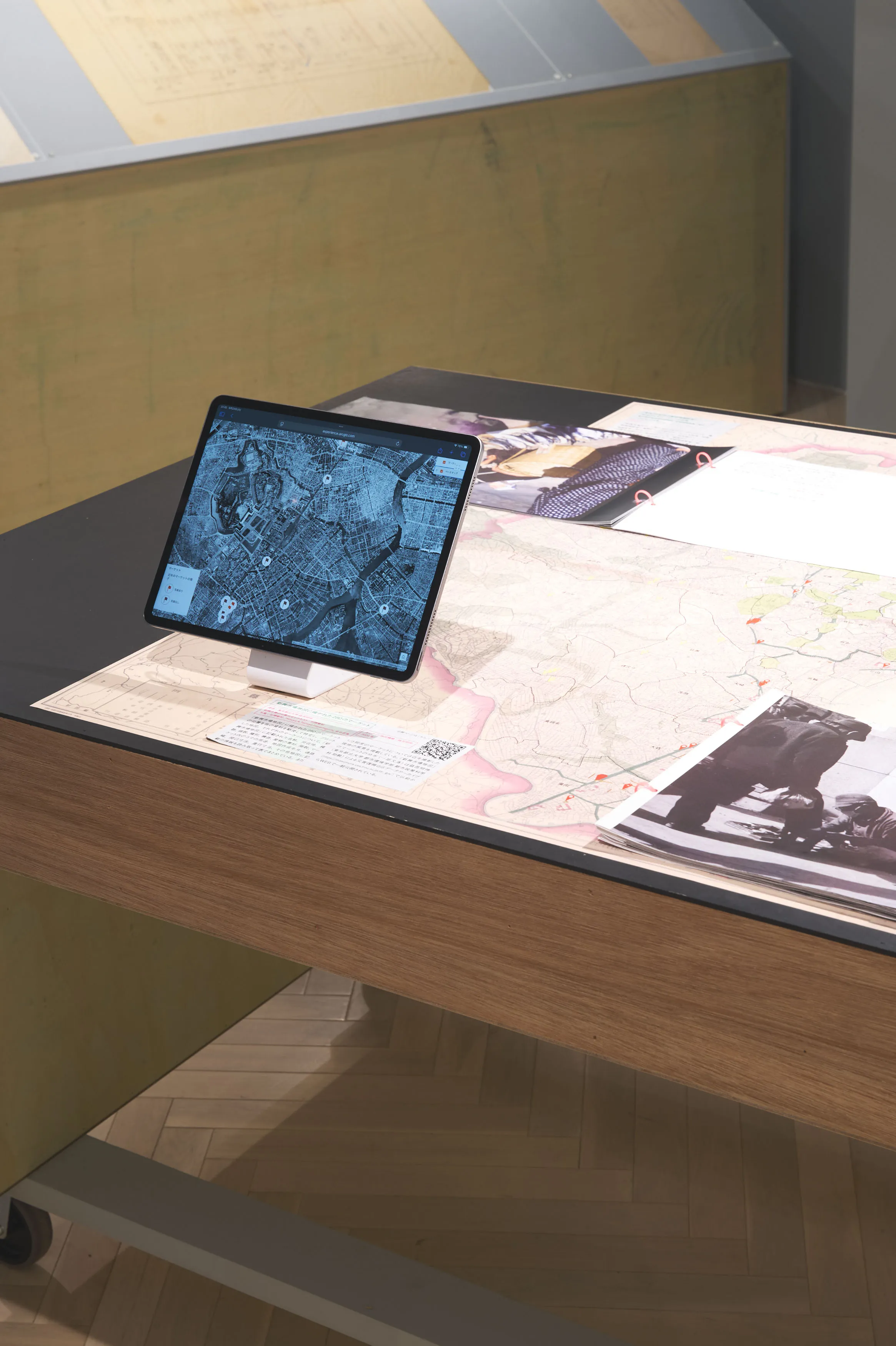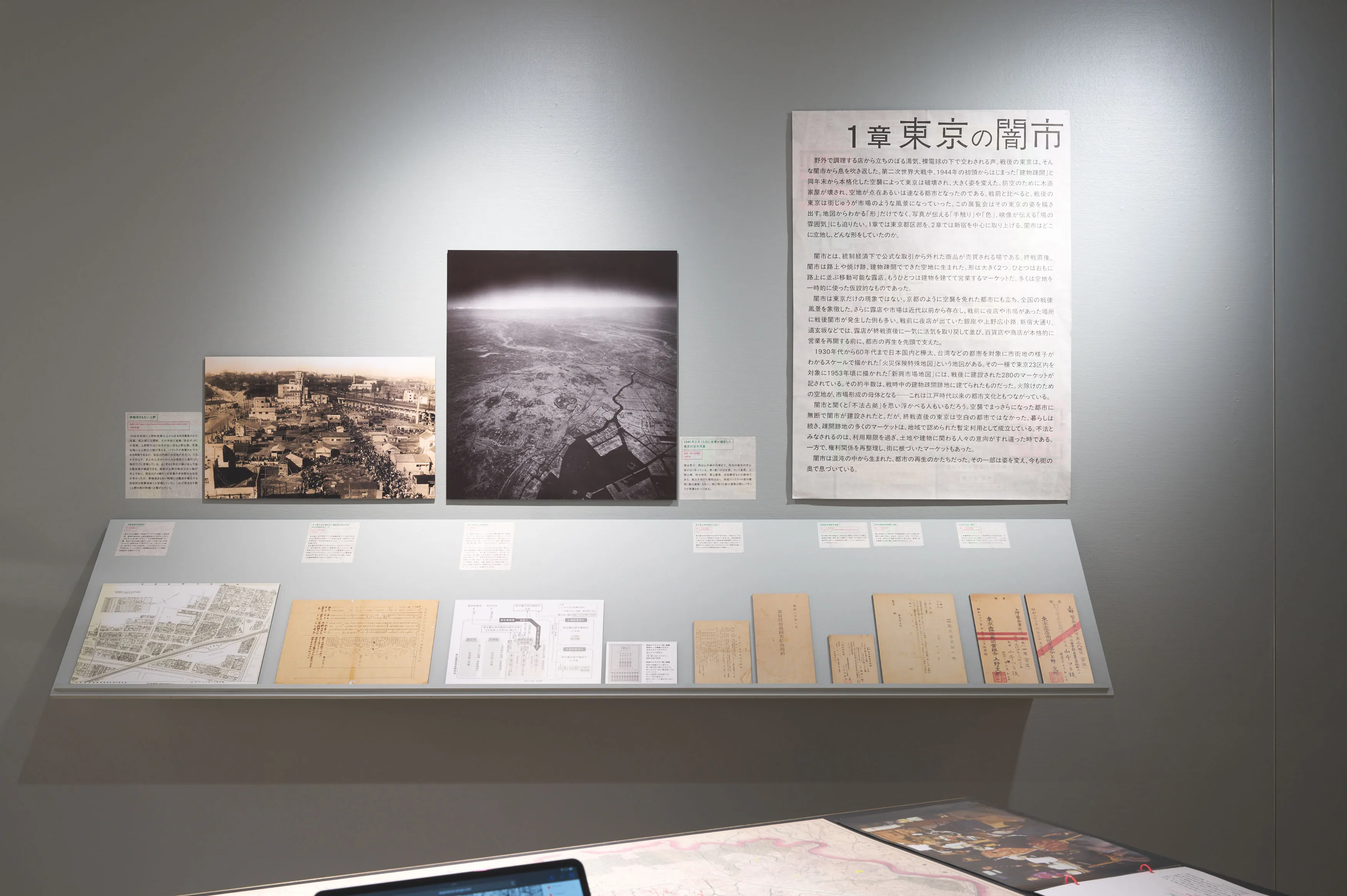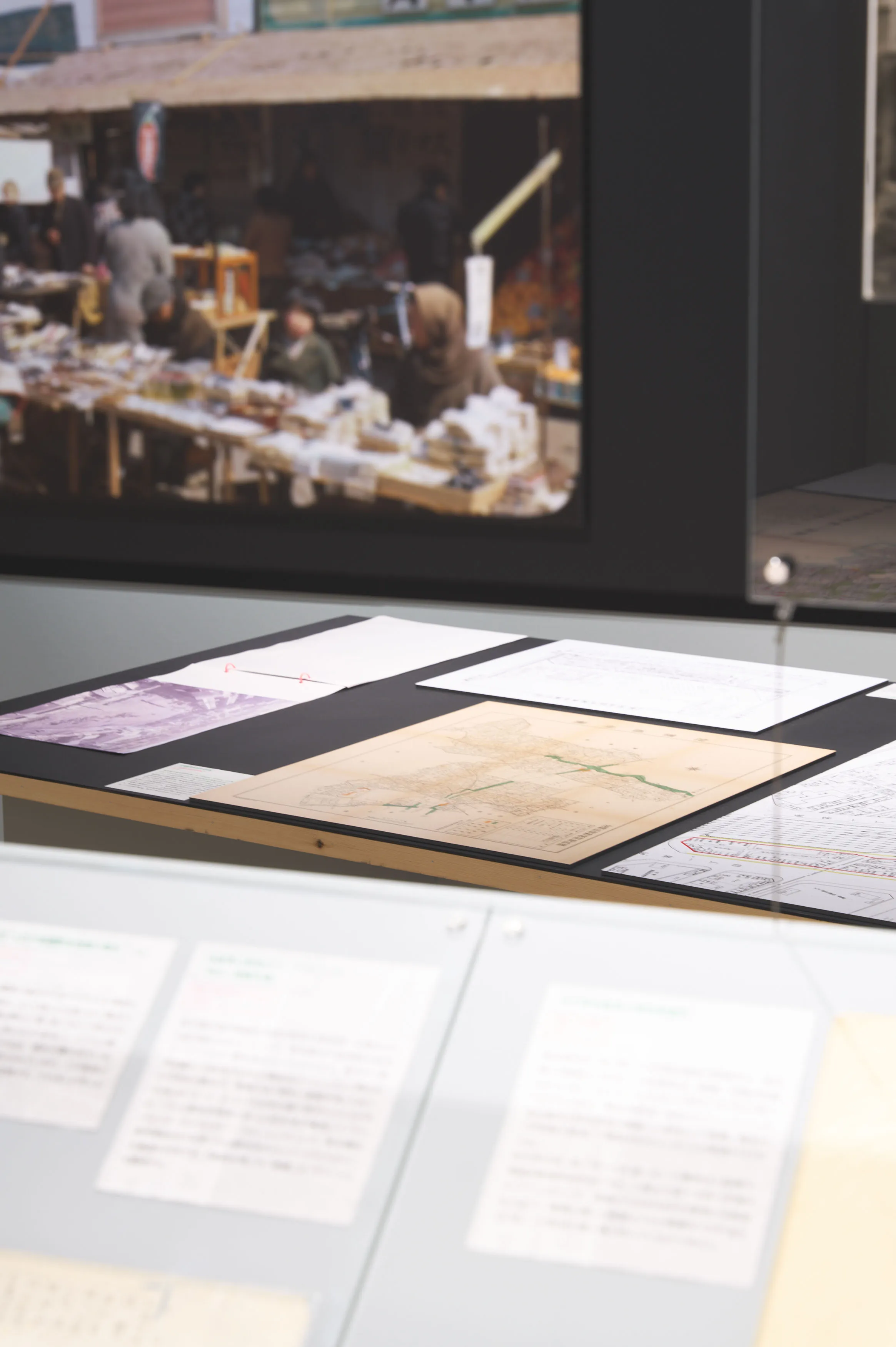 戦後闇市の持つ「不法占拠」というイメージを、大きな地図や当時のカラー写真などによって、必然の産物として描きなおして現在の都市空間と紐付ける内容。さまざまな形式のメディウムをフラットに並べることで浮かび上がる事物の関係性を、角度の異なる什器によって、鑑賞者が主体的に情報を結びつけることを目指した。