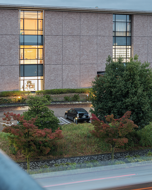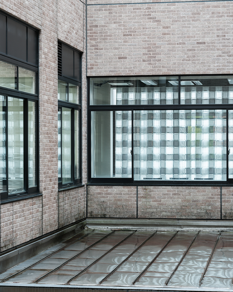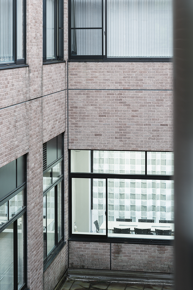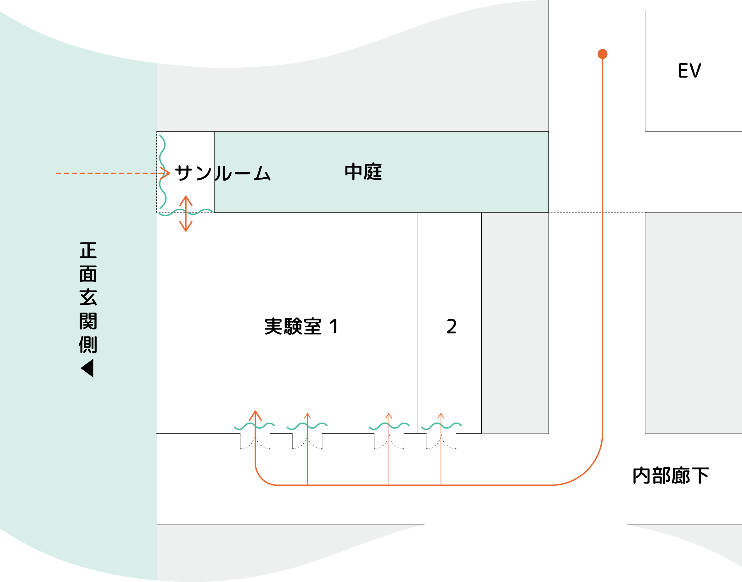 この建物は、 キャンパスの中央のシンボリックな場所に位置し、実験室は正面玄関の直上にあり、 正面玄関と内部廊下、 採光のための中庭に対して開口部のあるL字型をしている。 その部屋の正面玄関側と内部廊下に対して、それぞれ性能(遮光/目隠し)は異なるがカーテンのよ うなものが求められ、 同じく外部 (正面玄関/廊下) に対するファサードと捉えて計画を行なった。