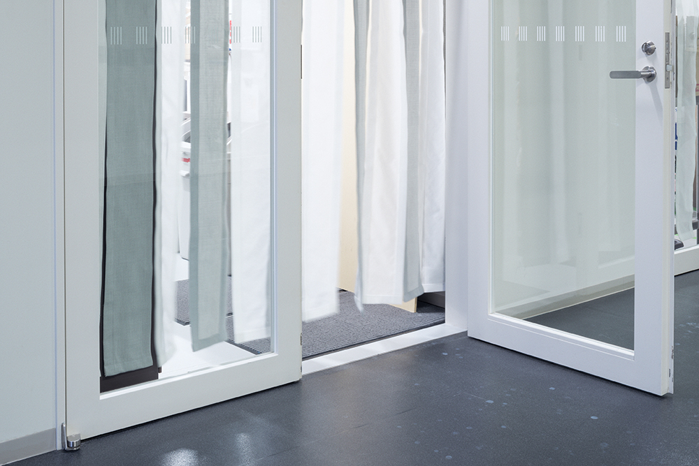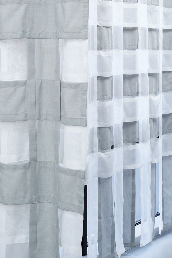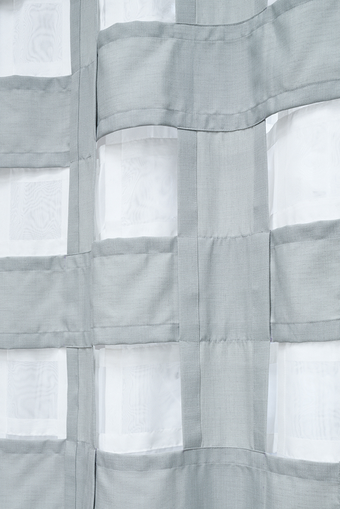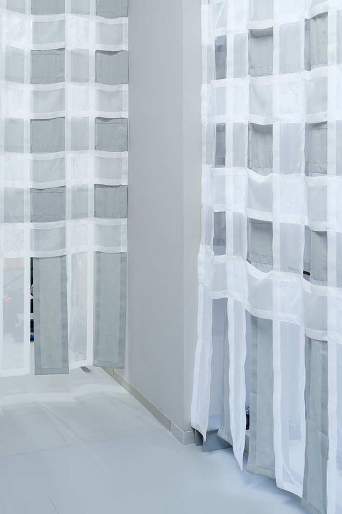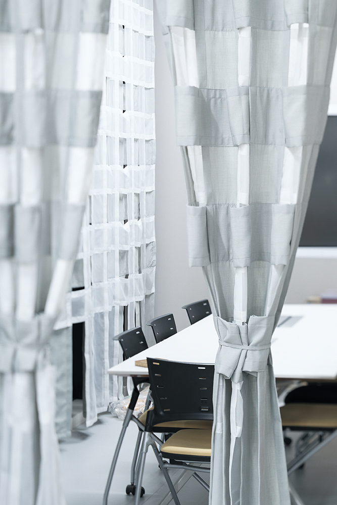 経糸と緯糸で2色の布を織り混ぜる方法 (組織) を用いて、 ギンガムチェックのように3種類の透過度の異なるセルの集合として木漏れ日のような面をつくるカーテン とのれんのように先が分かれていて通行できるカーテンをつくった。また、正面玄関側に位置するサンルームの入り口には、格子模様とのれん双方の構成を組み合わせたカーテンを設け、空間の一体性を図った。 採用したペールグリーンは、 前実験室から持ち込まれたスチールラックのグリーンや第一部で選んだグレーとの協調を図る要素。