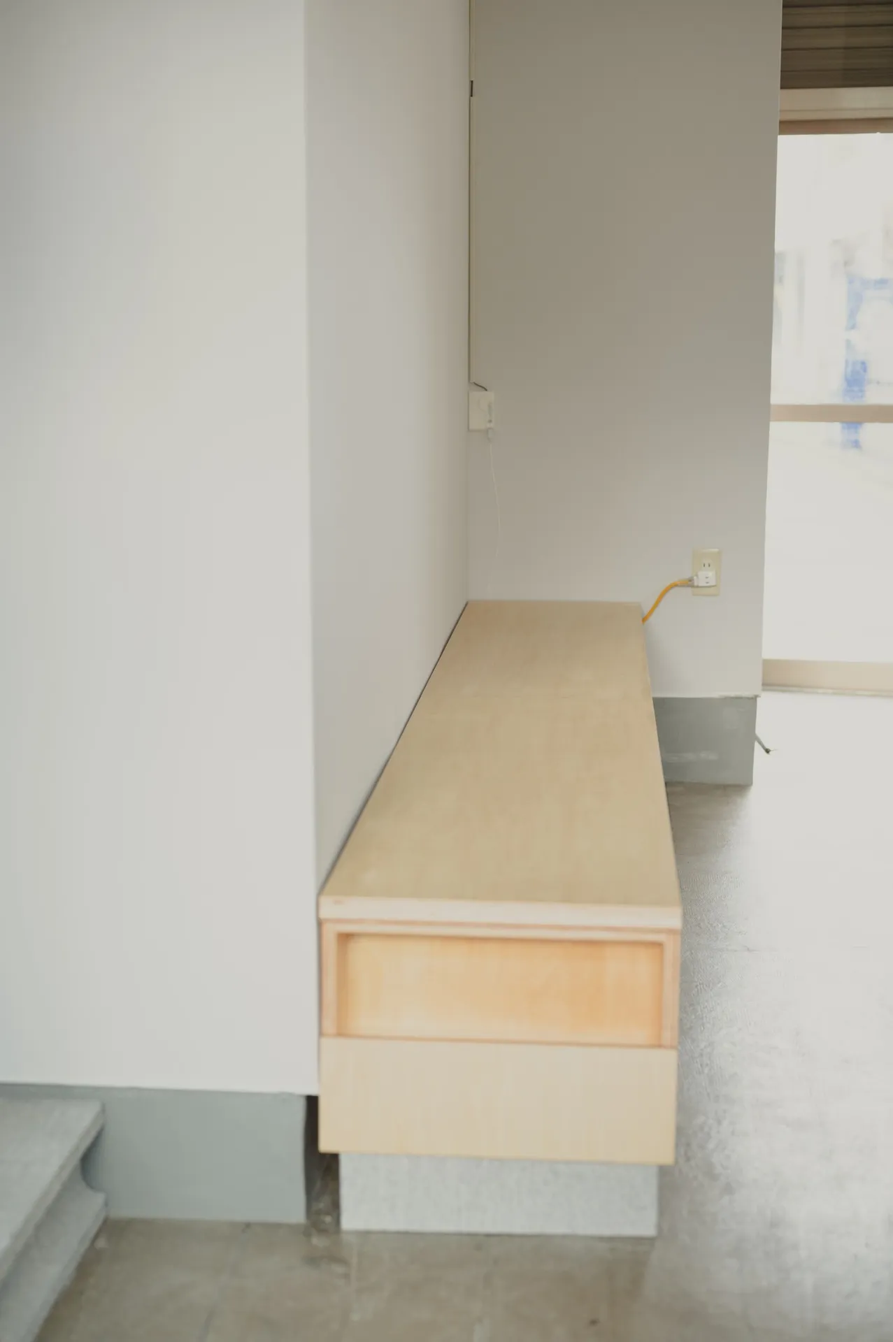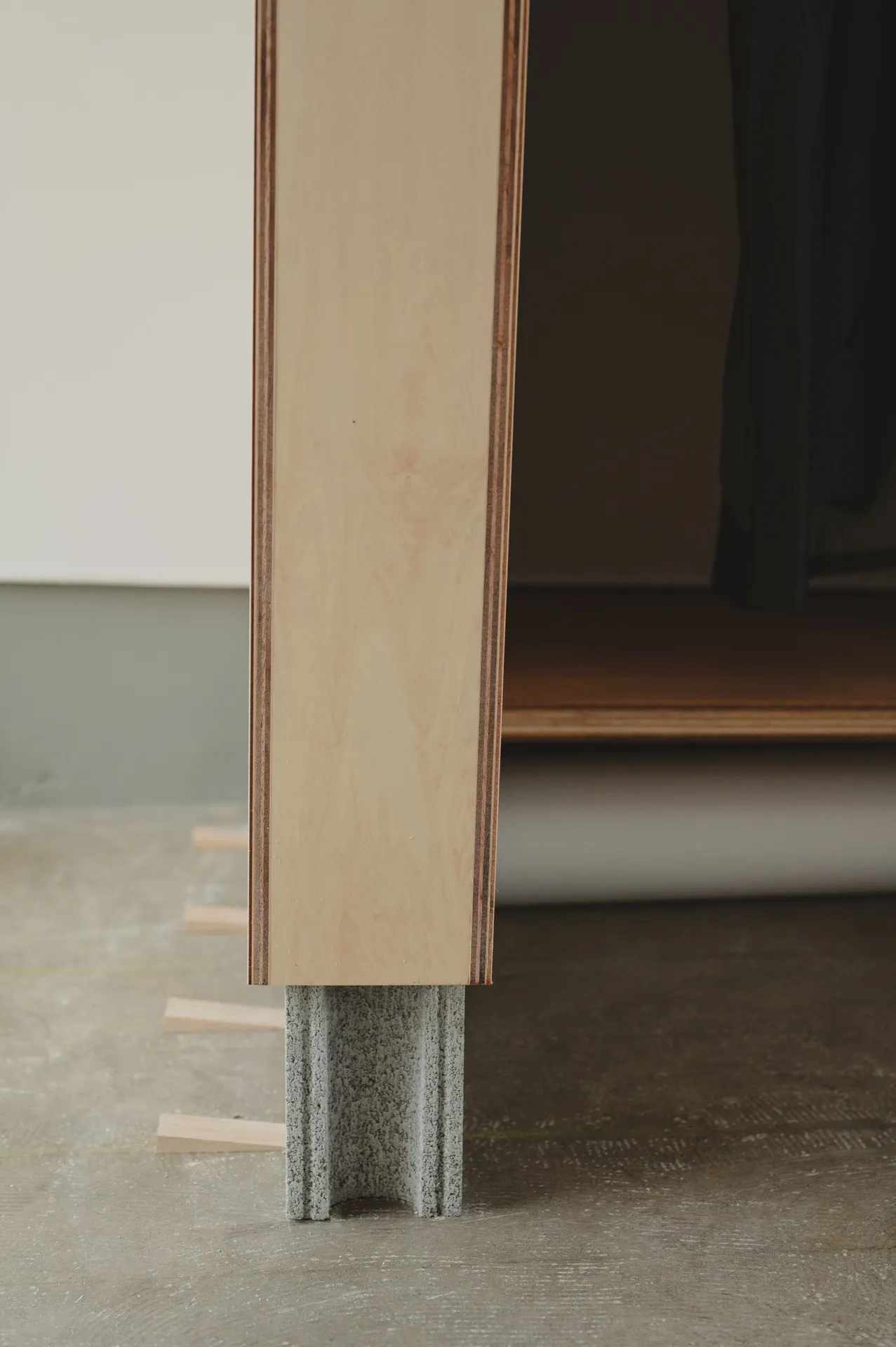 既存の床が傾いていたため、棚の高さを保つように、ブロックと木箱の間で高さを調節できる機構とし、手前は楔で固定した。