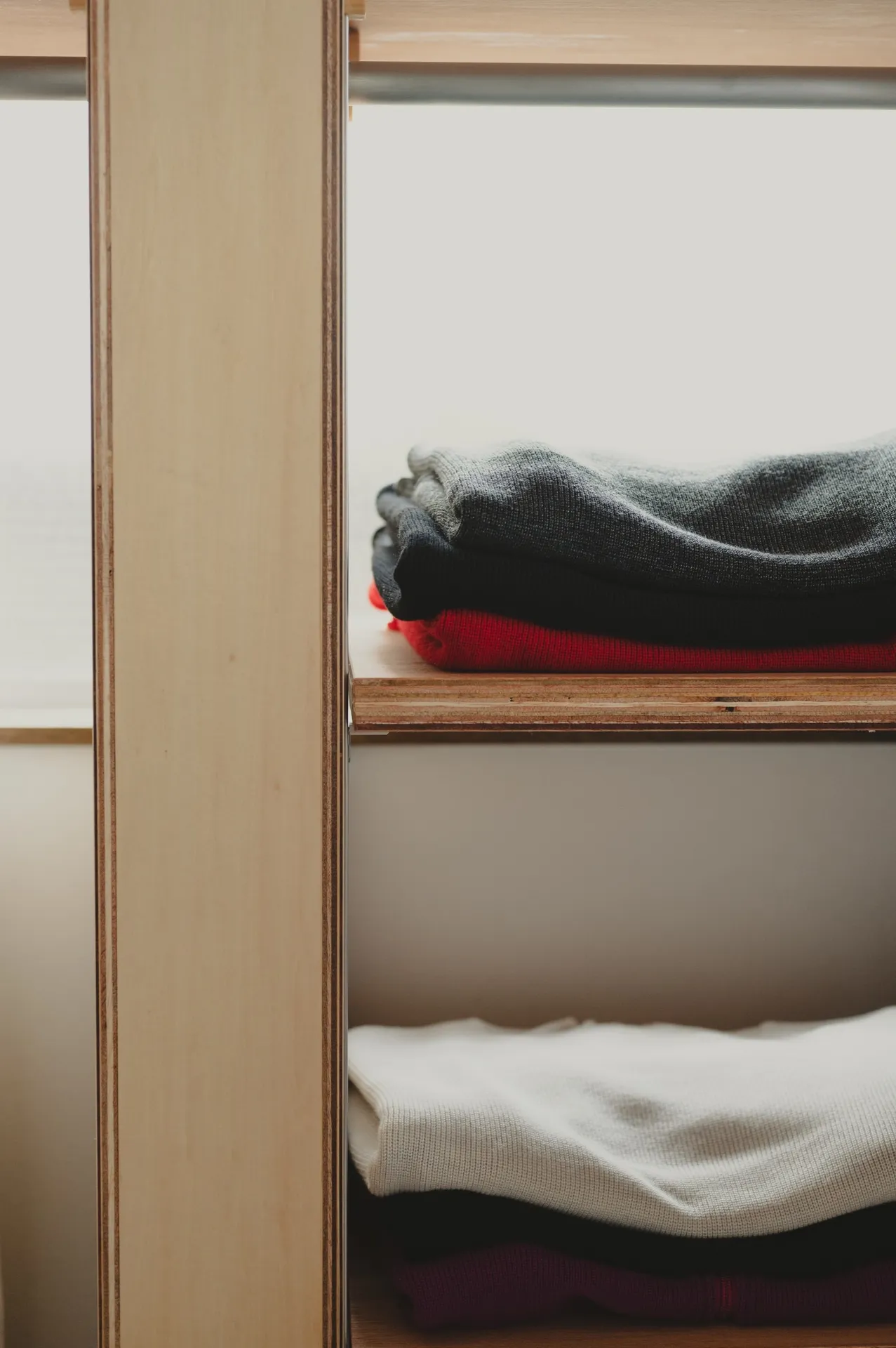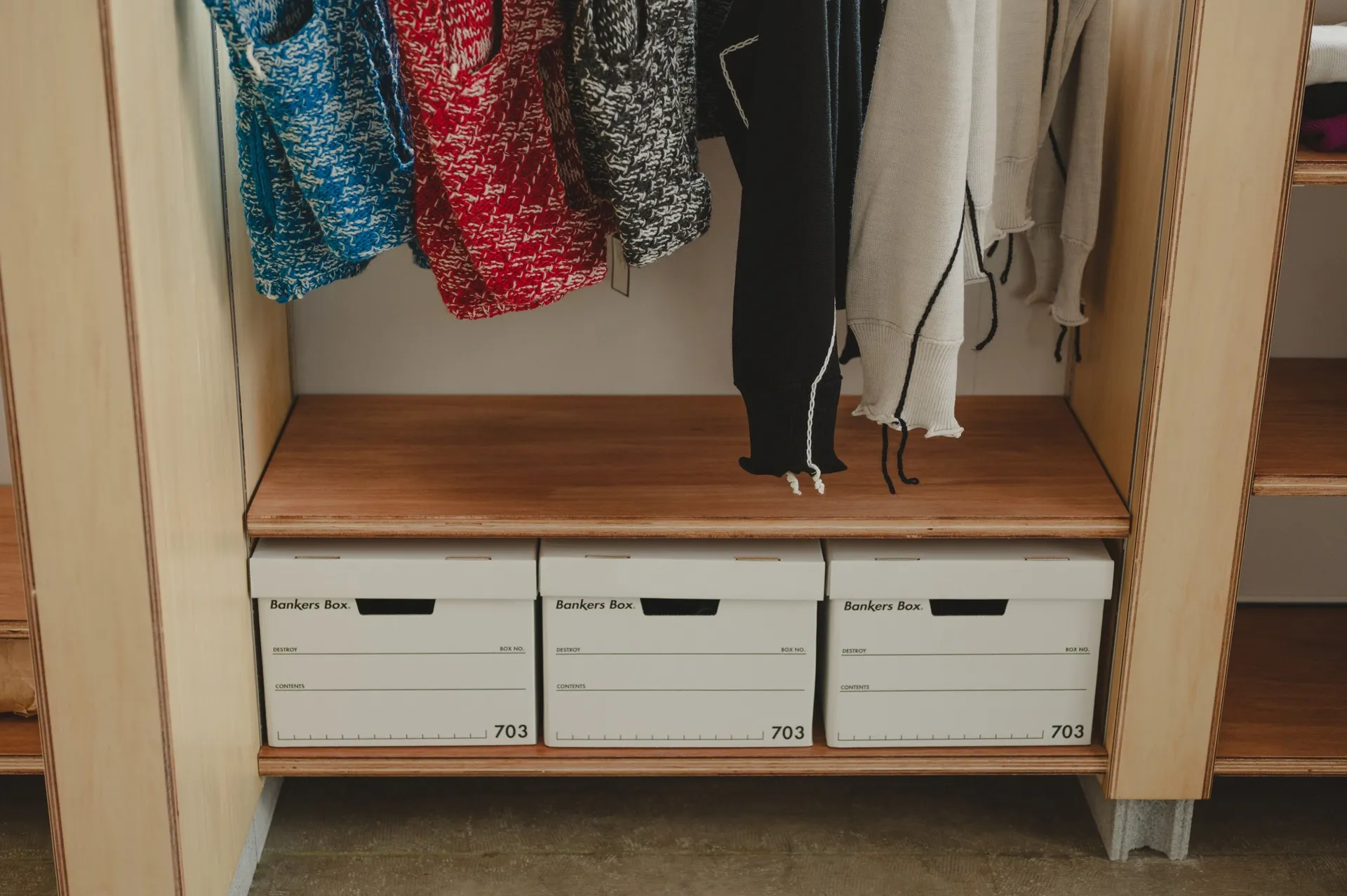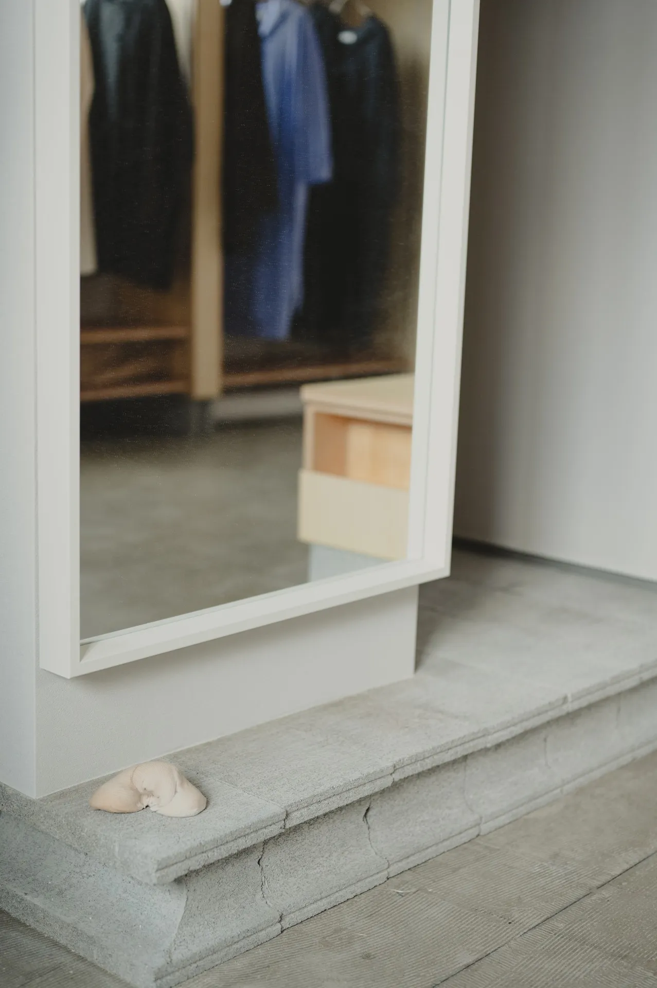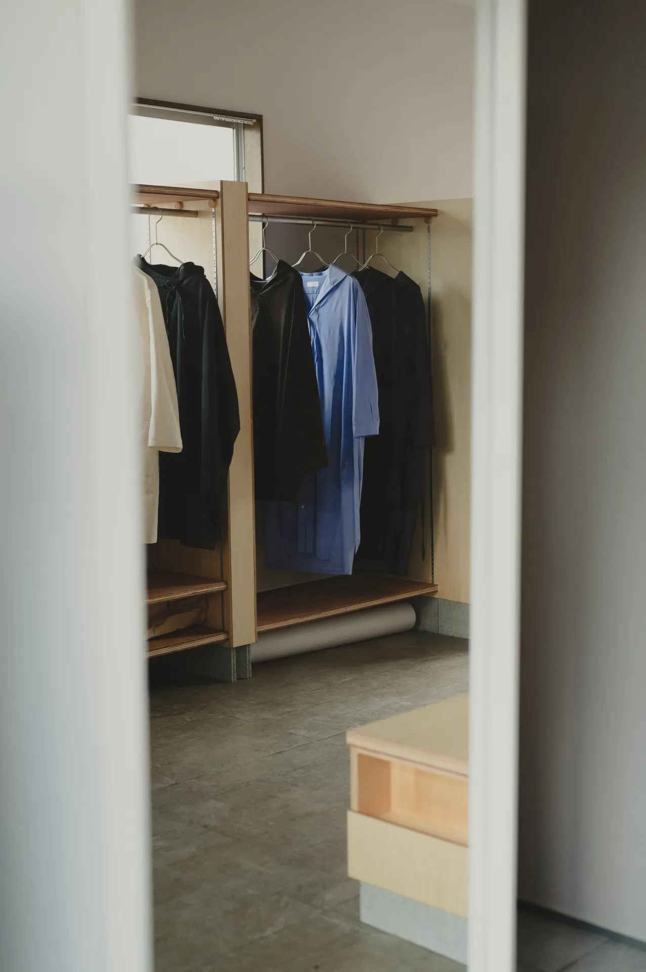 小さな商店街に面した店内に、目の前のT字路を引き込み、路肩に服やミシンを置いているような空間構成とした。初めてブランドとして場所を構え、「まずはここから始めてみる」というMETHOの姿勢に、ブロックや木箱を積む・並べるという即物的な造り方と抽象的な意匠により応えた。不定期でオープンアトリエやイベントを行っており、その時々で棚の中のレイアウトが変わる。