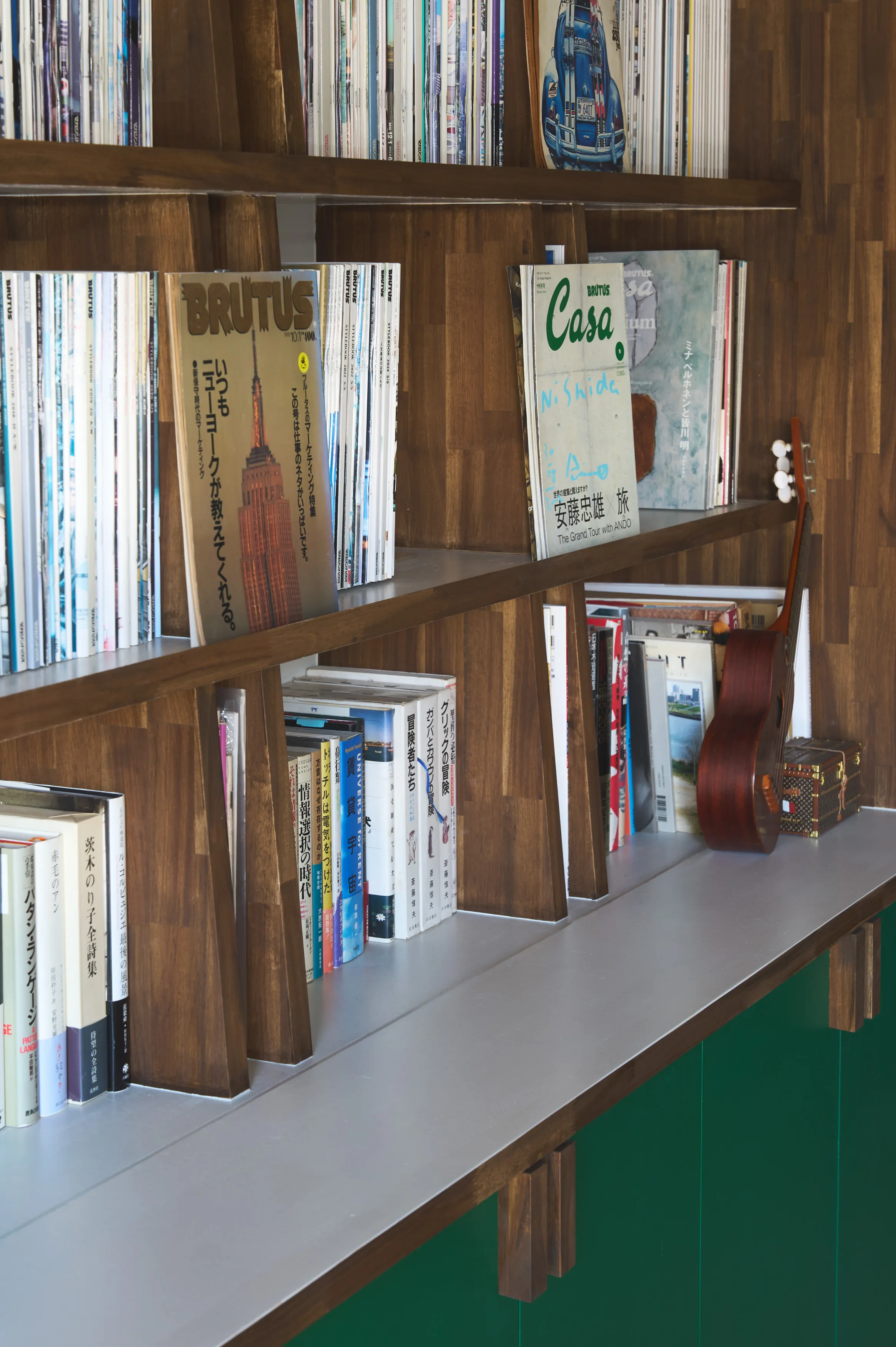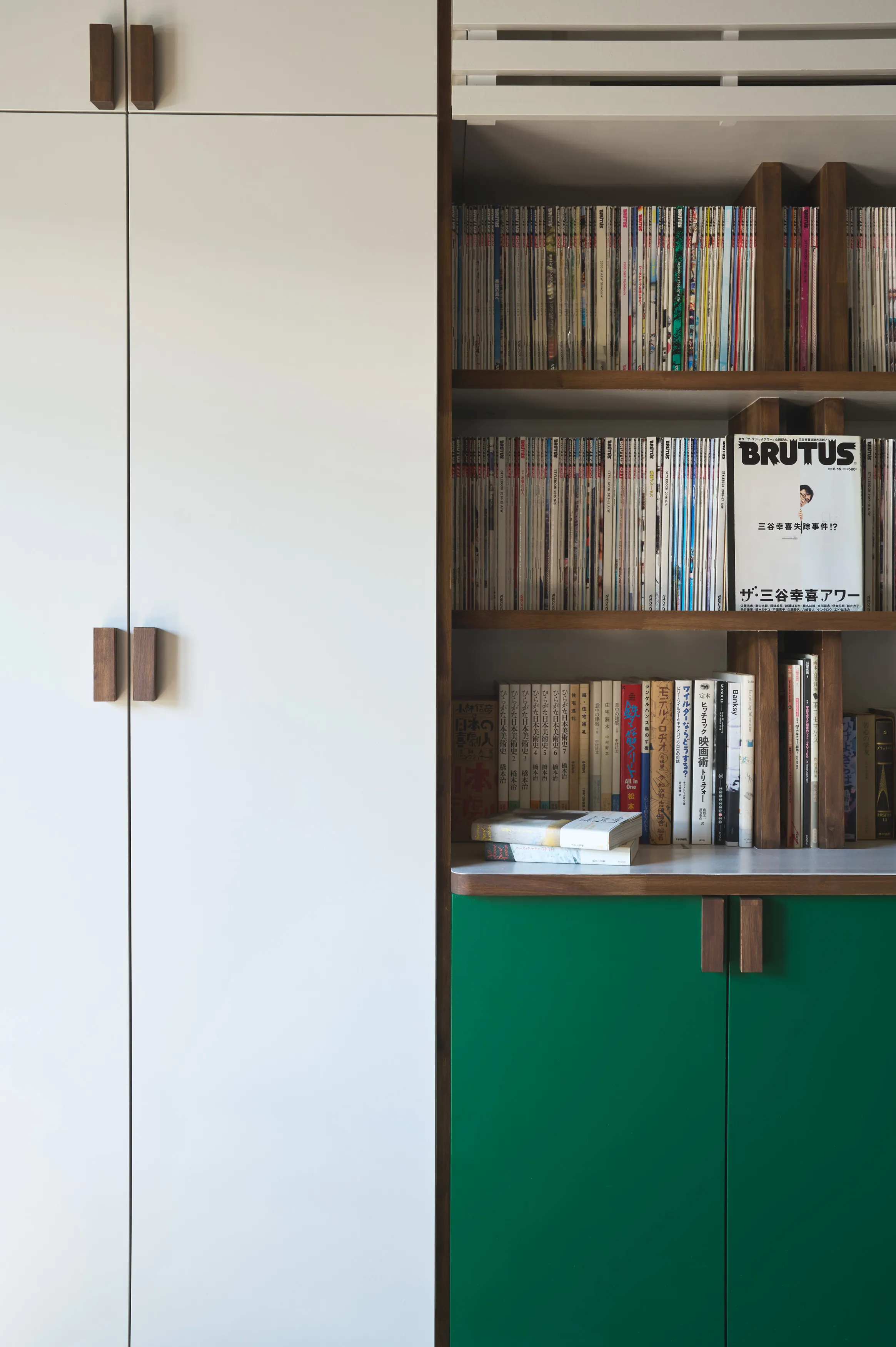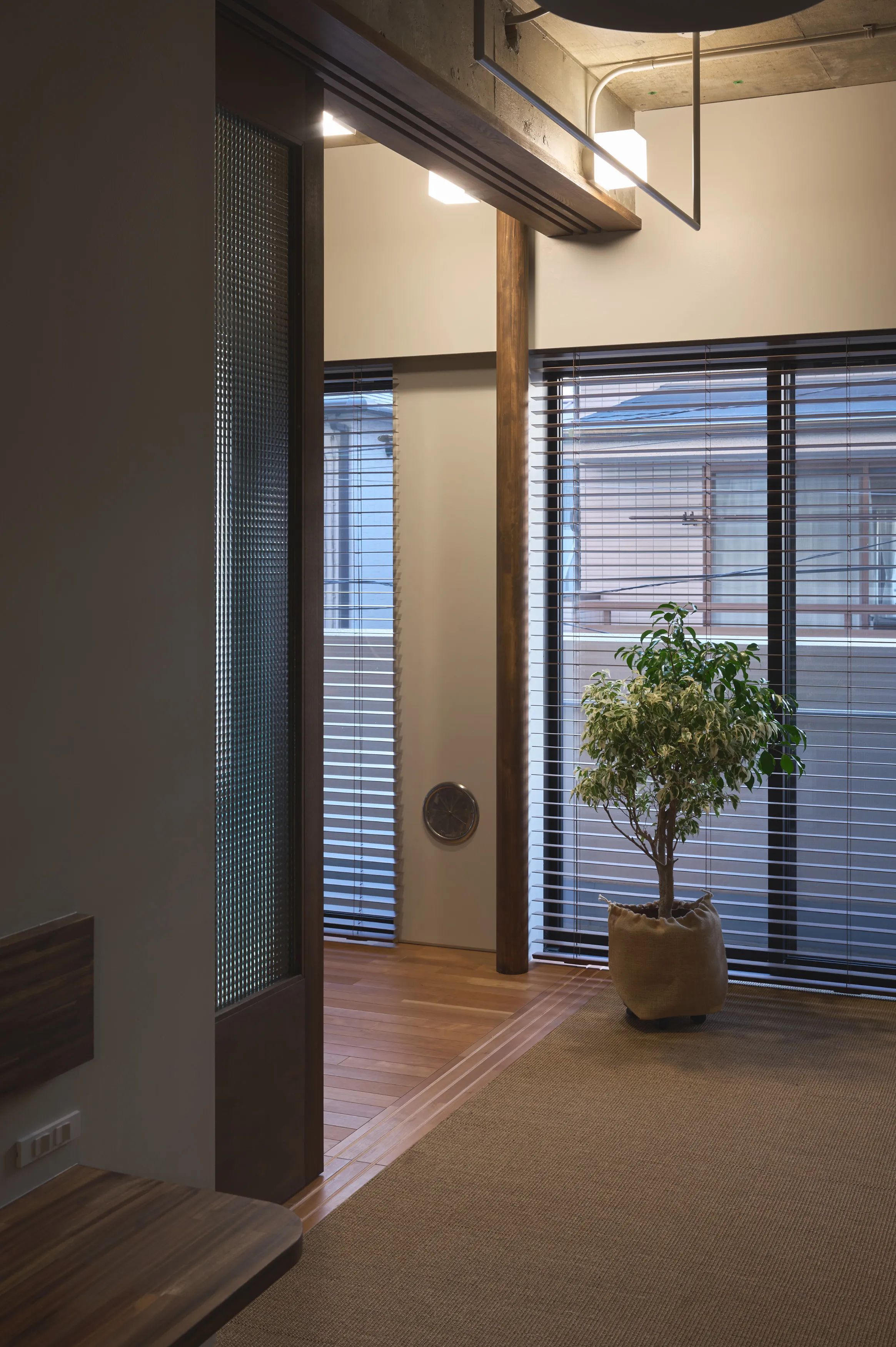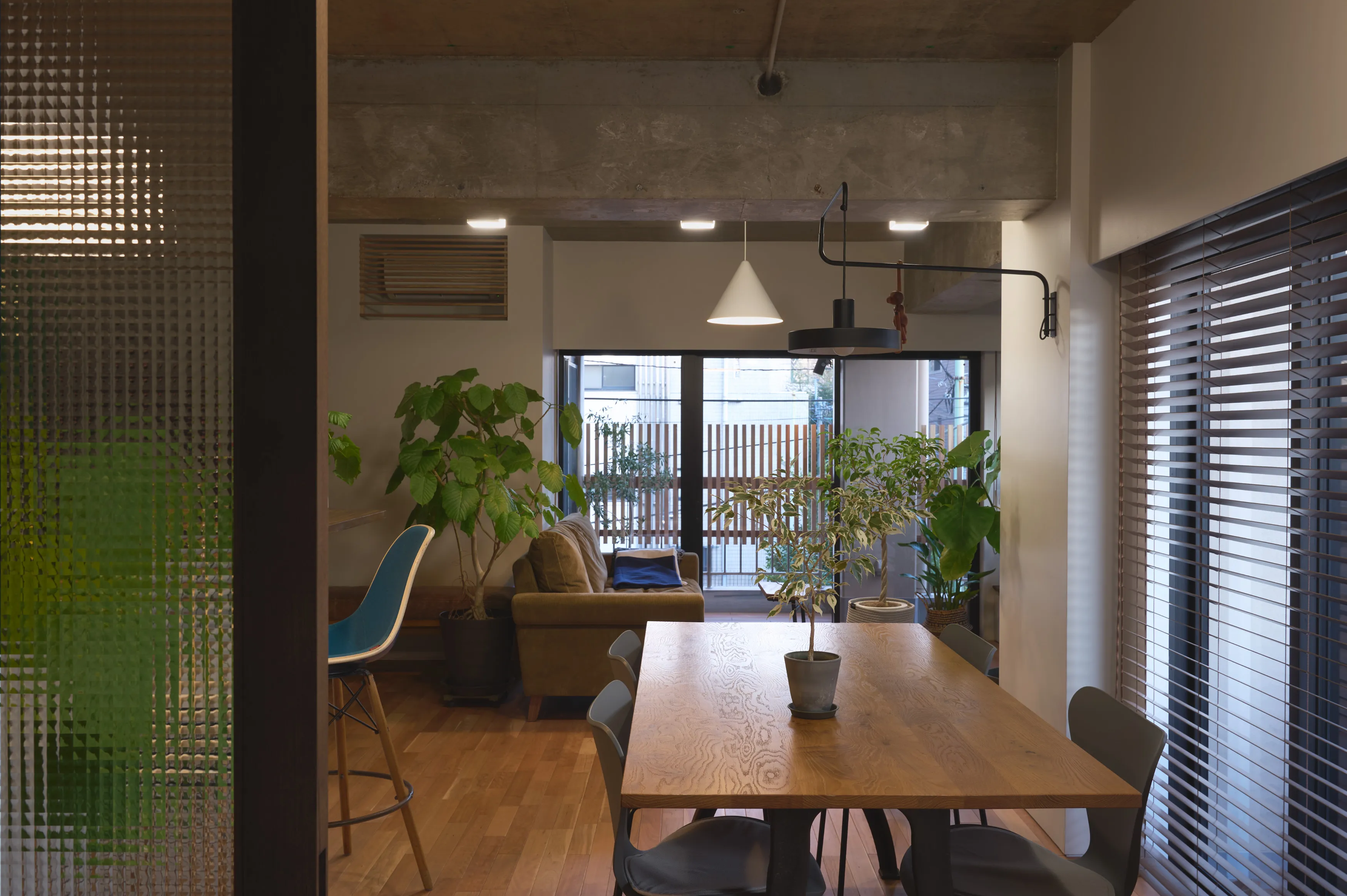 子どもたちの自立をきっかけとしたマンションの一室のリノベーション。この部屋の中央には、コンクリートの柱と上階の居室の配管スペースが貫いている。ここを中心に外へ向かって、壁や部屋を横断するように梁が伸びている。こうした事象の要因のひとつが、ここが賃貸マンションのオーナー住居であるため居室2つ分を占めていることである。部屋のインナーテラスや柱型によってできる変形した内部空間、サッシに重なる梁など、ほかにもいくつかのズレを内包している。そこに新しく加わる間仕切り、建具や造作においても、凸凹や雁行形状、色や素材によるコントラストなどを用いて、意識的にまじりけのある空間を設計した。
