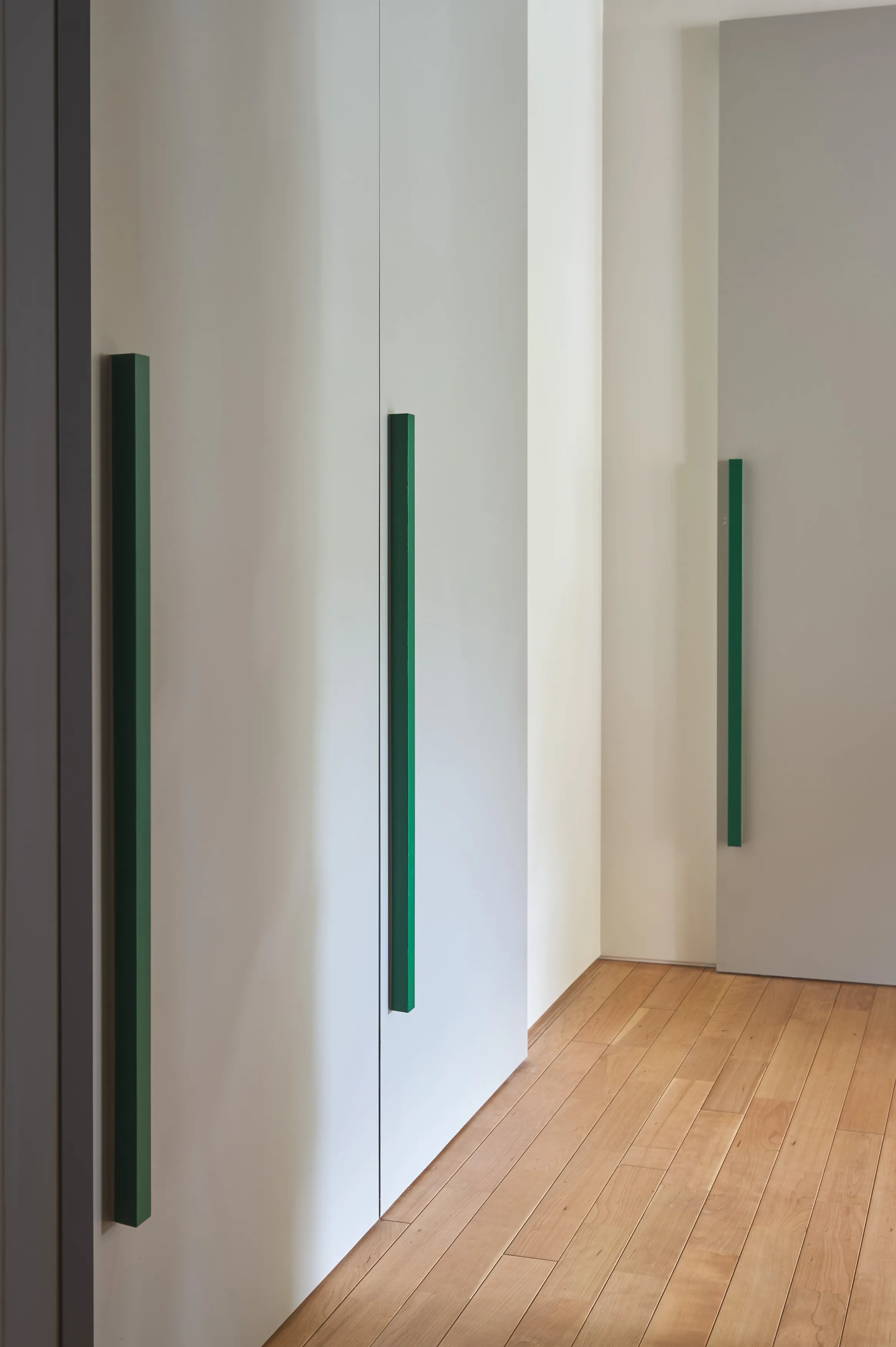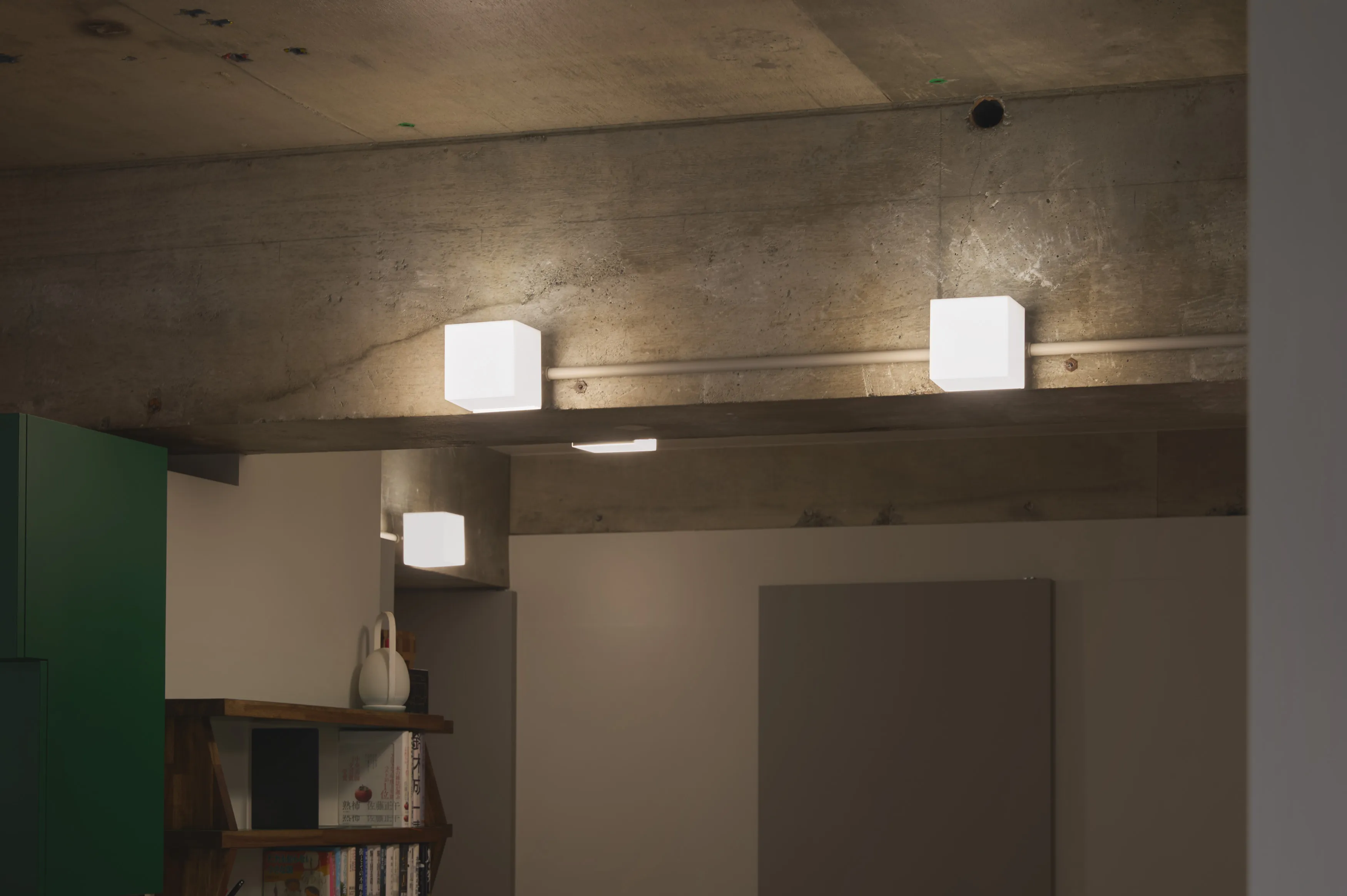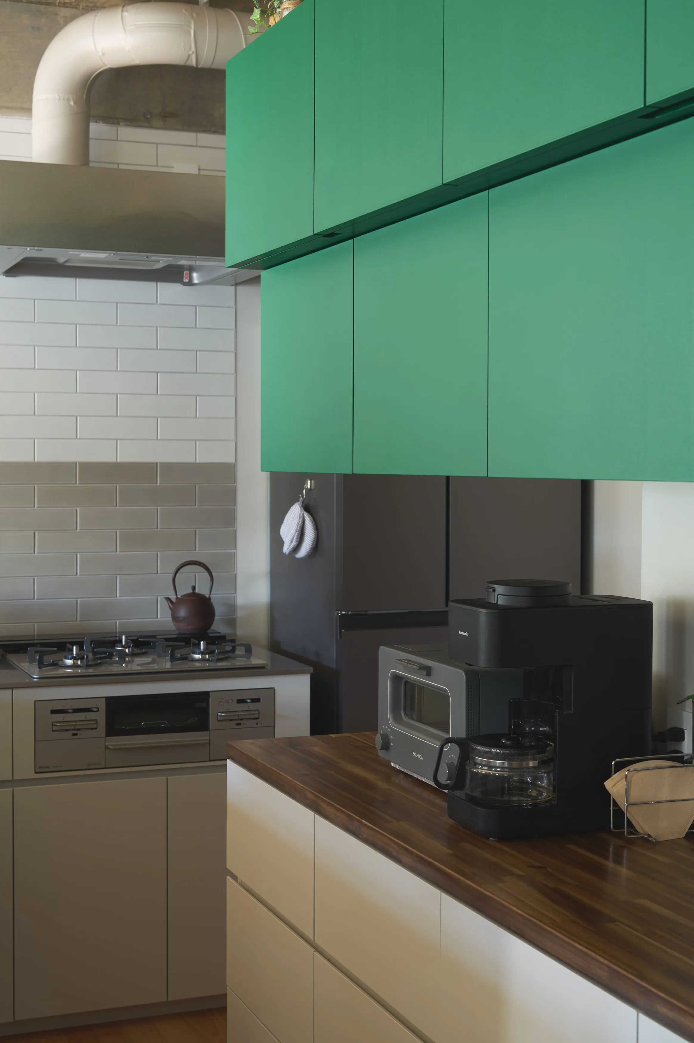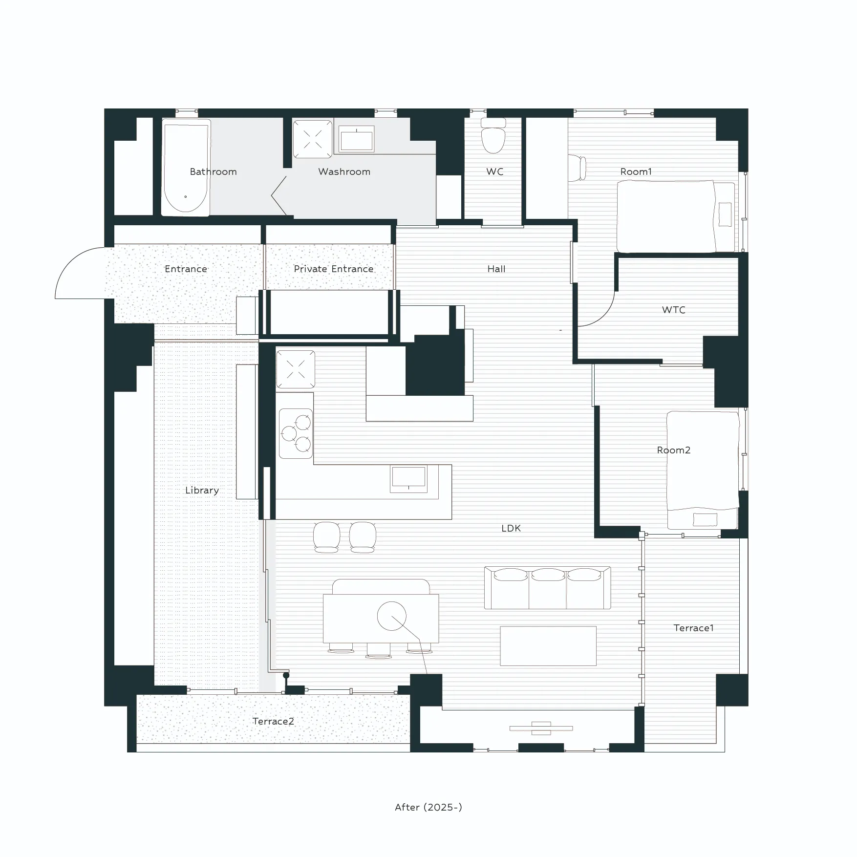 子どもたちの自立をきっかけとしたマンションの一室のリノベーション。この部屋の中央には、コンクリートの柱と上階の居室の配管スペースが貫いている。ここを中心に外へ向かって、壁や部屋を横断するように梁が伸びている。こうした事象の要因のひとつが、ここが賃貸マンションのオーナー住居であるため居室2つ分を占めていることである。部屋のインナーテラスや柱型によってできる変形した内部空間、サッシに重なる梁など、ほかにもいくつかのズレを内包している。そこに新しく加わる間仕切り、建具や造作においても、凸凹や雁行形状、色や素材によるコントラストなどを用いて、意識的にまじりけのある空間を設計した。