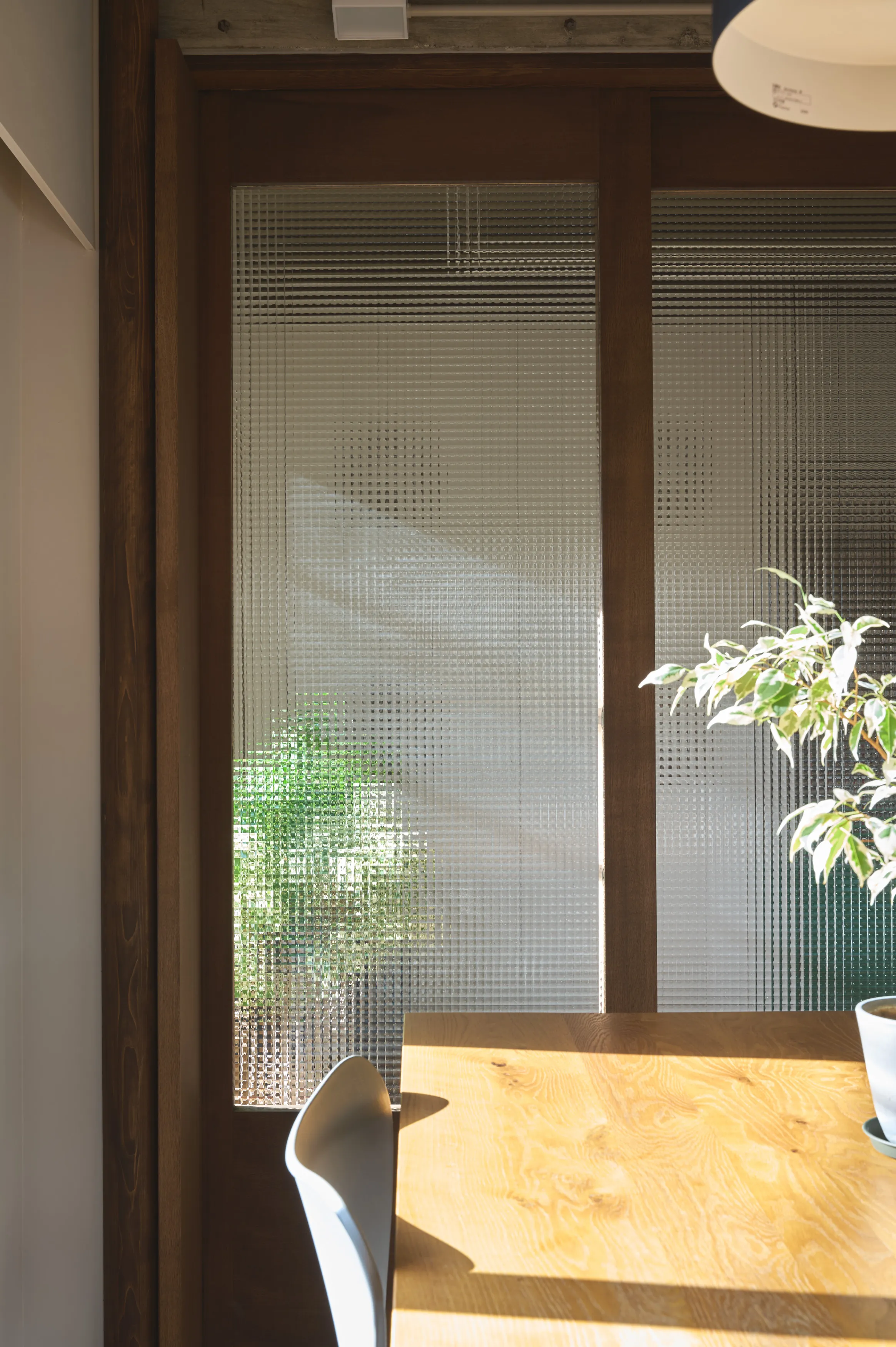 バリアフリーや自然光を取り入れるために計画した回廊型の動線やガラスをはめた引き戸も、こうした不揃いな集まりを引き立てるはたらきを持っているのかもしれない。