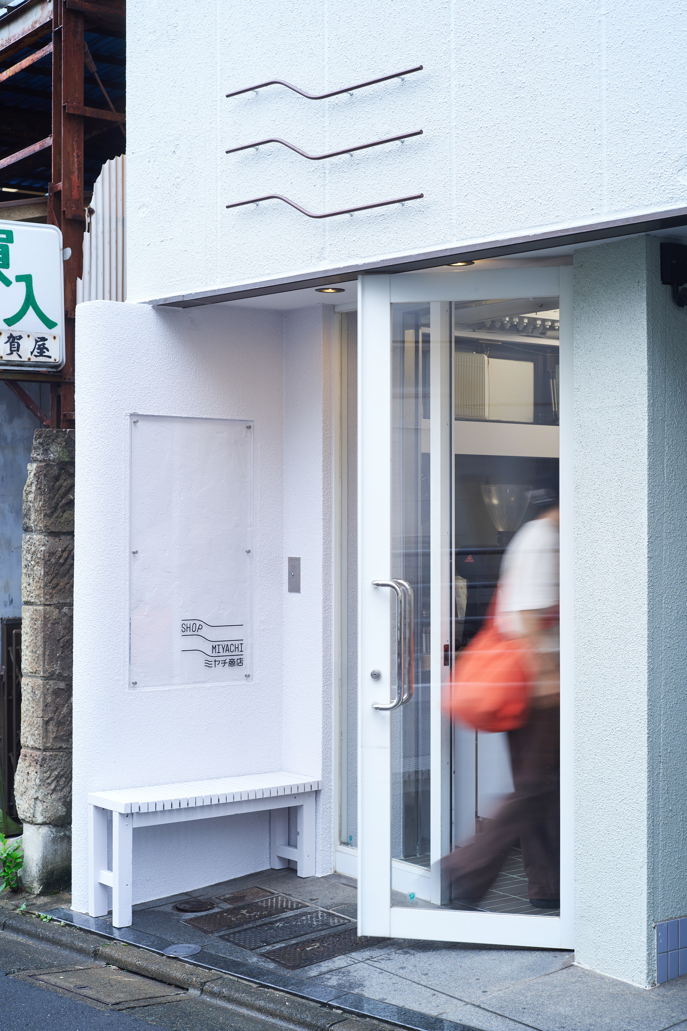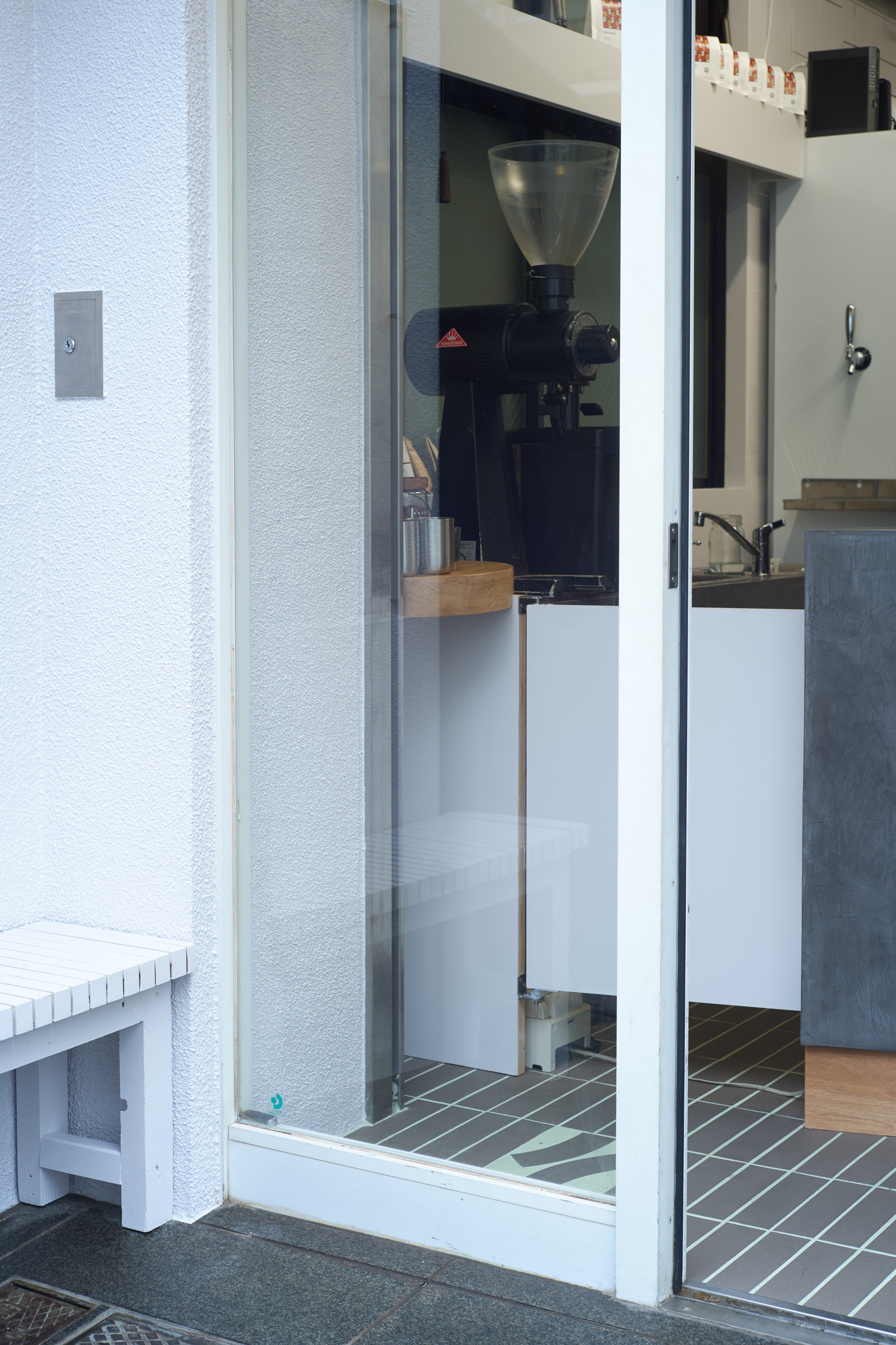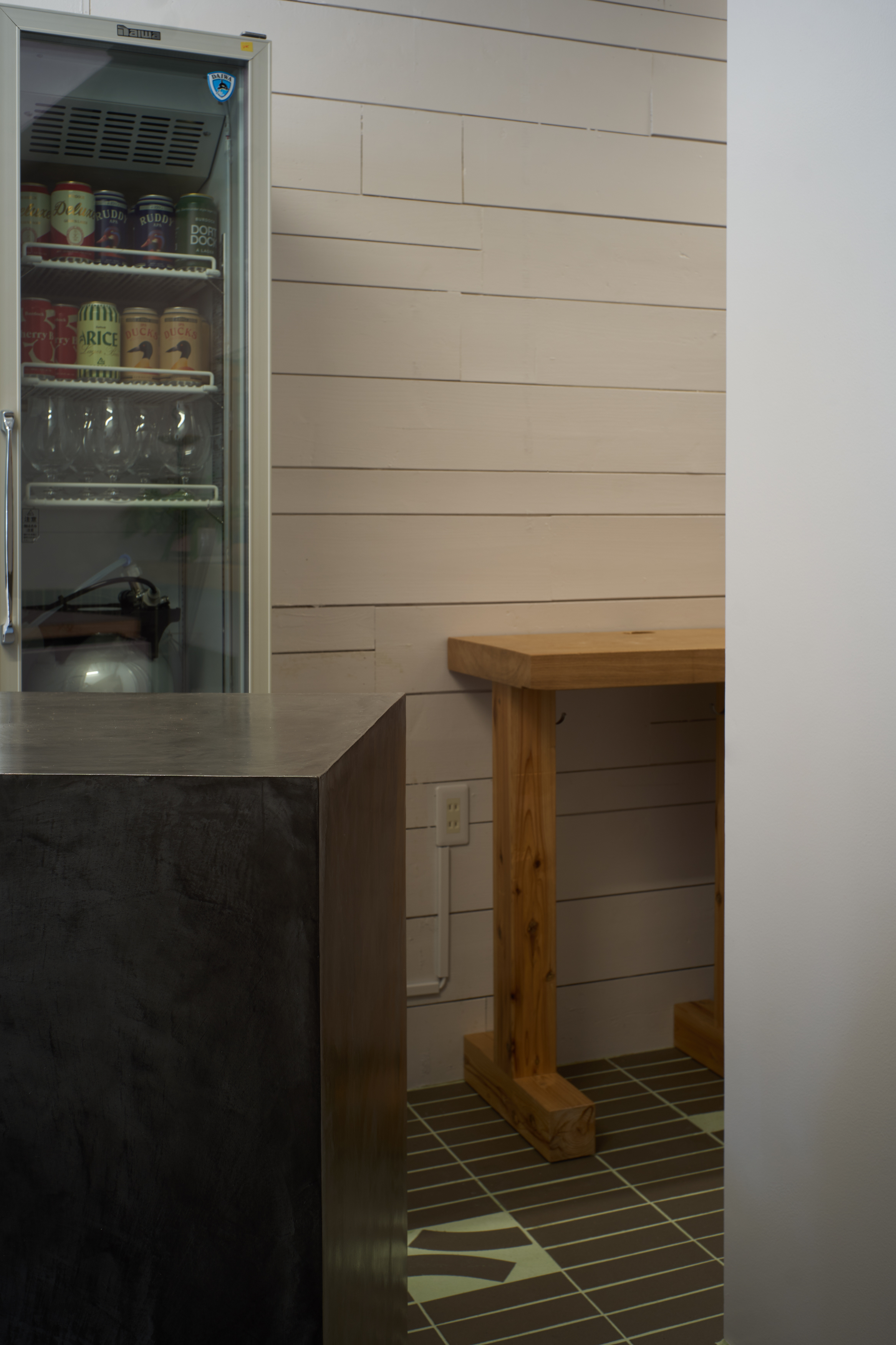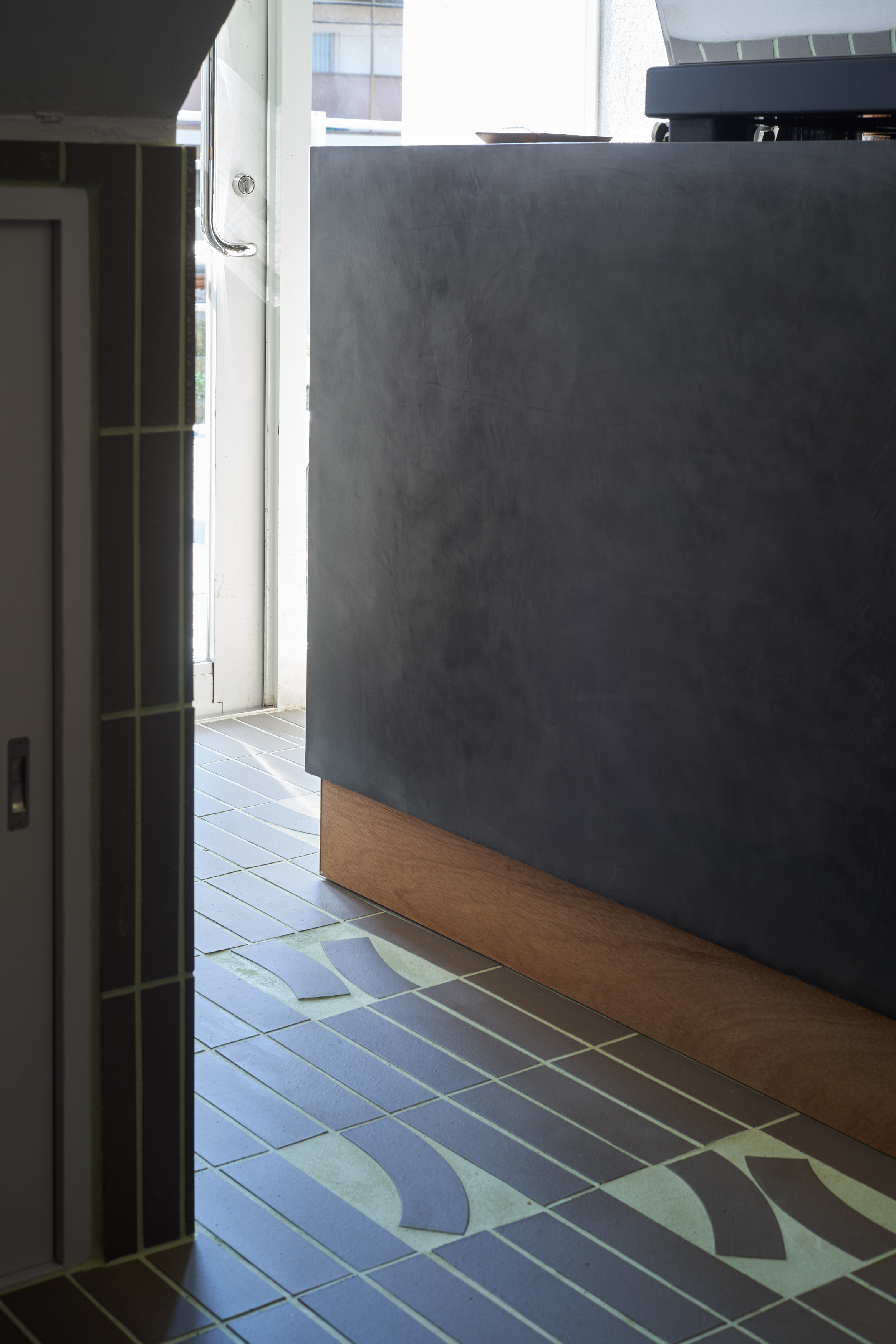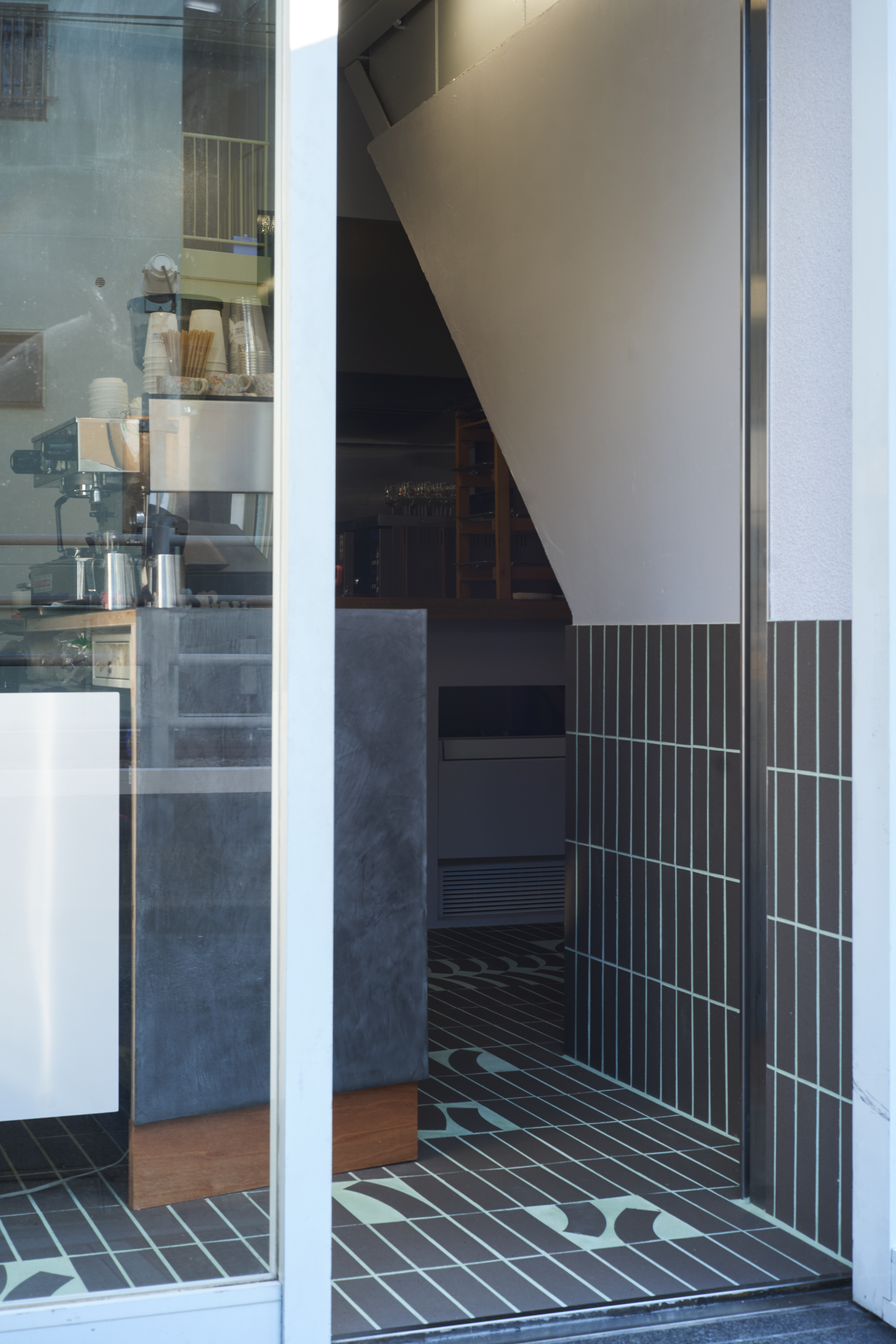 床には、ミヤチ商店のロゴのカーブをモチーフに制作したオリジナルタイルを採用。コーヒーに限らず、さまざまなモノやコトが生まれ変化し続ける空間に対して、変わらないシンボルとなるよう提案。厨房の立ち飲みカウンターと、カウンターテーブルは、以前の店舗でメインのカウンターとして使われていた板を転用するなど、店主がこれまで過ごした空間の要素を新たな空間に合わせてチューニングした。