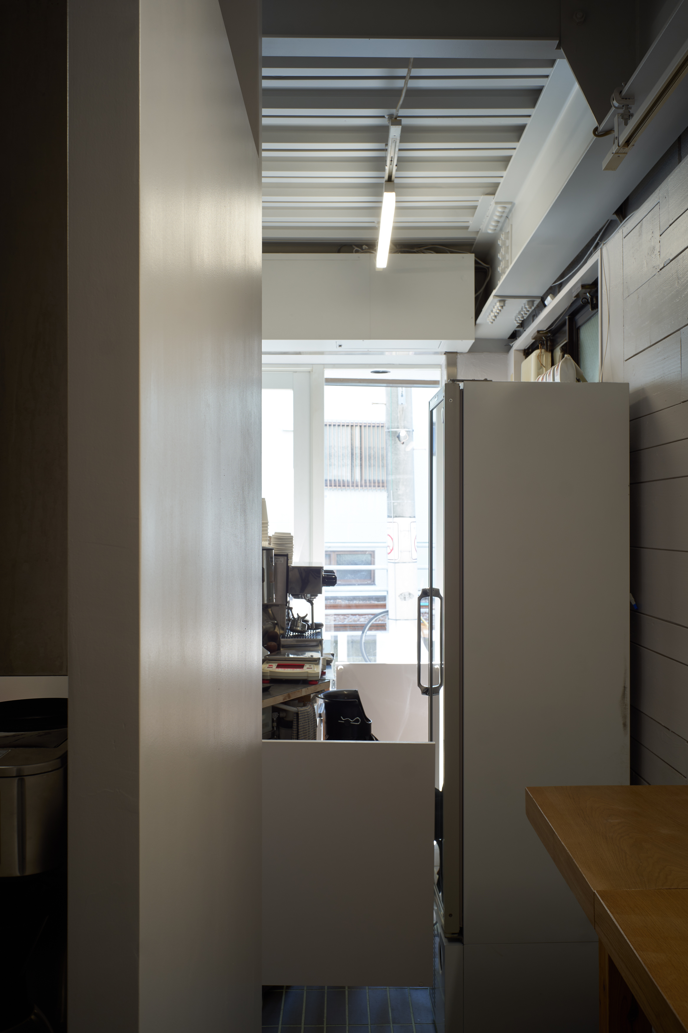 店内飲食のために求められる手前の入り口と一番奥のお手洗いを繋ぐ長い動線を、カウンターや階段下、厨房の間をぐねぐねと奥へ引き込むような計画とした。一人で切り盛りする店主は、道ゆく人から店の奥まで見渡し、店の雰囲気をつくっている。カウンター越しに店主のドリップを鑑賞する人や、線路沿いのベンチでほろ酔い気分の人、厨房には出張料理人もいたりして。23㎡ほどの中にいろんな姿が重なる様子は、手袋の中にたくさんの動物たちが集まる絵本「てぶくろ」の世界のよう。