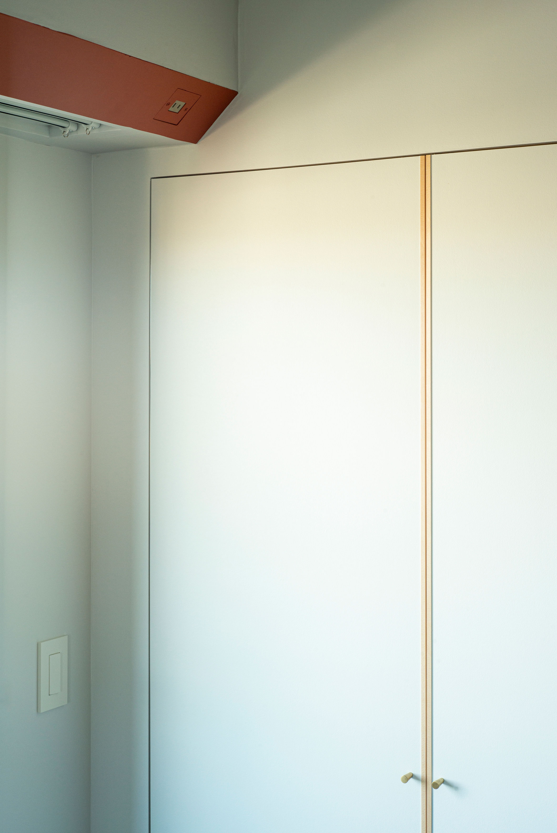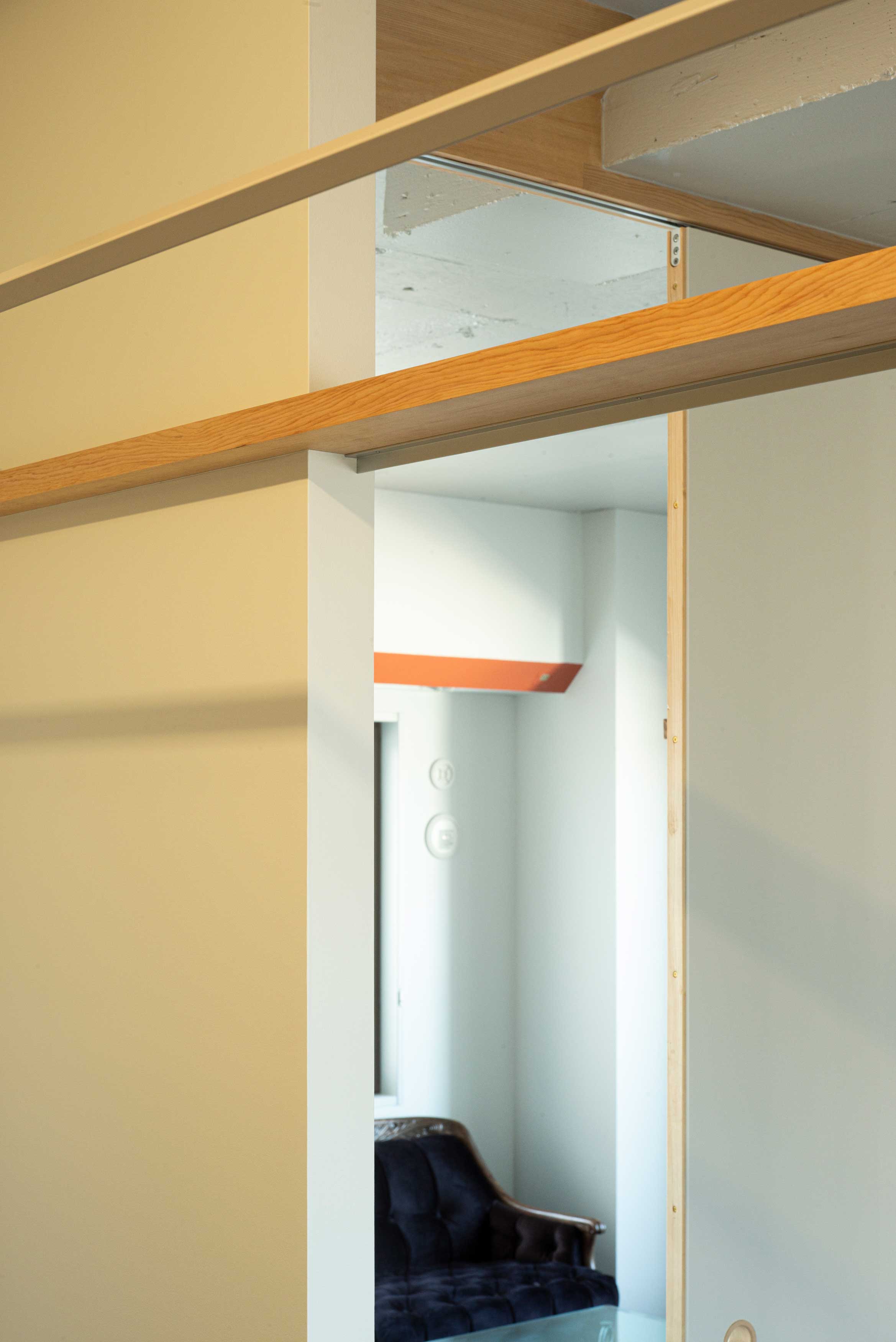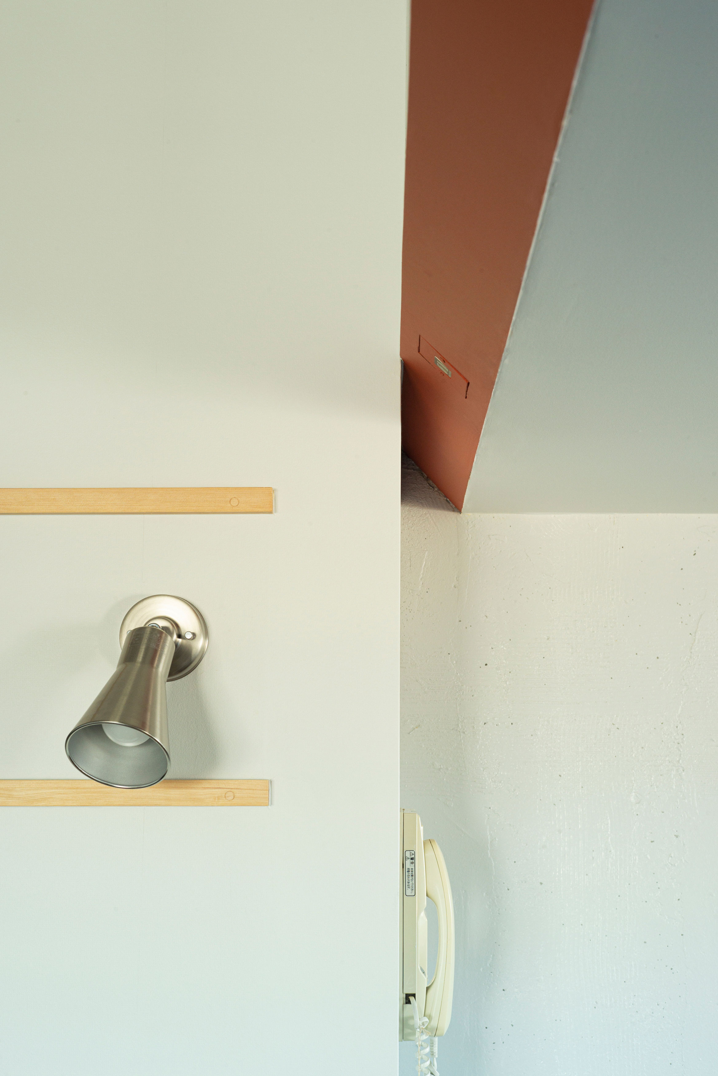 手がかりの初手として主要なエレメントである引き戸はまず濃紺に、そののち45度の電気配線カバーをオレンジに、既存壁と新規壁の見切りにツガをアクセントに、というように順に仮定しながら配置していき、それらを伏線として色相や45度カットといった処理を複層させ、ときどき立ち止まってあらゆる角度から空間を見返して、素材や色を決断していく。