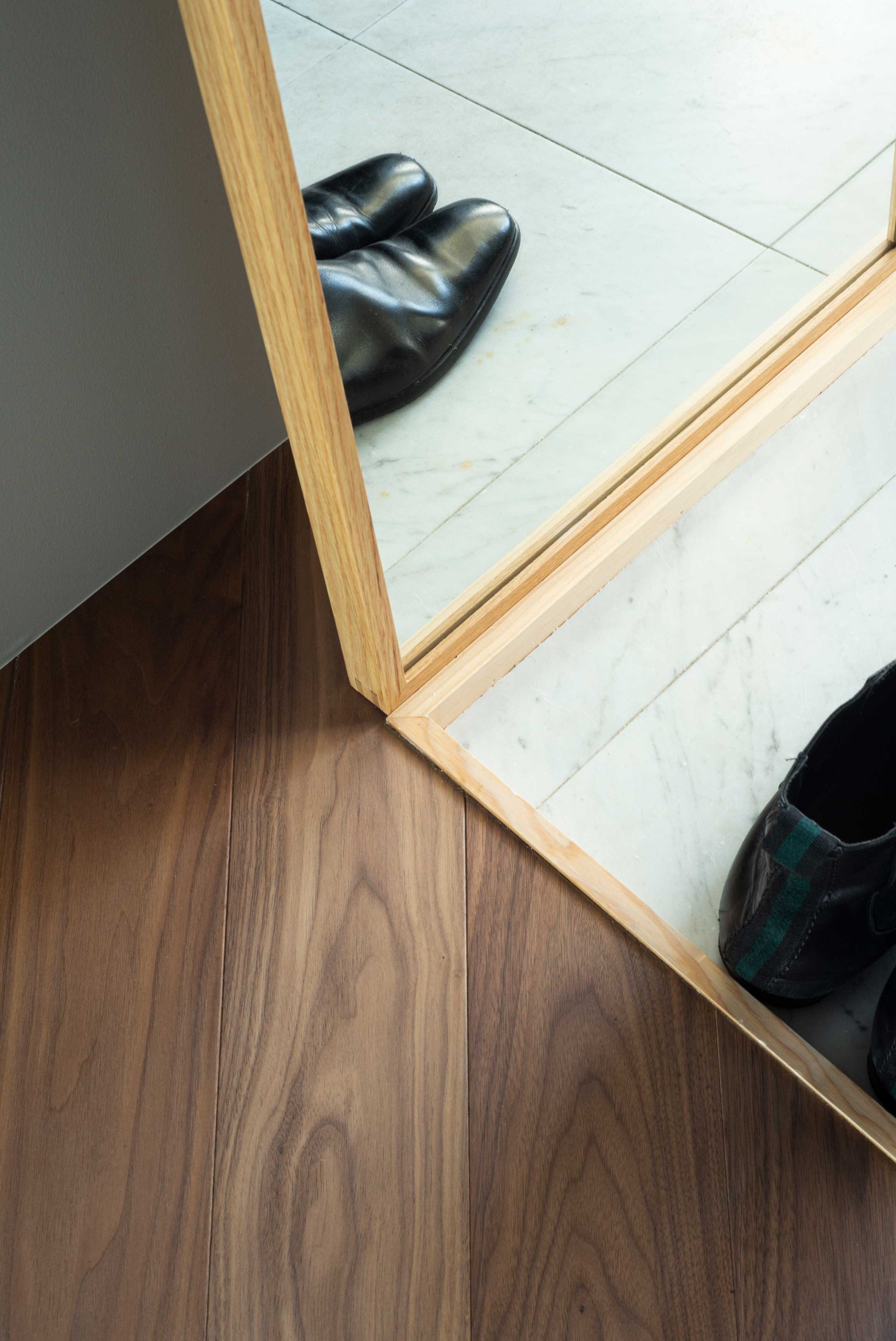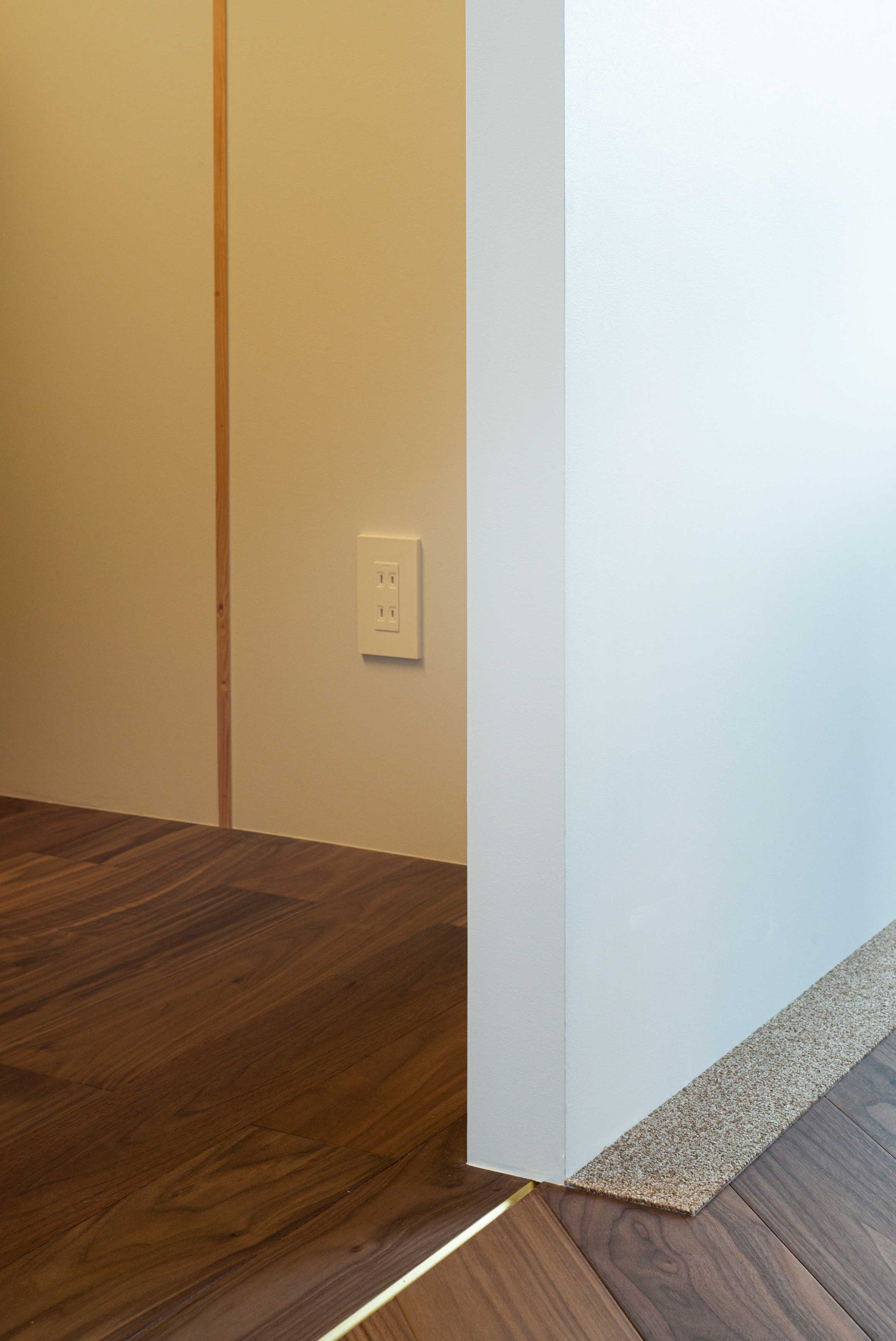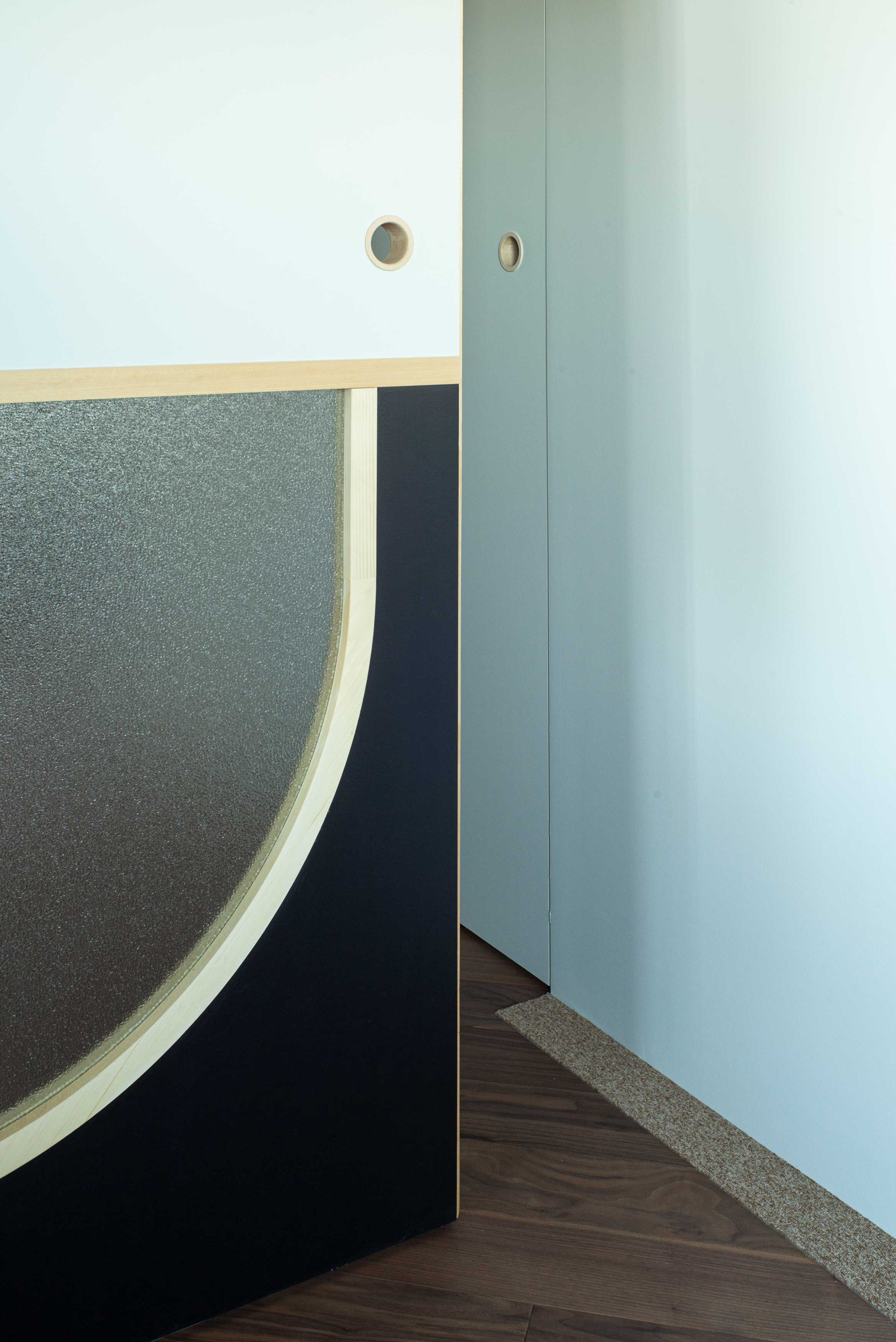 手がかりの初手として主要なエレメントである引き戸はまず濃紺に、そののち45度の電気配線カバーをオレンジに、既存壁と新規壁の見切りにツガをアクセントに、というように順に仮定しながら配置していき、それらを伏線として色相や45度カットといった処理を複層させ、ときどき立ち止まってあらゆる角度から空間を見返して、素材や色を決断していく。