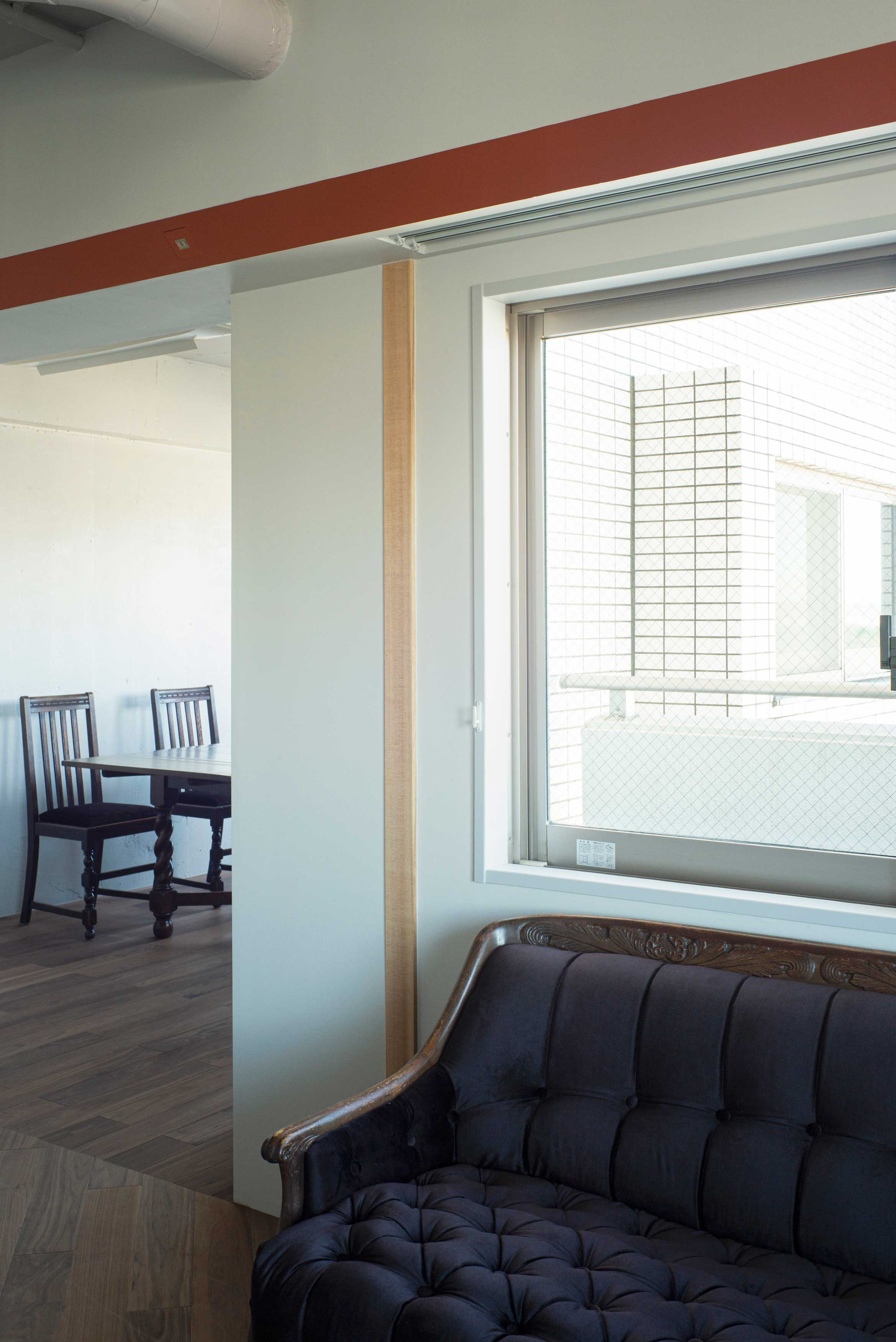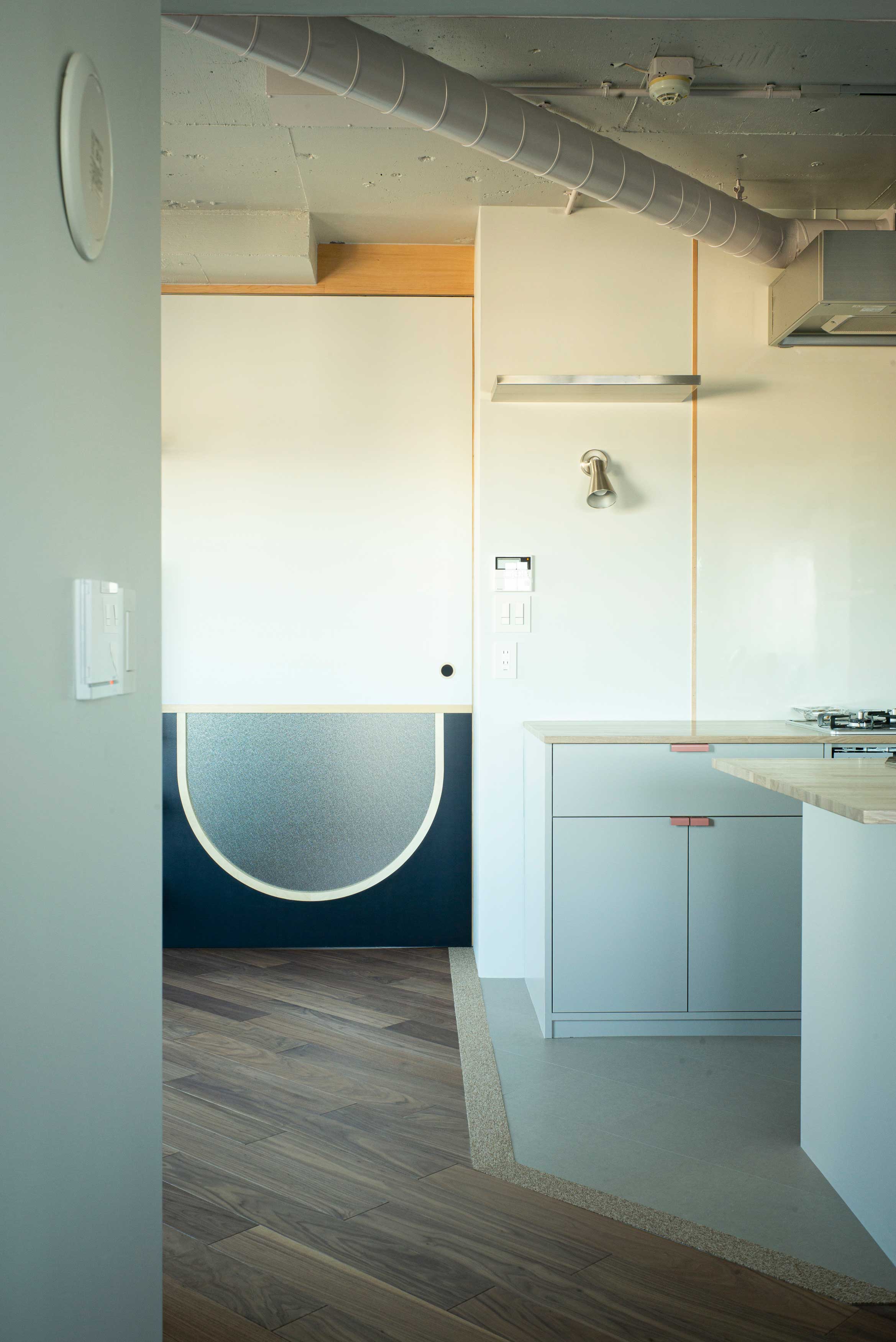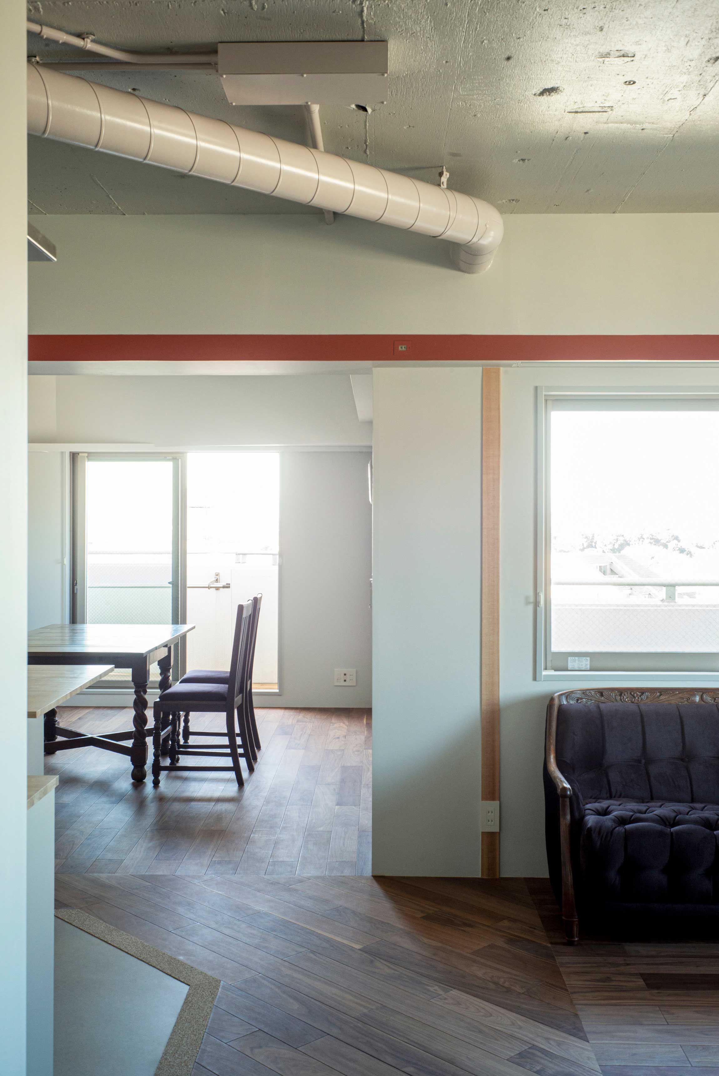 マンションの角部屋の全面改修。1日のほとんどを徒歩圏内の事務所で過ごすオーナーの自宅でもあるが、週に1回程度仕事仲間を招いて団らんを楽しめる空間にしたいという希望があった。そのため、変形したプランを持つそれほど大きくないボリュームを、眺めのよい3つの窓を含むL字のリビングダイニングと寝室・玄関ホールとに分け、その間を引き戸で仕切る構成に変更した。