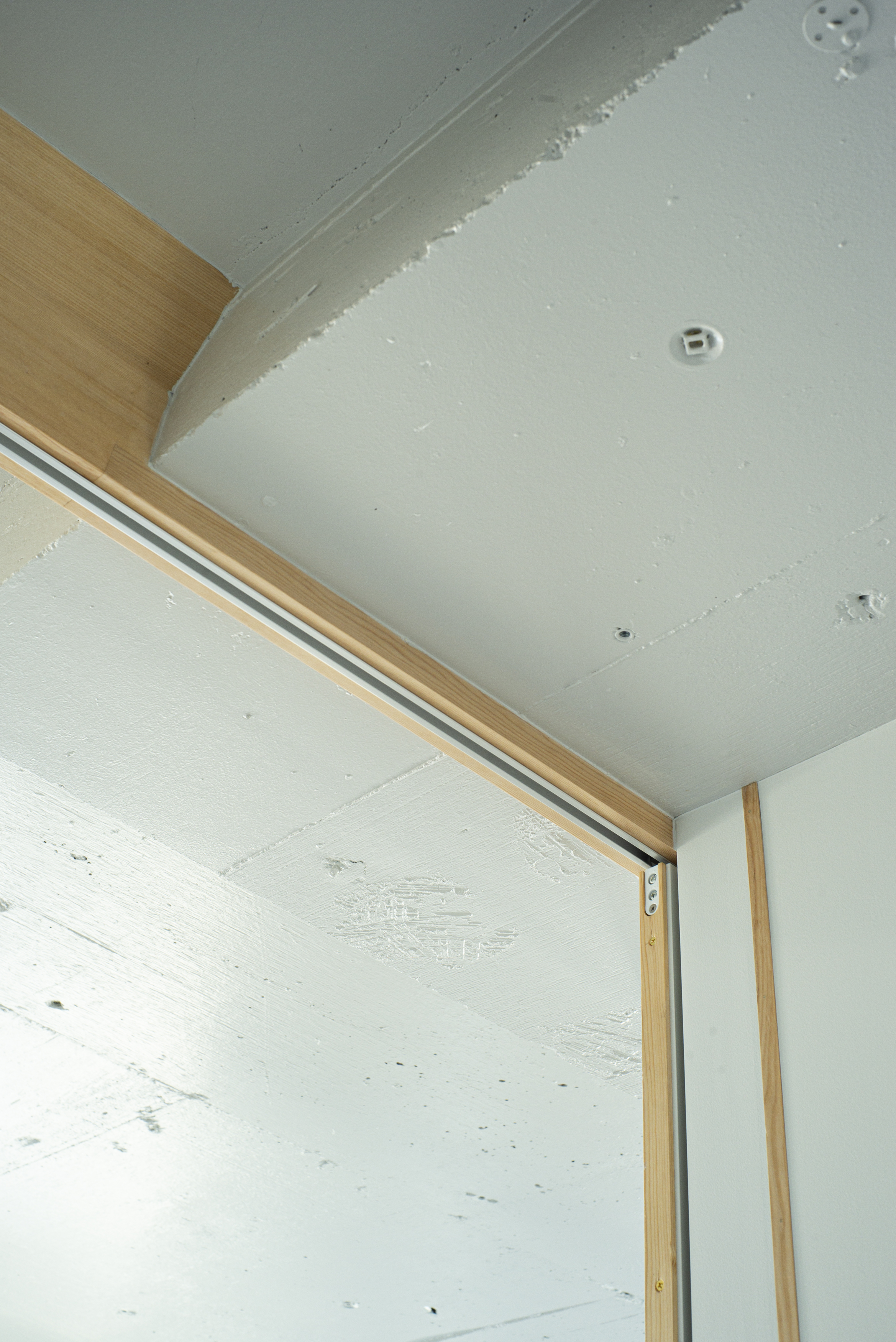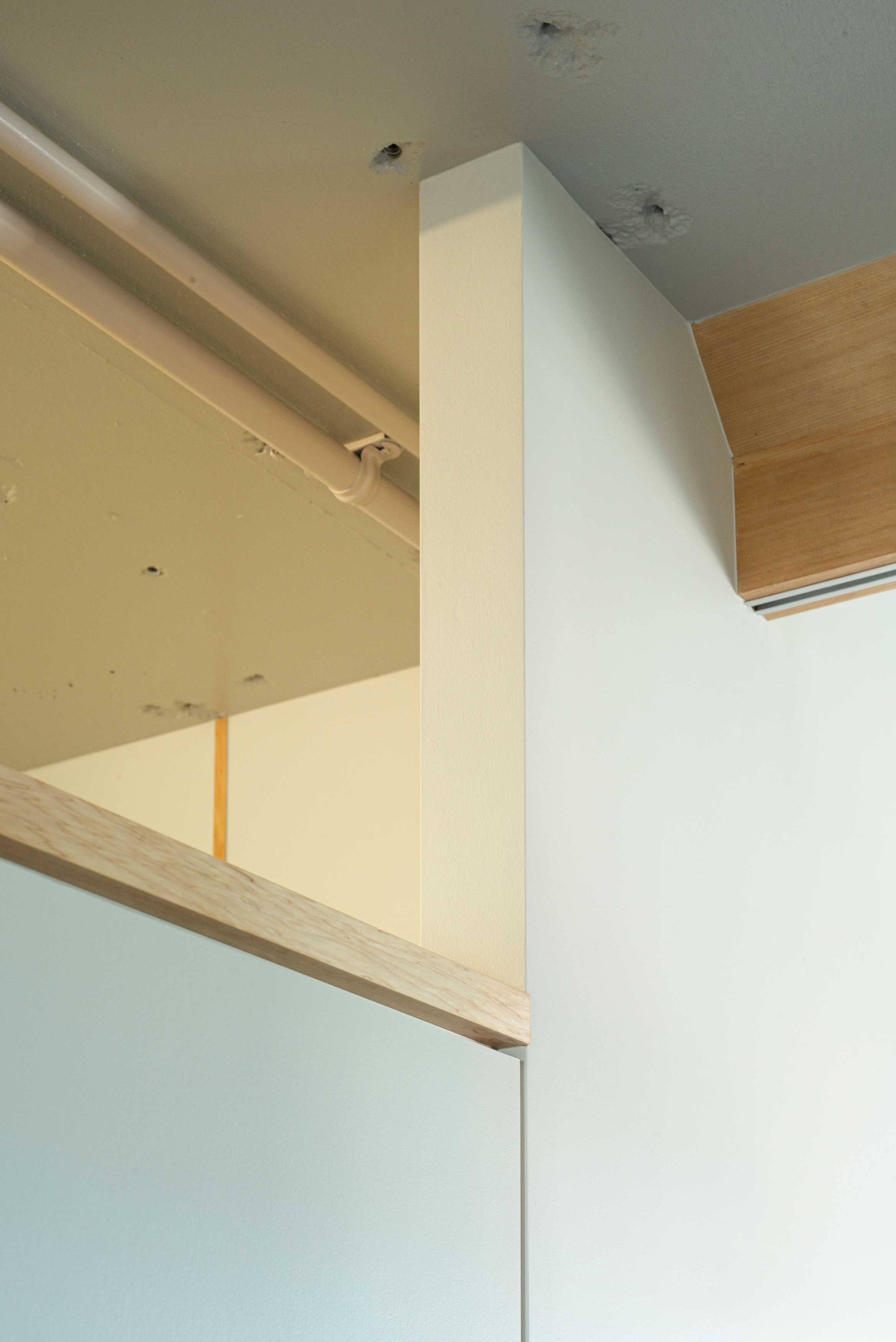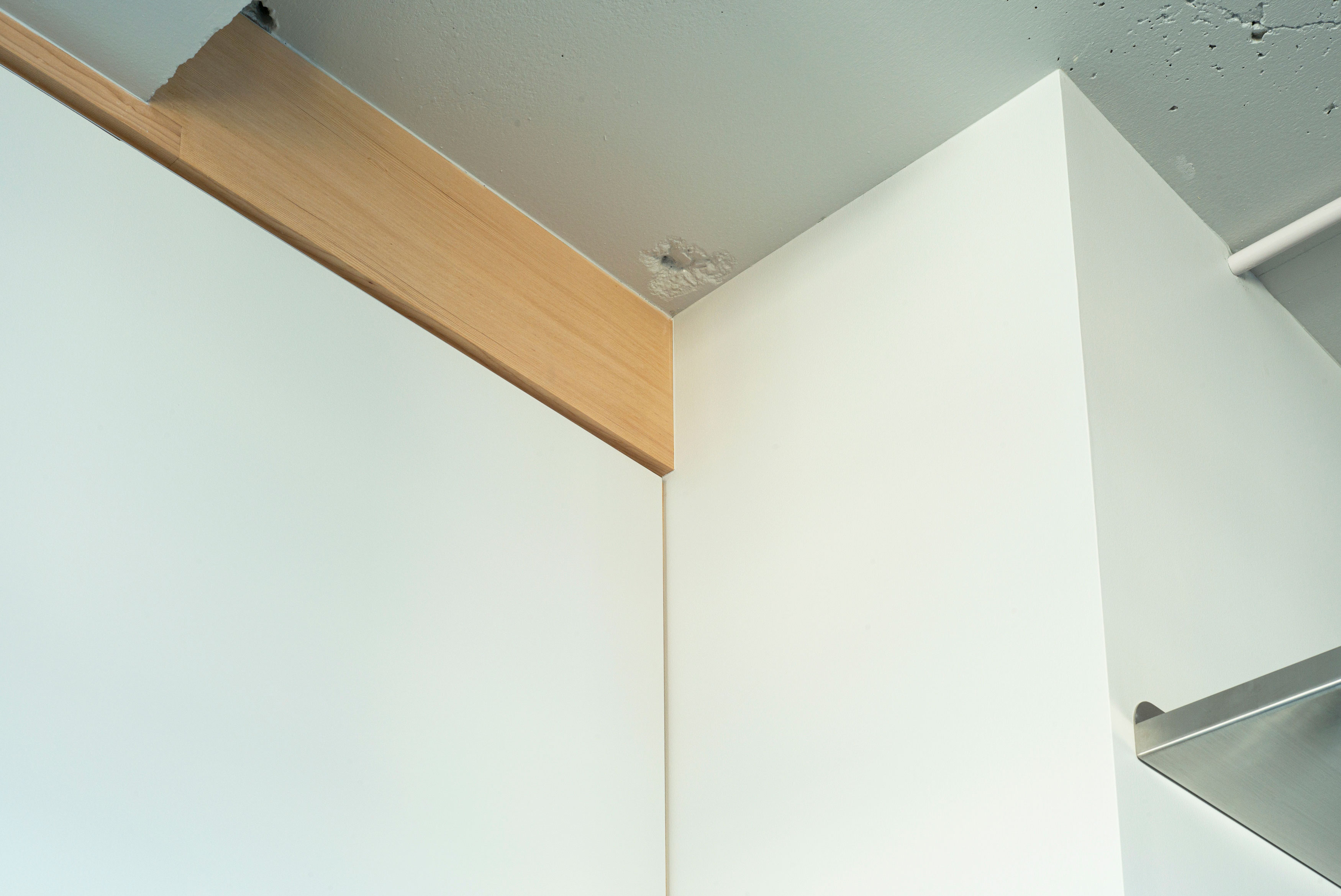 これをできるだけ手数の少ない方法で行おうとするのだが、できるだけ気積を大きくするために取り除いた仕上げの内側からは、柱と梁と設備らの複雑な絡まりが現れた。部屋のどこにいてもつねに視界の端に入ってくるさまざまなディテールや柱や梁の現れが、空間の使い方や領域の感じられ方に相対的に大きく作用してくるため、スタディの中心はこの調停に当てられた。したがって取りうる方法としては、ひとまず何かを解決するために考えたディテールのスタイルを反復したり流用したりして全体にまとまりがつくれないかを試すことになる。しかし、それがかえってうるさくなったり別の解決策を阻んだりするので、再びそれらの解決策を講じる作業を延々繰り返すことになる。