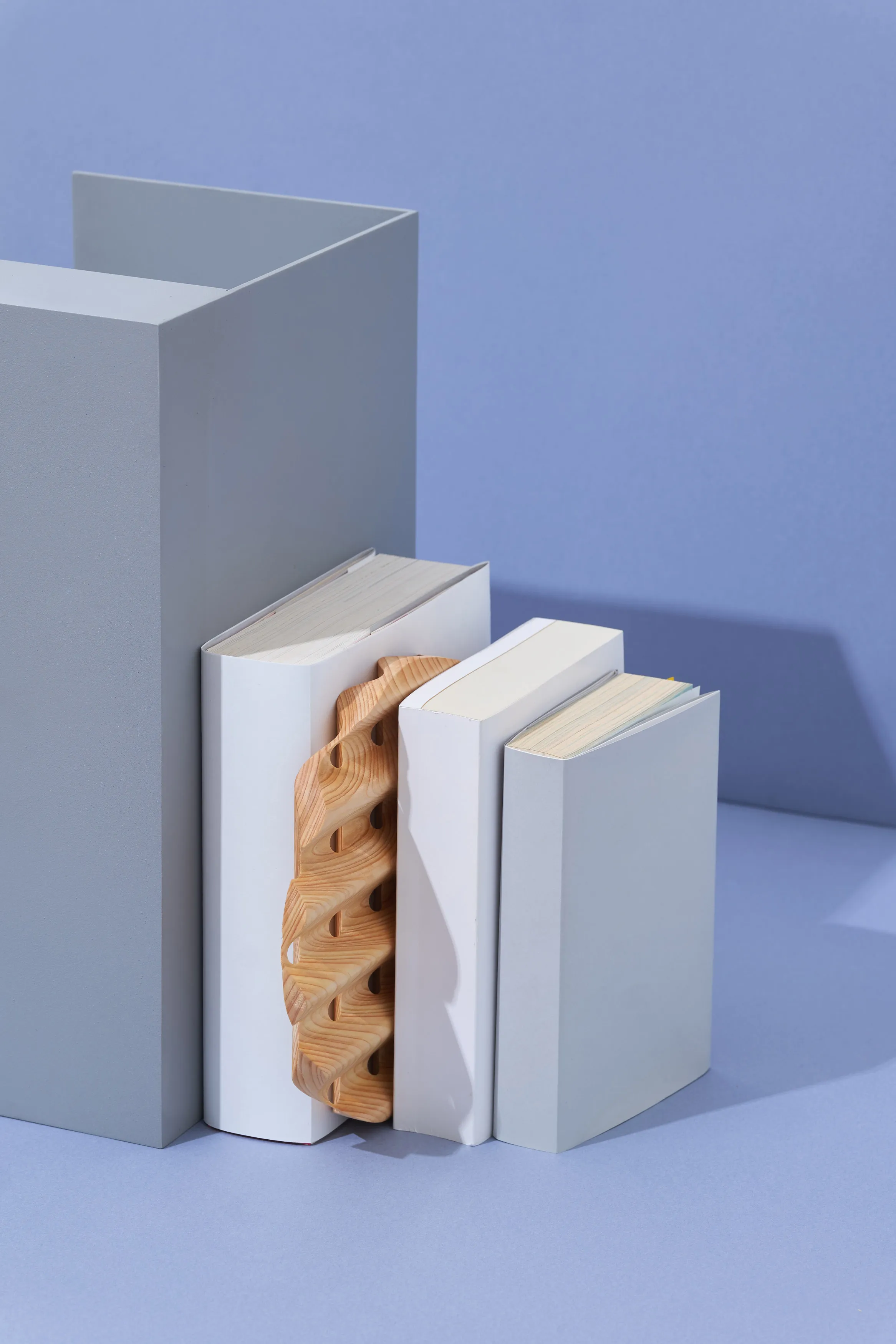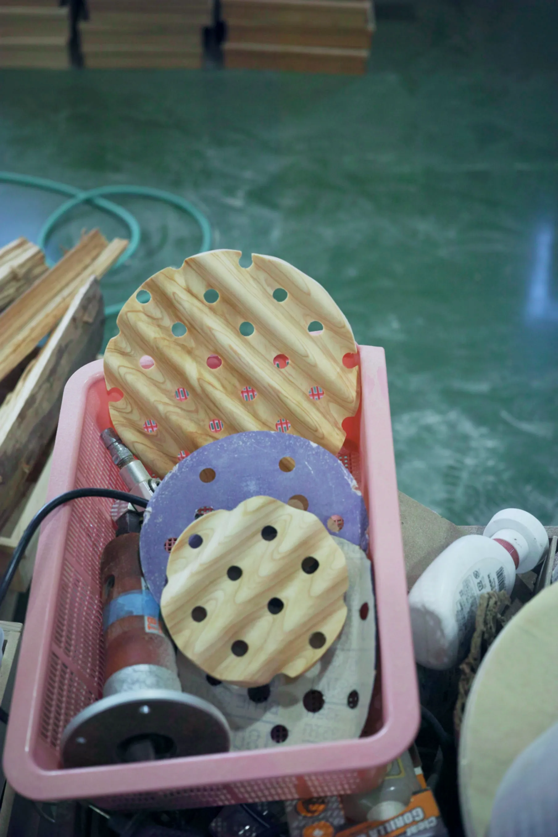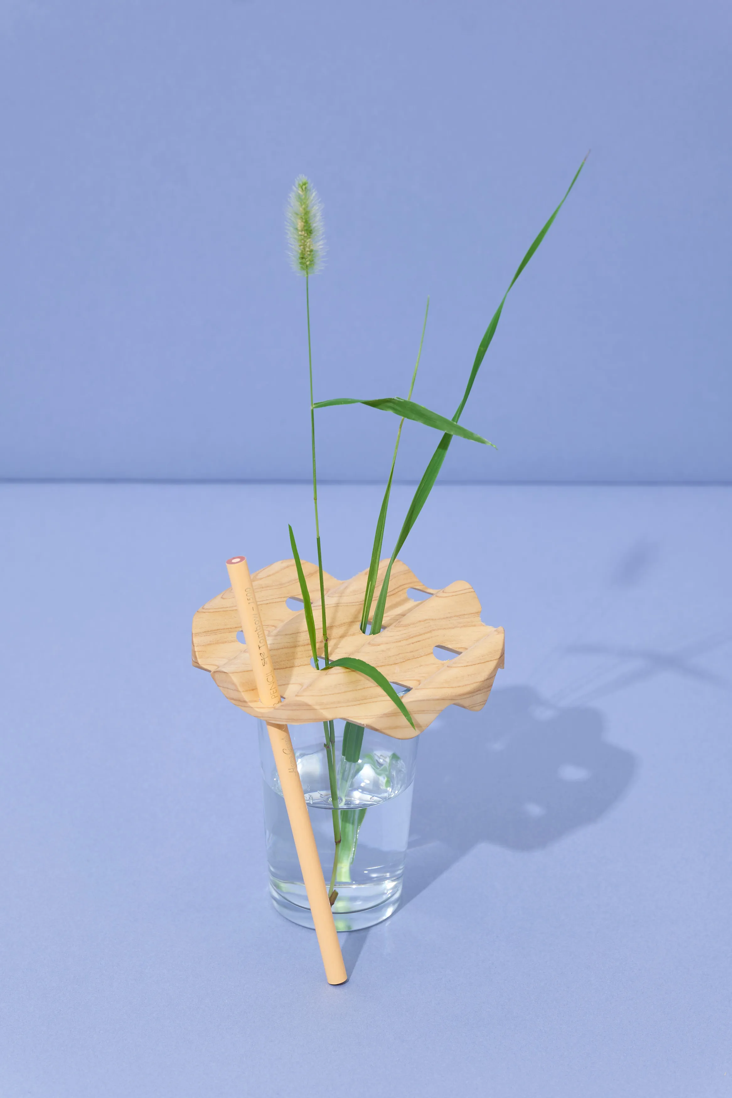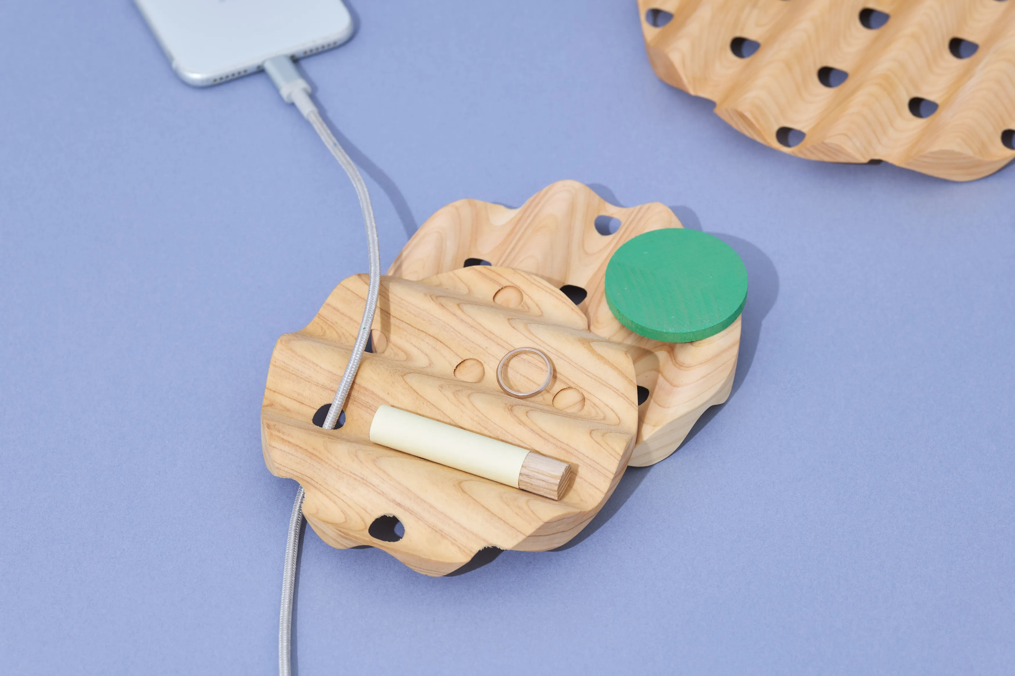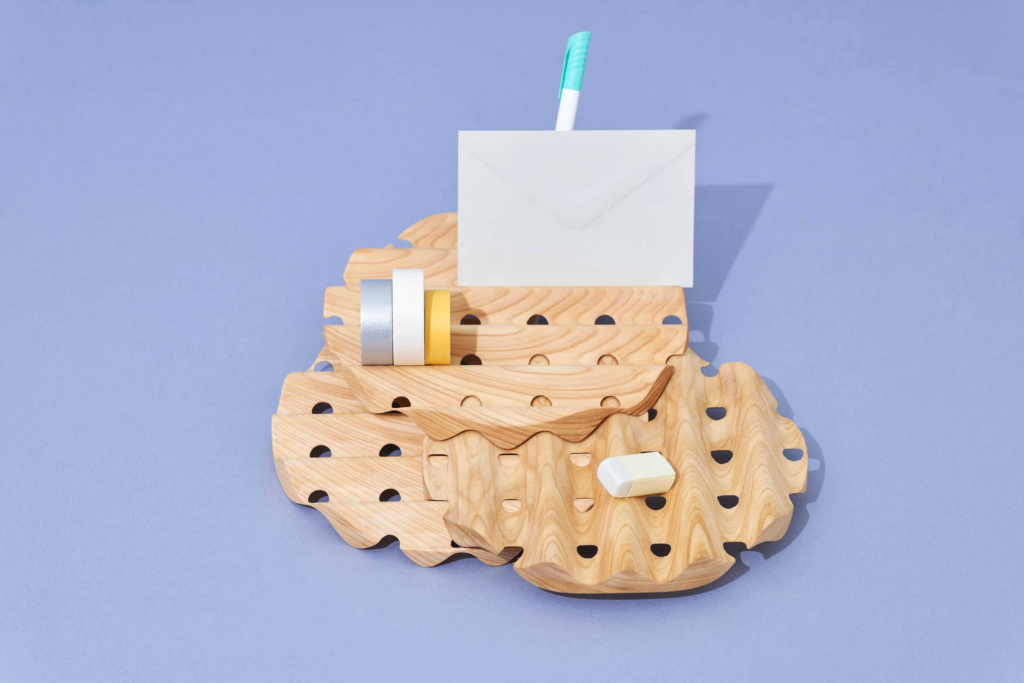 手作業により表面を磨いた木材ならではのツルツル、スベスベした手触りを持ち、一枚で、あるいは複数枚を重ねてデスクトレイに、開けられた穴に花やペンを挿して花器やペントレイに。