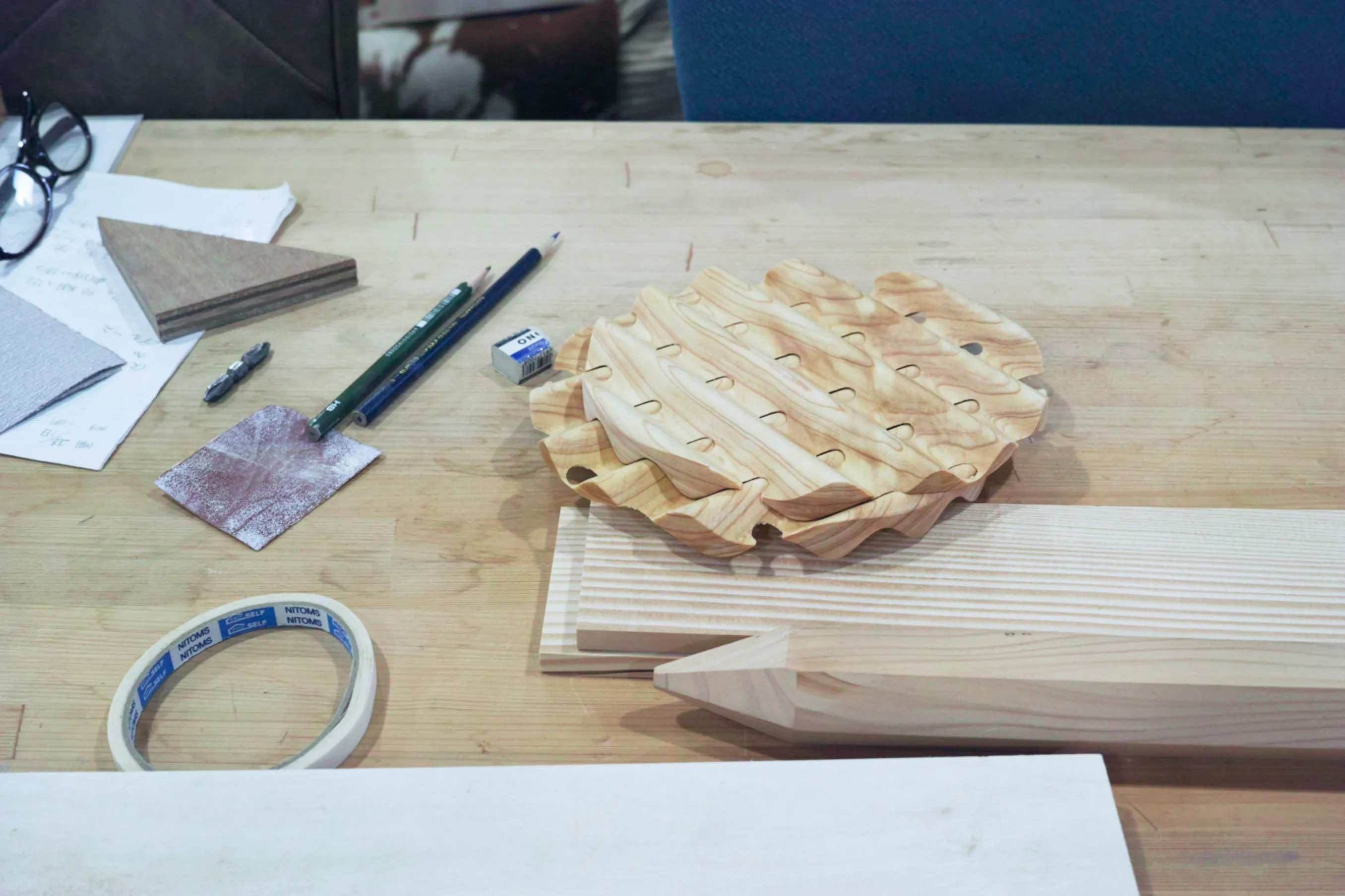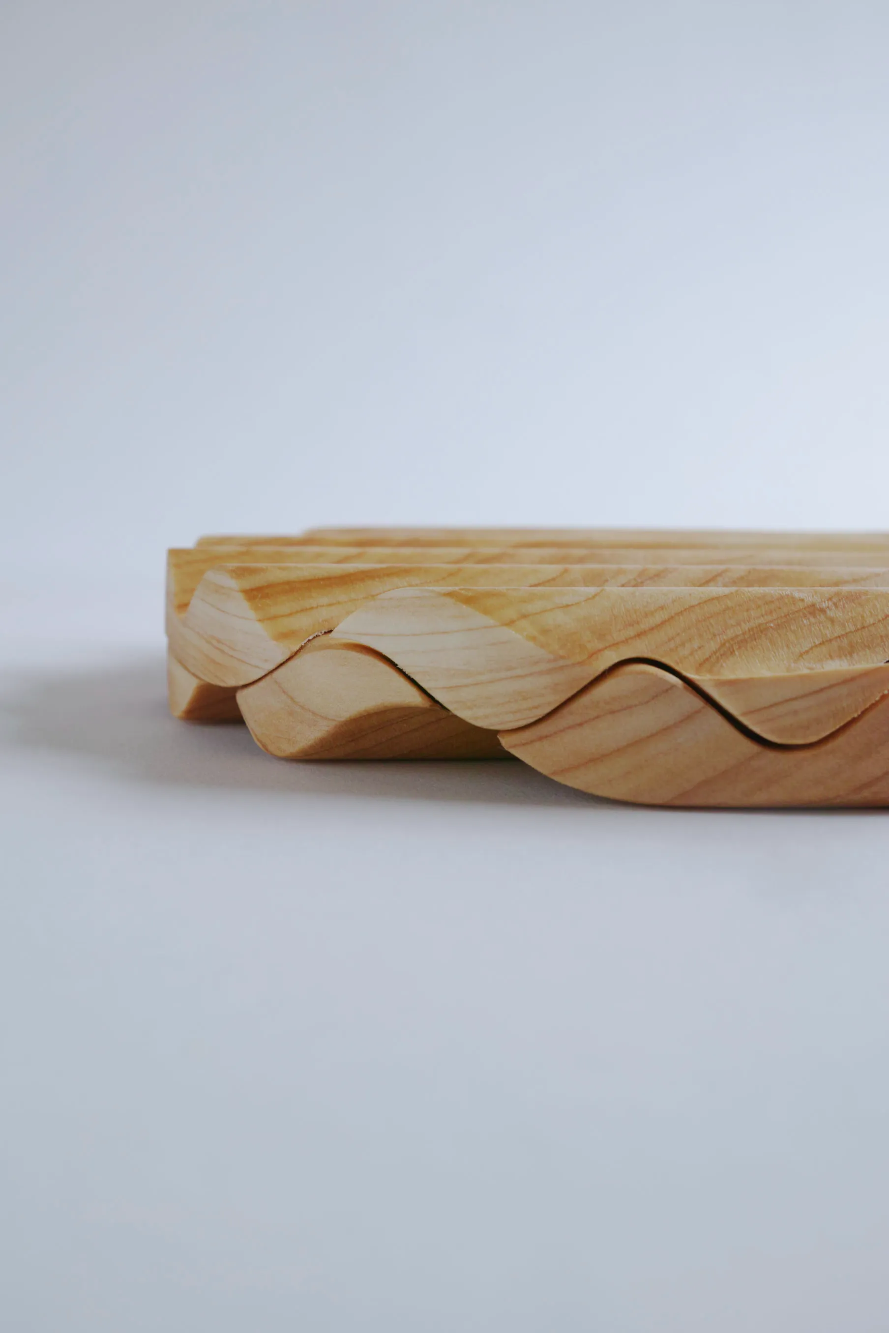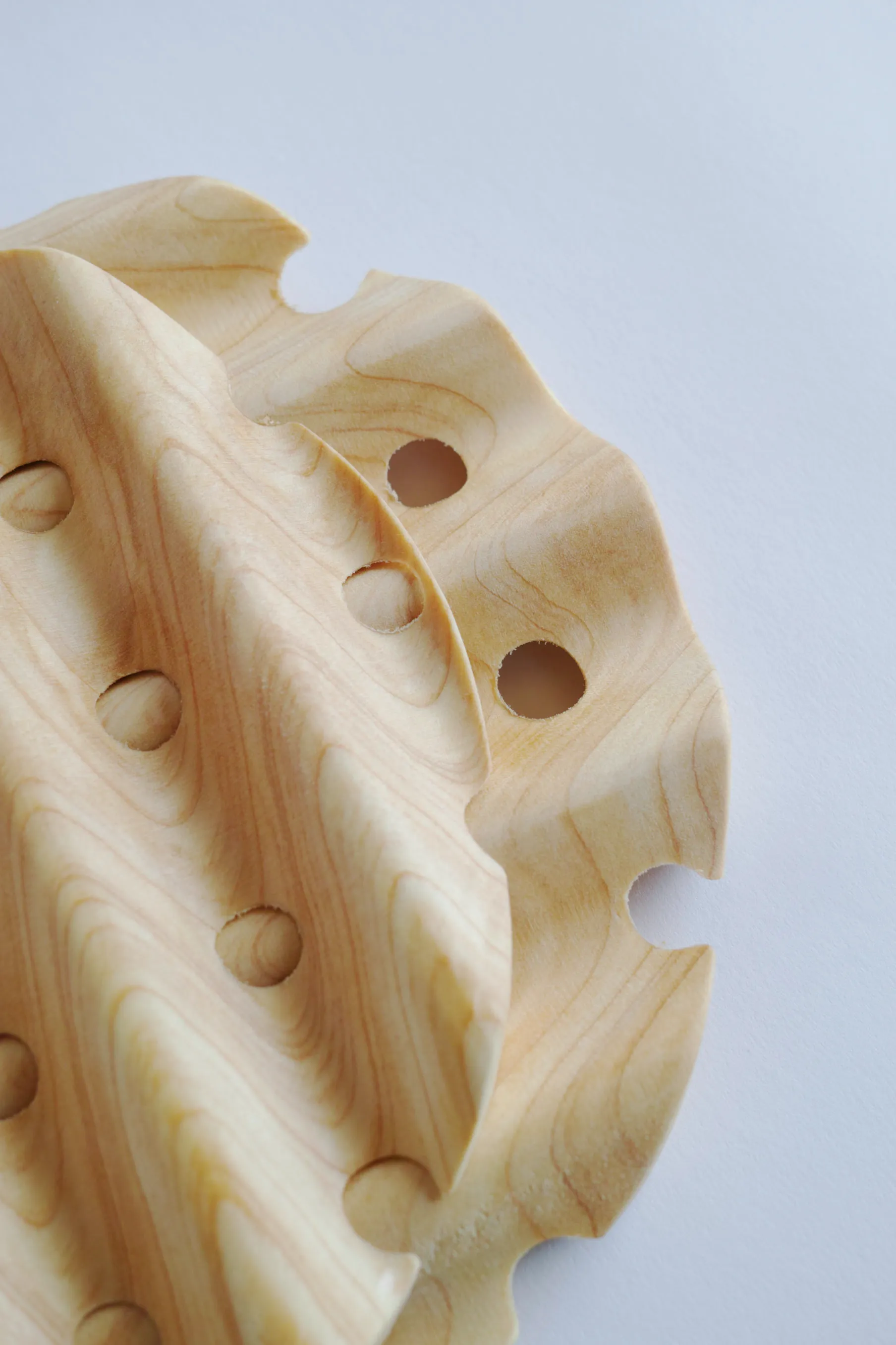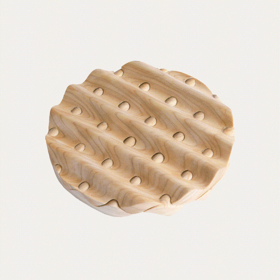 うさぎ堂が所有する5軸のNCルーターを使い、板の両面から波型の形状を削り出すことで生まれた、無限に広がる格子状のパターンをもった円形の板。「SURF」という名前は、波のような形状とその上に物が置かれている様子がサーフィンのように感じたことからつけた。