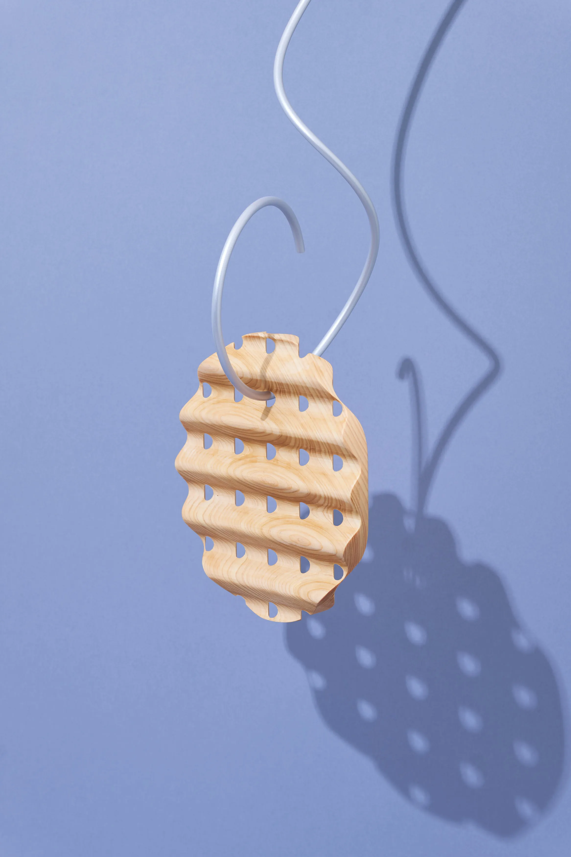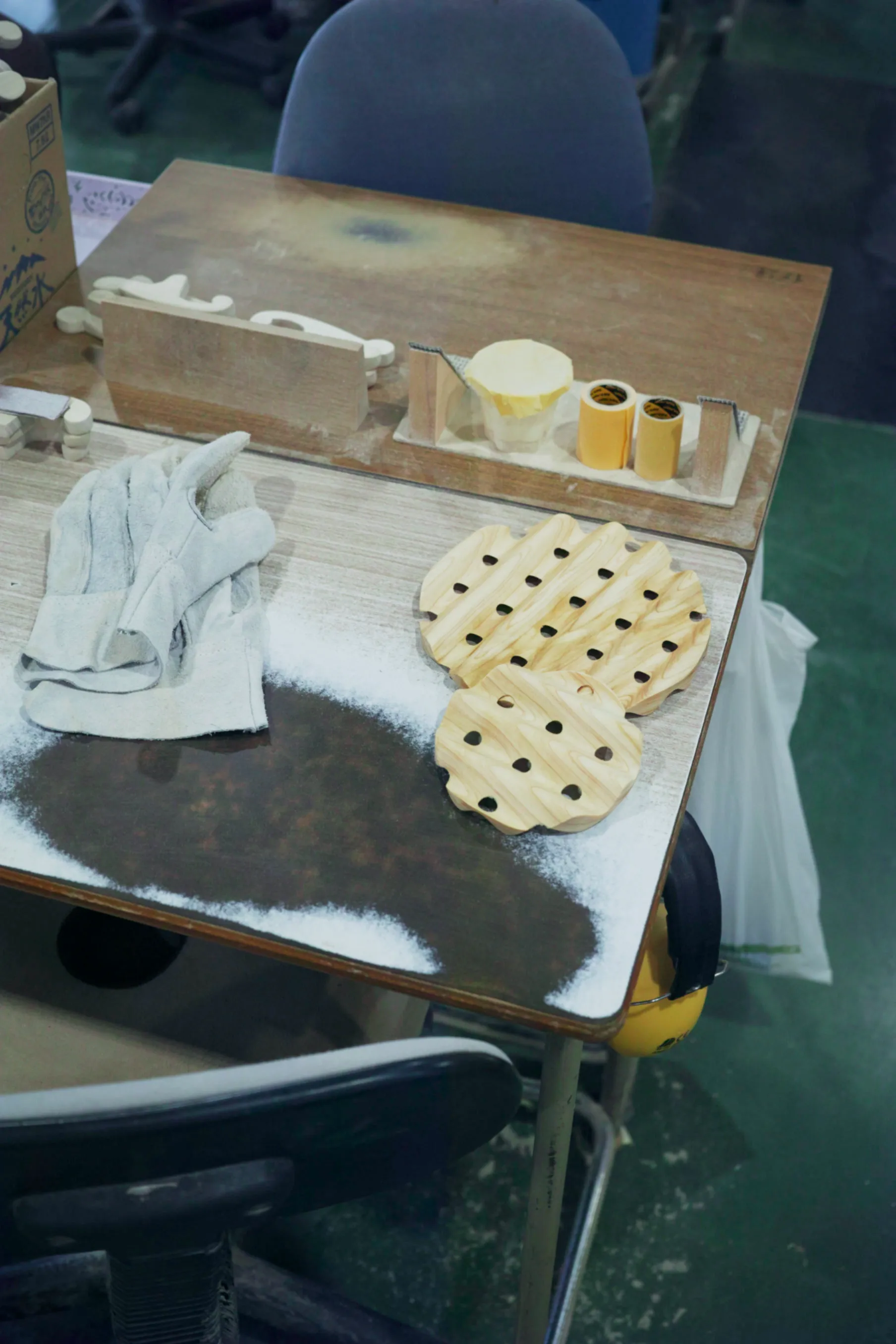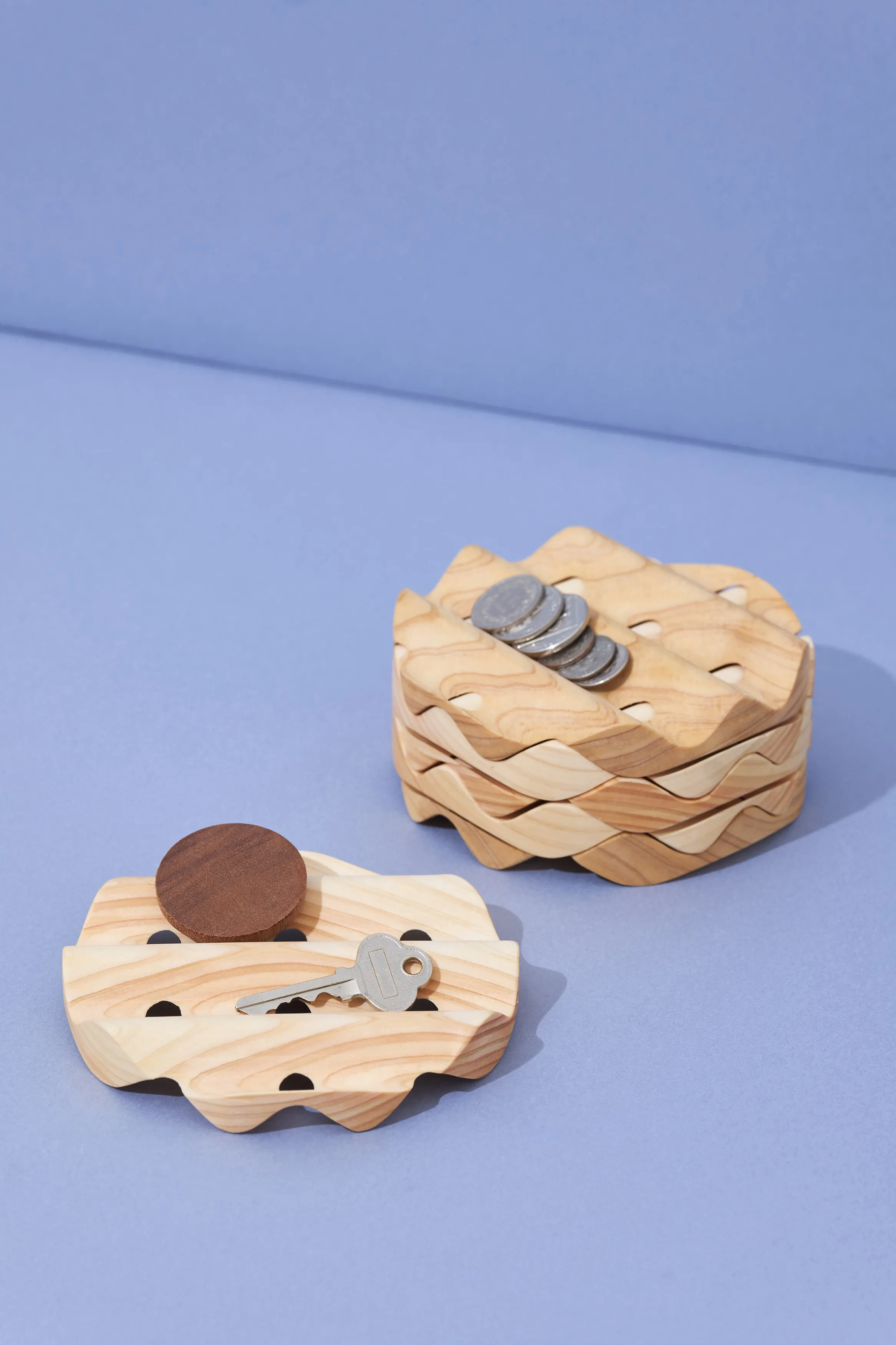 うさぎ堂が所有する5軸のNCルーターを使い、板の両面から波型の形状を削り出すことで生まれた、無限に広がる格子状のパターンをもった円形の板。「SURF」という名前は、波のような形状とその上に物が置かれている様子がサーフィンのように感じたことからつけた。