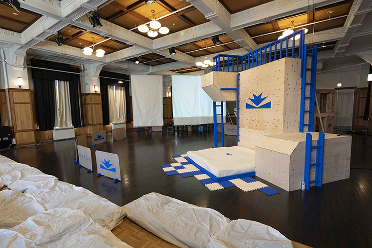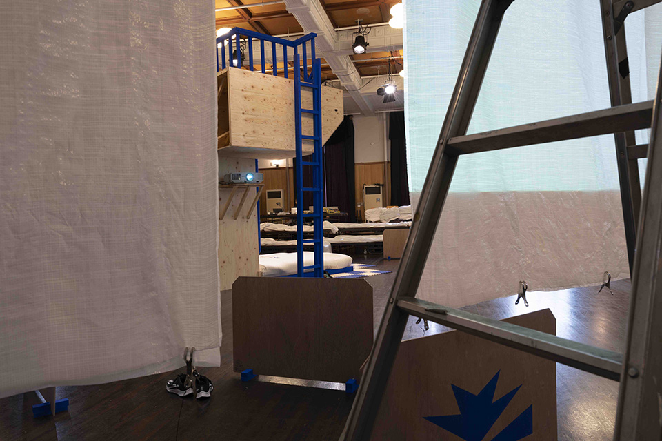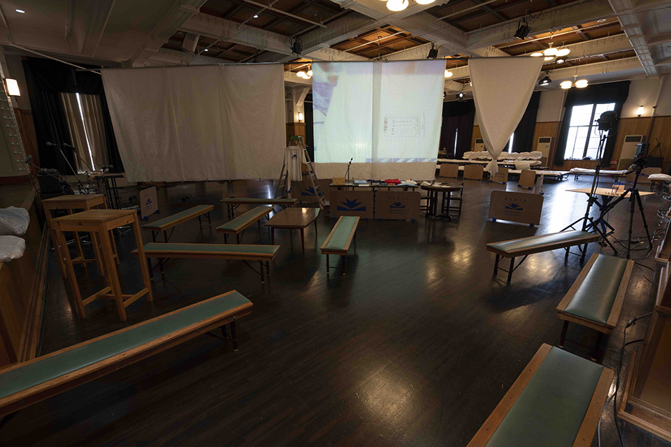 まず、方向性の強いワンルームの空間に斜めにスクリーンを配置し、ホワイエと舞台に空間を二分した。上演でプロジェクターで映像が写されるスクリーンは、エンディングにかけて束ねられ、終演後は空間が見通せるワンルームに戻る演出が加えられた。