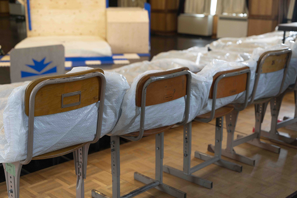 現代美術ギャラリー ANOMALY で行われた東京公演の舞台美術を、明治時代の建築空間である京都芸術センターに再インストールする空間設計。