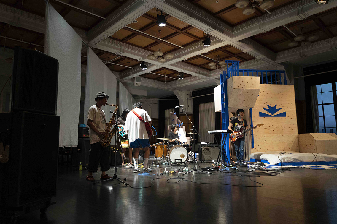 ニカサンの演劇は、役者の身振りやBGMの変化、3つのスケールの行き来などにより多層的にできている。観客数が当日まで未定であることから調整がきくように座布団が用意されたが、スクリーンと同様養生シートで包み、観客に対して少しの動きで音が出てしまうことによる緊張感を与えた。