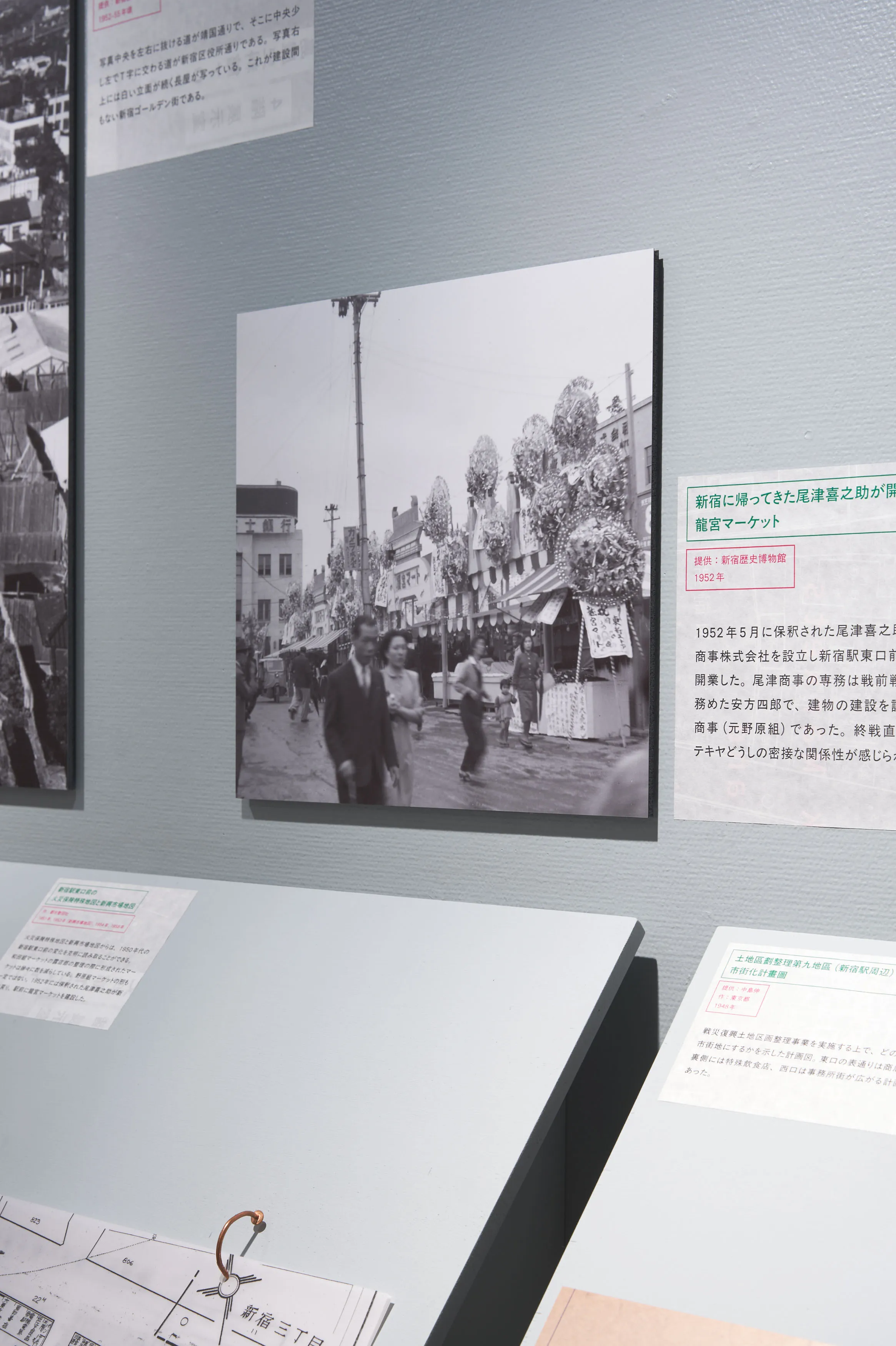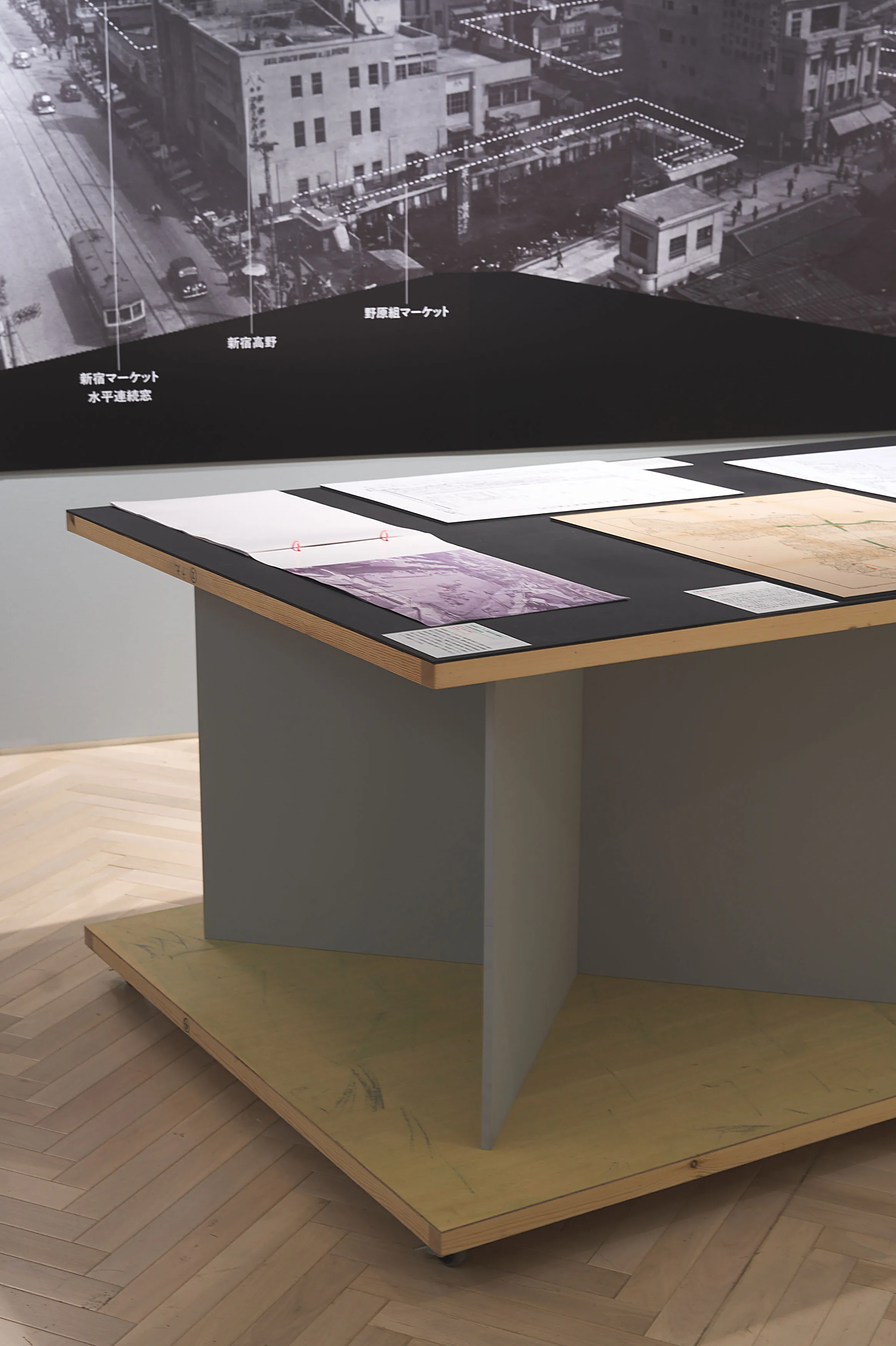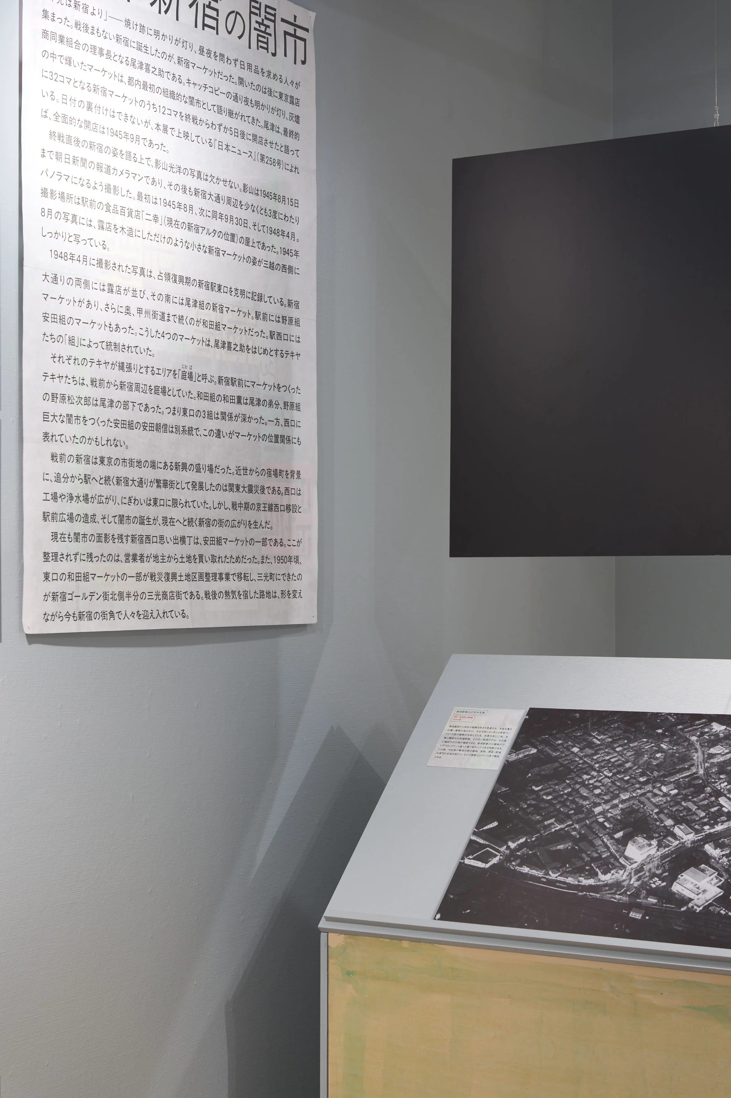 戦後闇市の持つ「不法占拠」というイメージを、大きな地図や当時のカラー写真などによって、必然の産物として描きなおして現在の都市空間と紐付ける内容。さまざまな形式のメディウムをフラットに並べることで浮かび上がる事物の関係性を、角度の異なる什器によって、鑑賞者が主体的に情報を結びつけることを目指した。