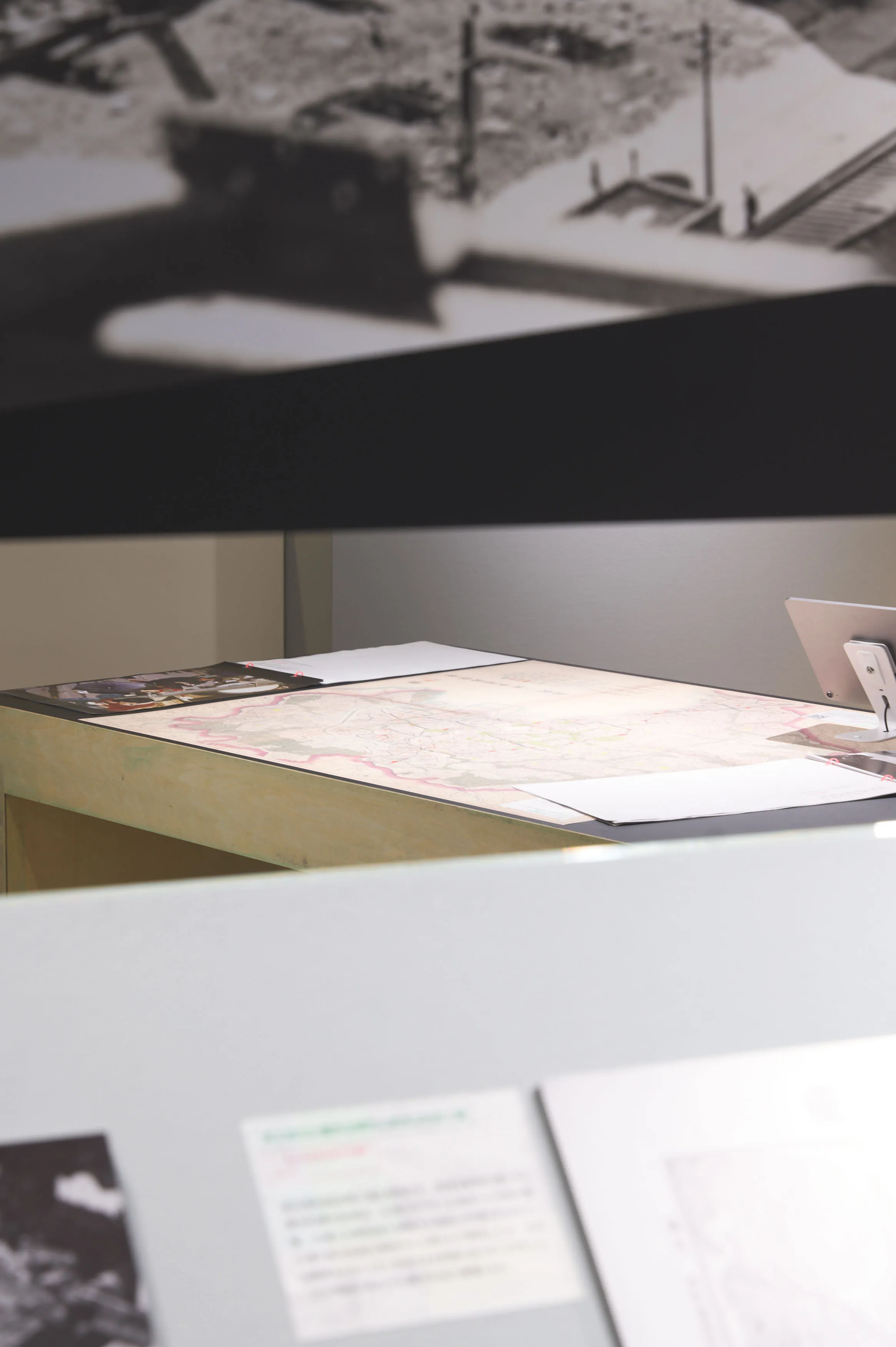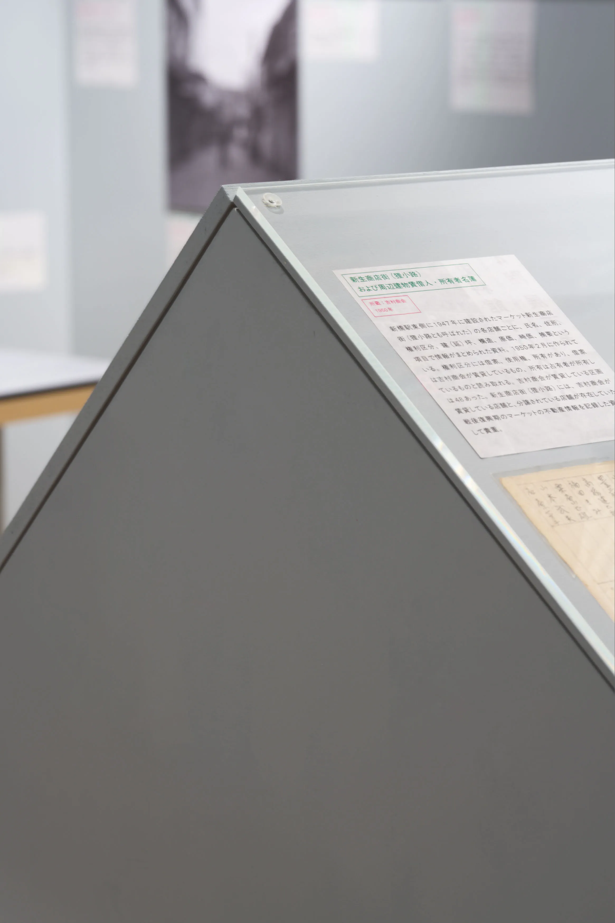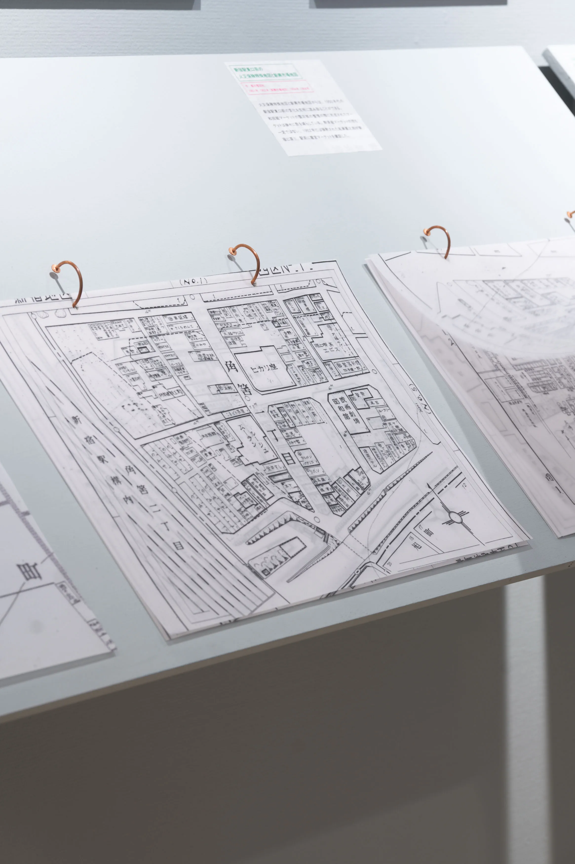 戦後闇市の持つ「不法占拠」というイメージを、大きな地図や当時のカラー写真などによって、必然の産物として描きなおして現在の都市空間と紐付ける内容。さまざまな形式のメディウムをフラットに並べることで浮かび上がる事物の関係性を、角度の異なる什器によって、鑑賞者が主体的に情報を結びつけることを目指した。