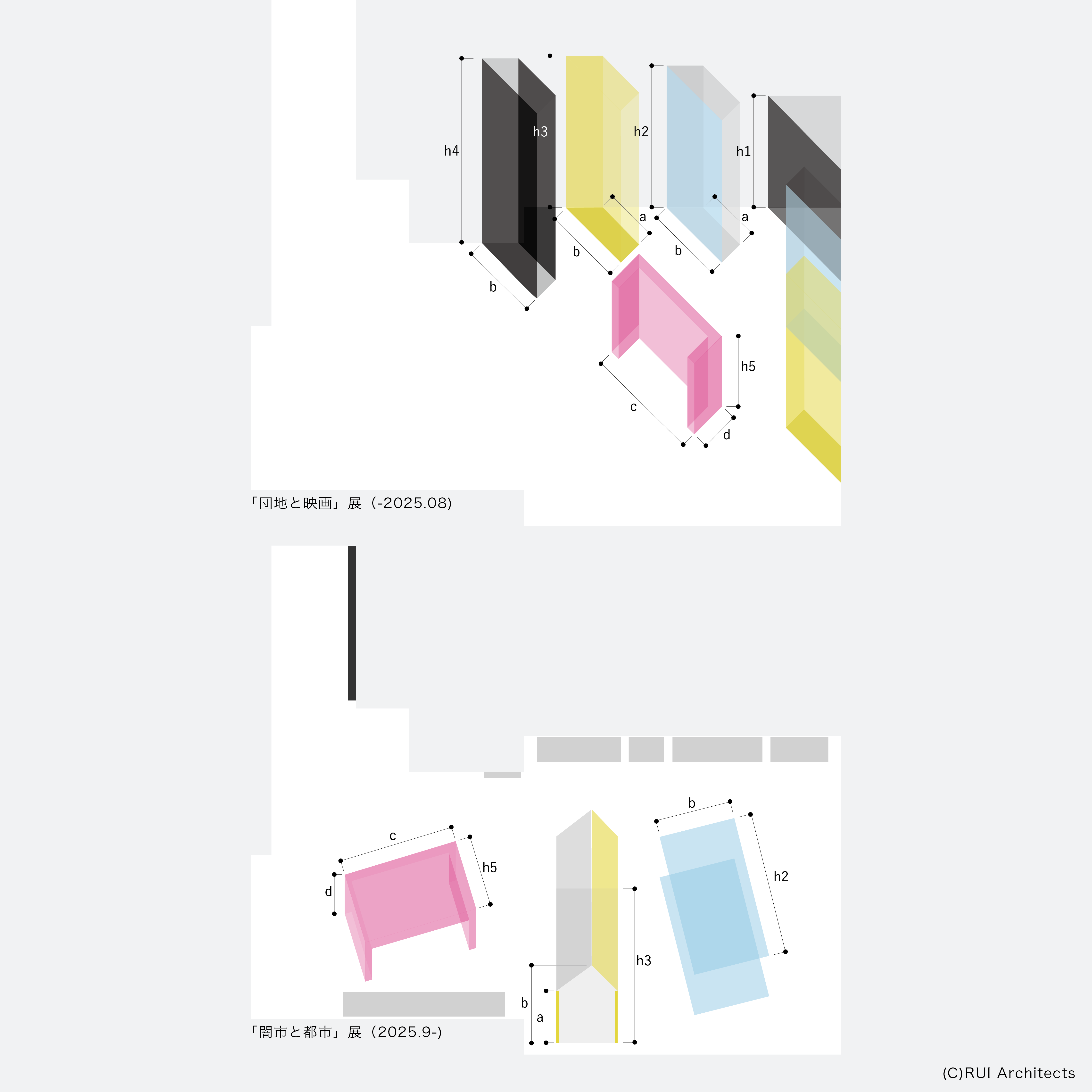 集中力が必要な資料展示において視線の動きは首をはじめ、鑑賞する身体に影響する。什器に用いられた「斜め」は、前回の展示「団地と映画」展で使用された造作の形状から生まれている。すでにある空間(路上や居抜きの部屋)に対して最低限の什器を持ち寄って構成されていた闇市に倣って、身近なものから空間を構成した。